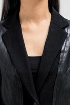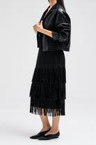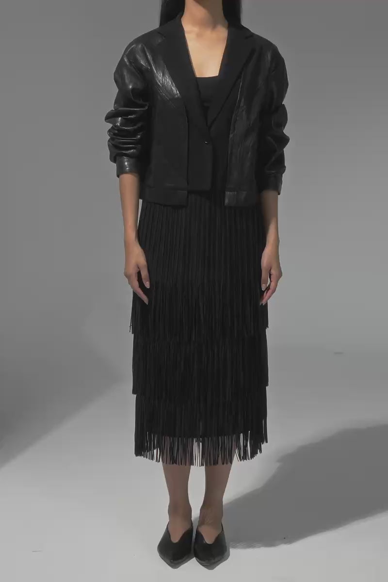 A sleek cropped leather jacket featuring a structured blazer-style collar that adds a refined edge to its modern silhouette. Designed for a statement look, it blends the polish of a blazer with the boldness of leather.