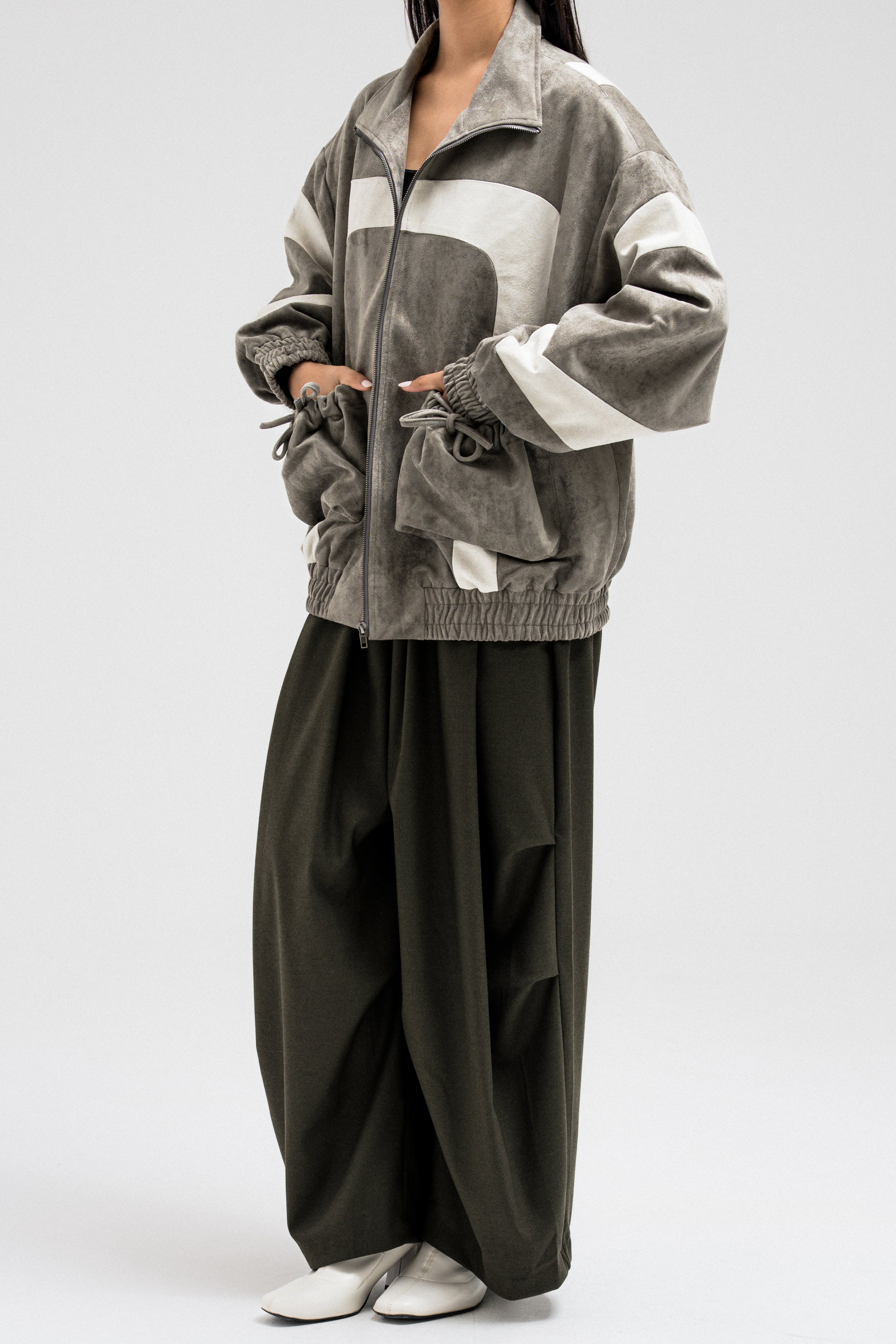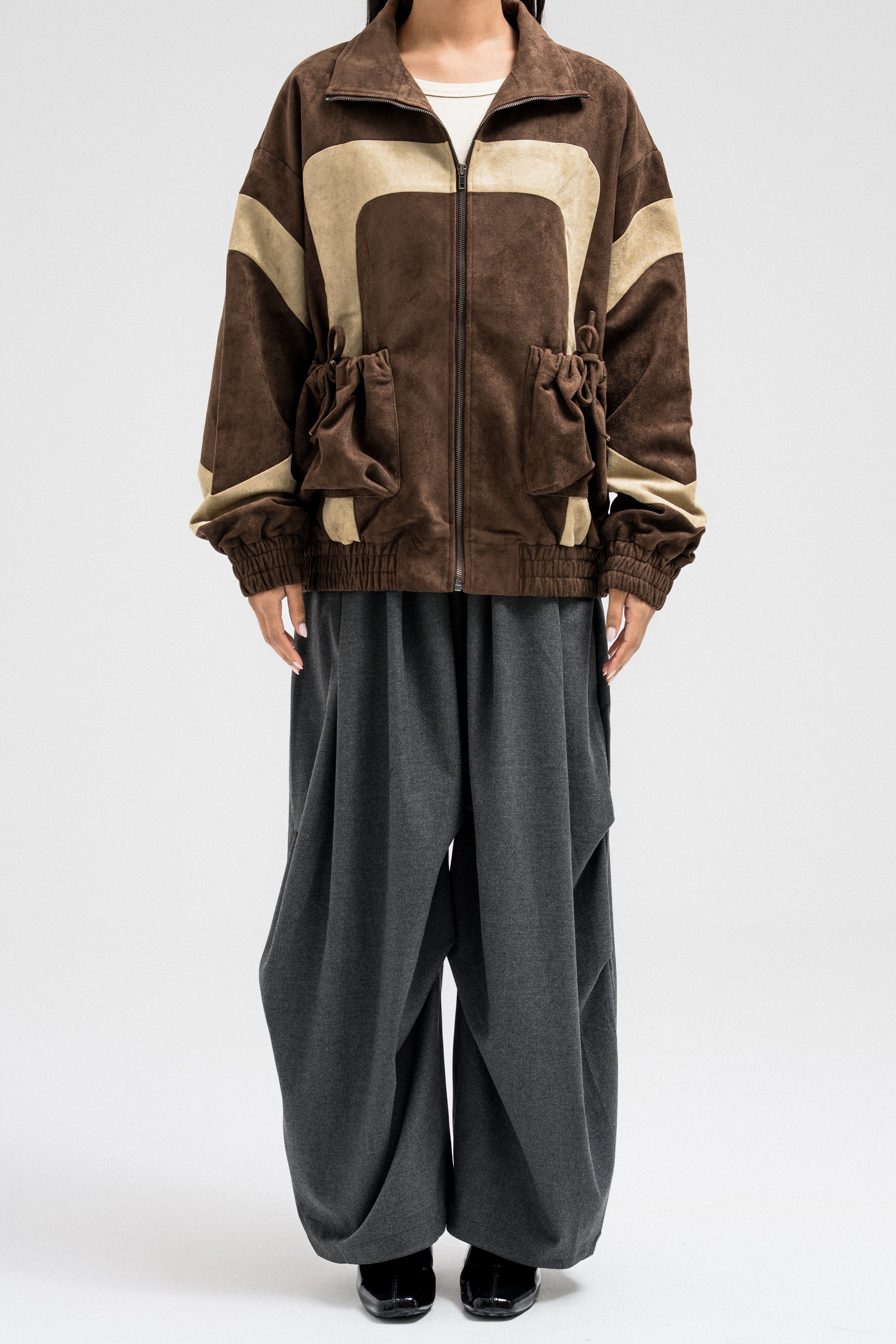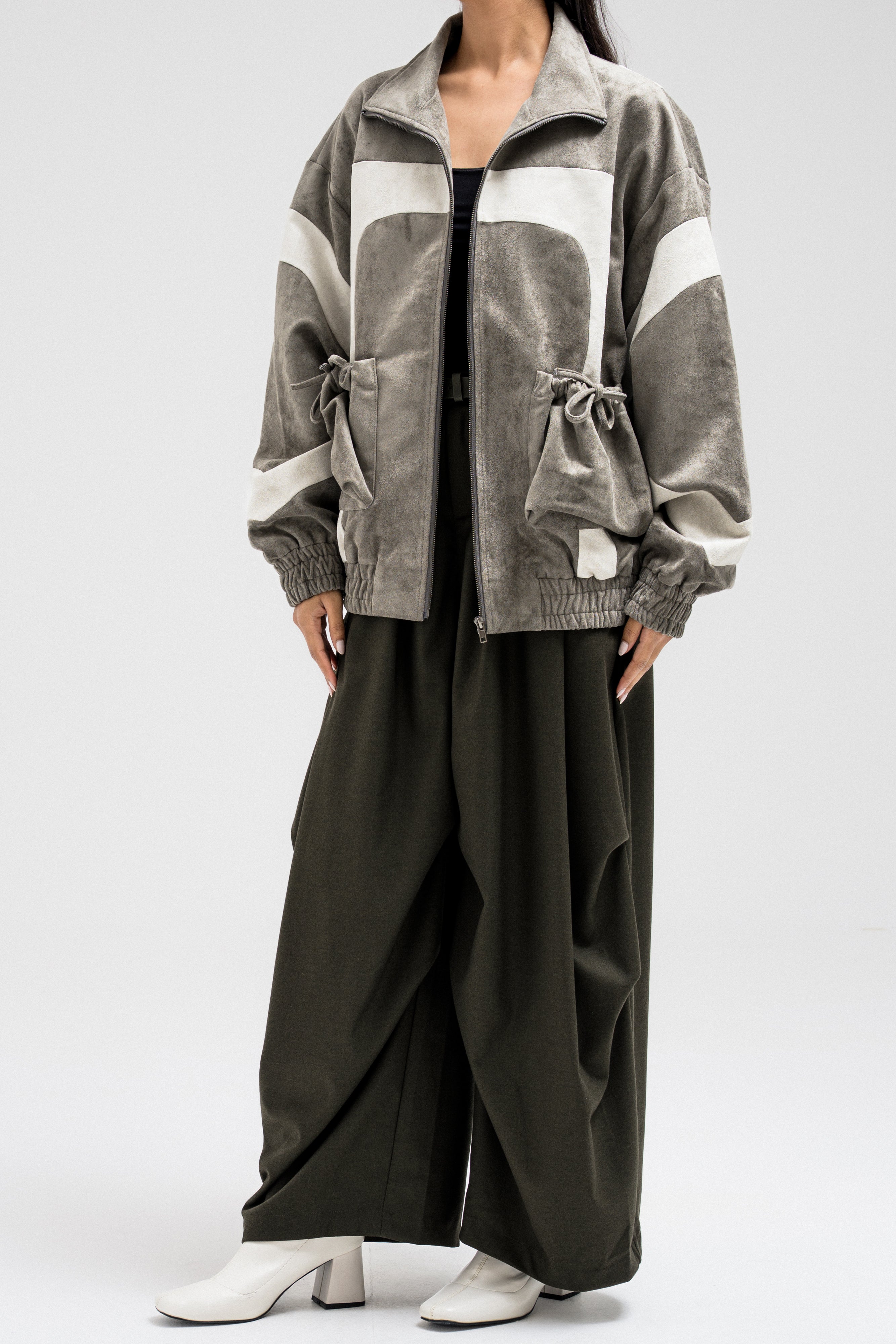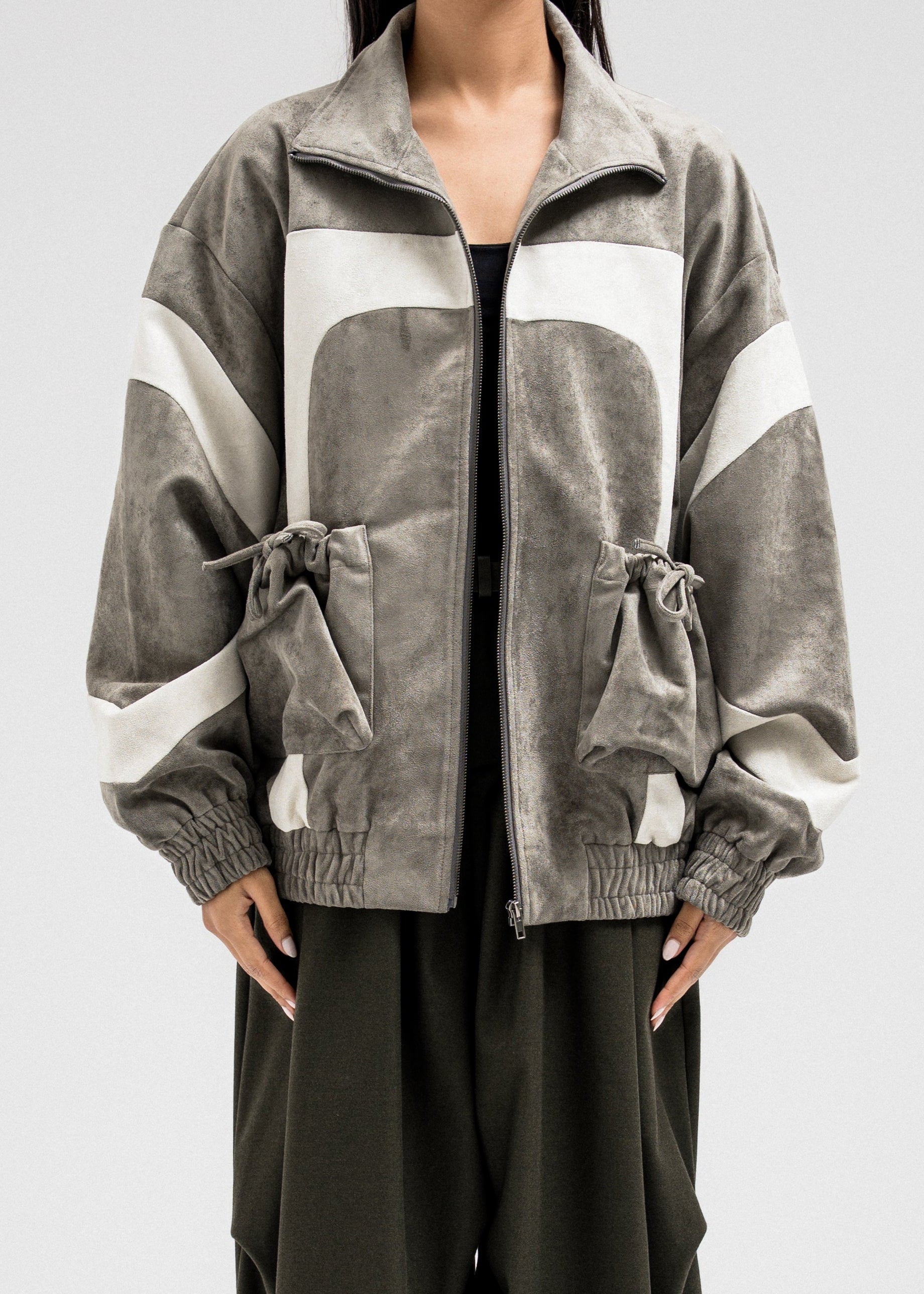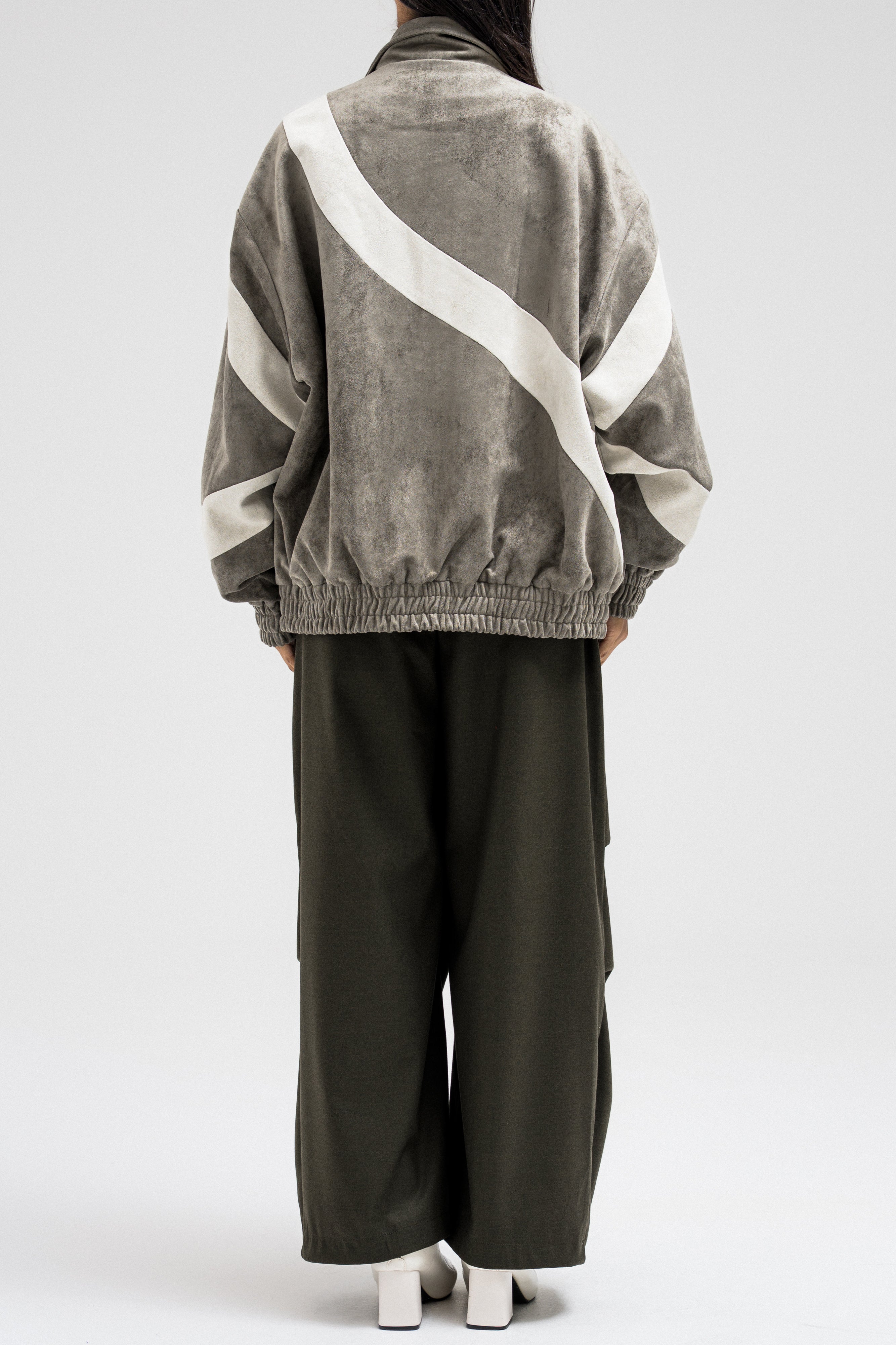 Sporty yet chic suede bomber jacket featuring a contrasting white line design. Detailed with a front zipper closure, side pockets, elastic cuffs, and an elastic hem for a comfortable fit. A perfect blend of casual and elevated style.