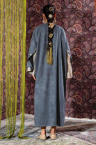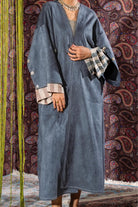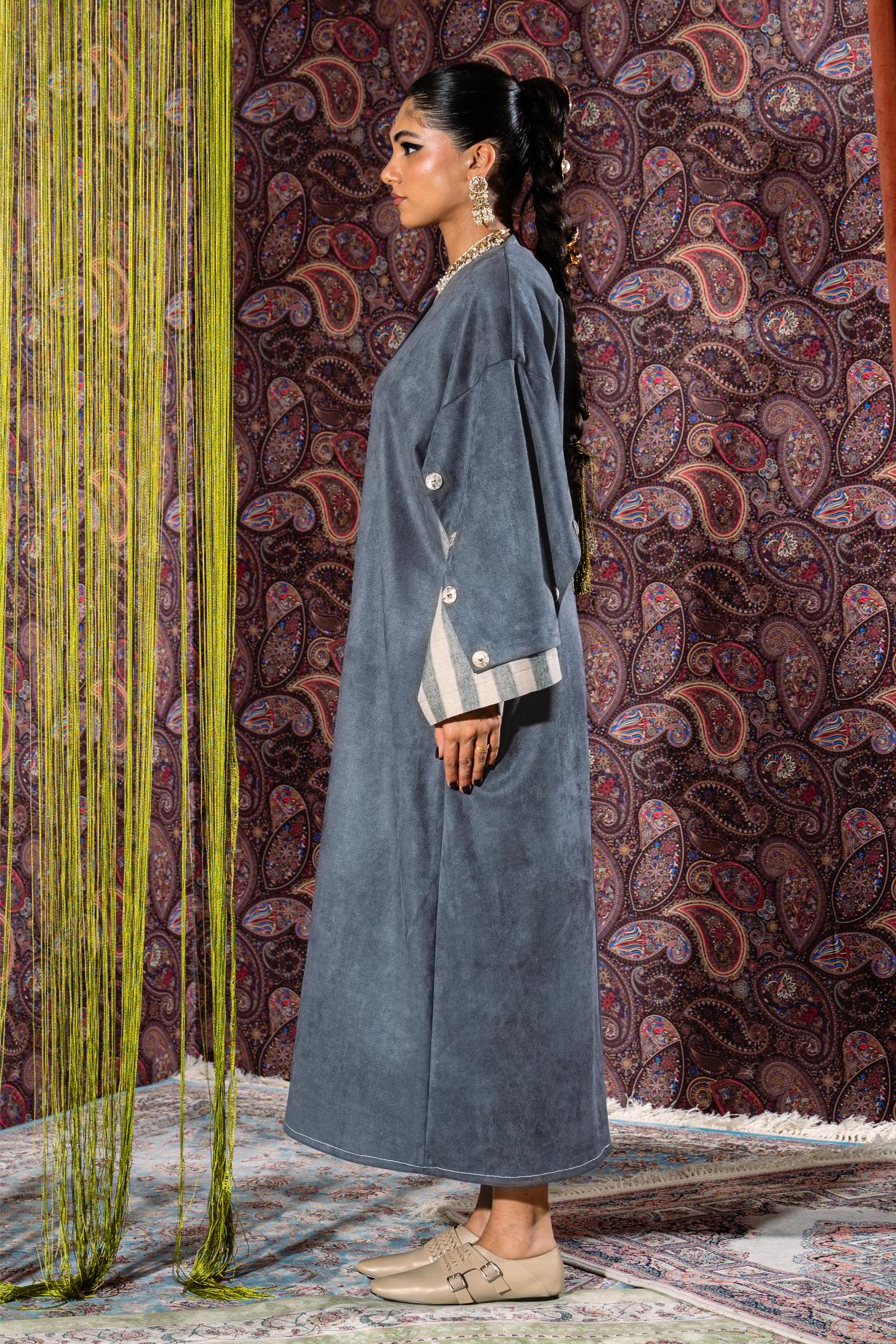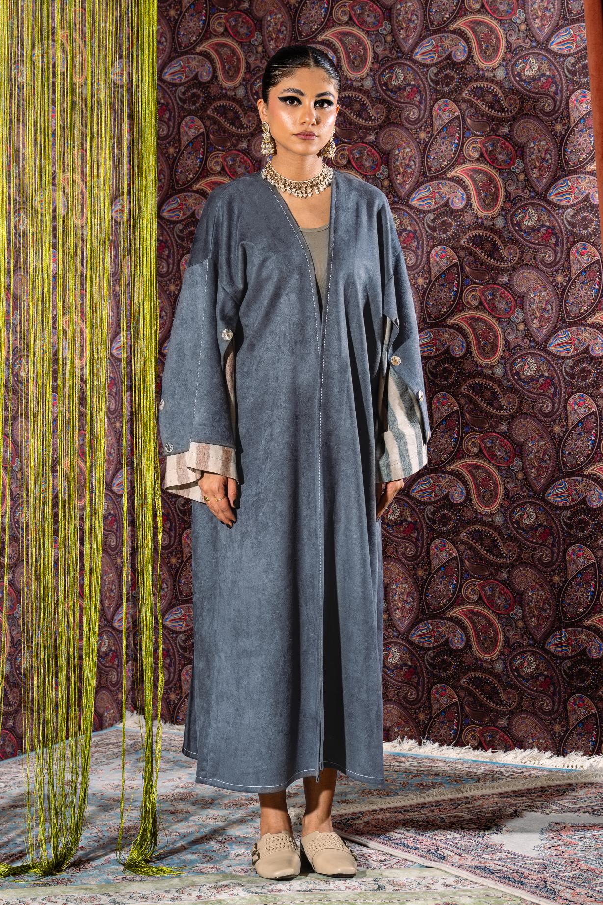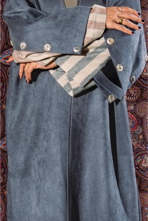Crafted from soft suede material, this elegant bisht features a clean, flowing silhouette that drapes effortlessly over the body. The standout detail lies in the cuffs, where a contrasting striped fabric is revealed, adding depth and a subtle statement to the design. Finished with large decorative buttons along the sleeves, the piece blends traditional bisht inspiration with a modern touch. Versatile and refined, it can be styled effortlessly over dresses, pants, or skirts to complete a polished, layered look suitable for both casual and elevated occasions.