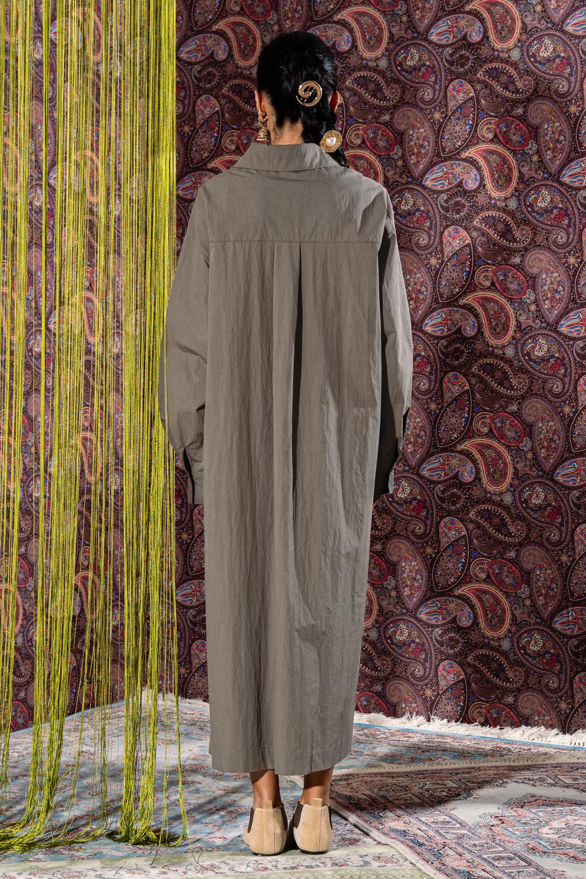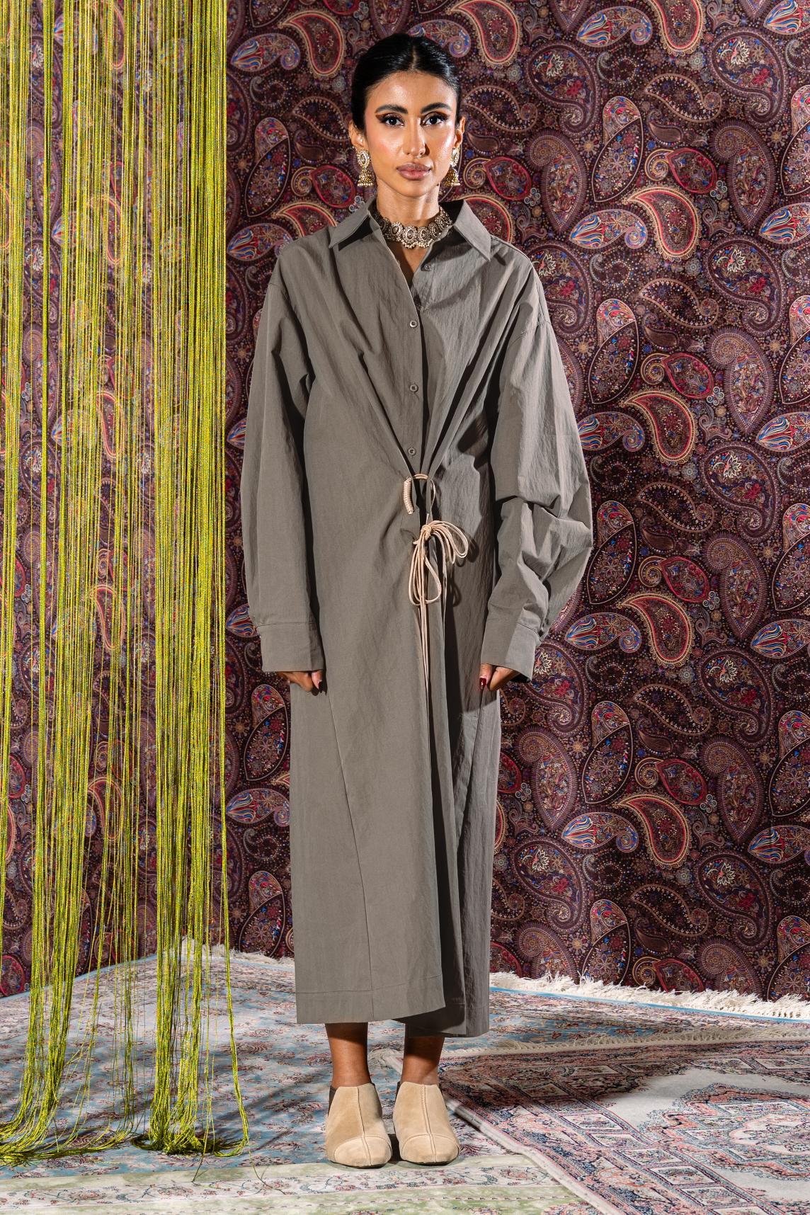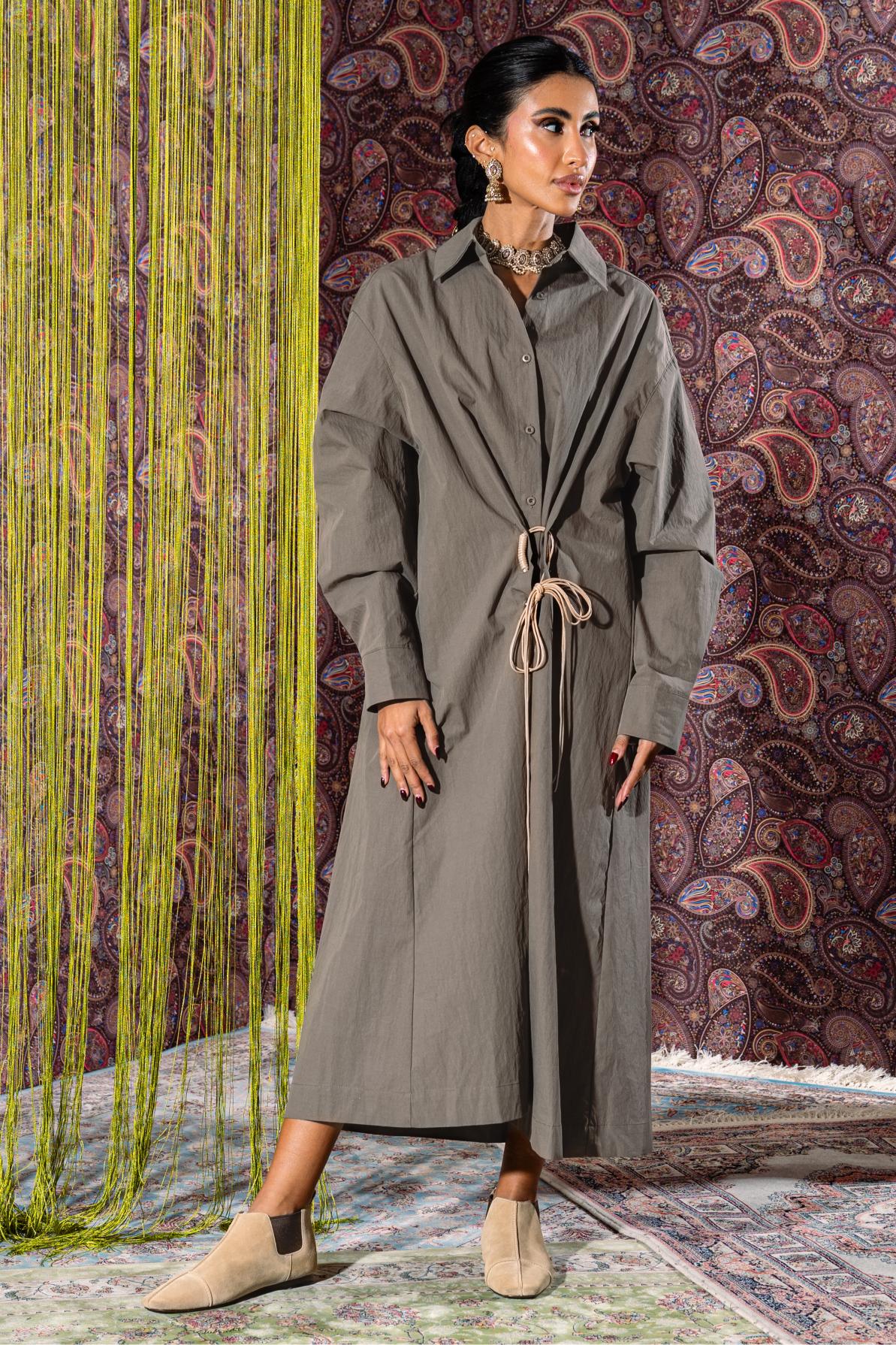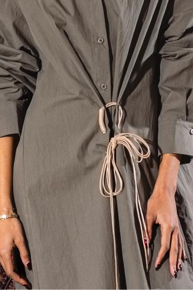 A chic shirt-style dress designed with a clean button-down front and a soft collar for a polished finish. It features a built-in tie-waist detail that cinches the silhouette effortlessly, adding shape while keeping the look relaxed. Perfect for everyday wear or styled up with boots for a modern, minimal outfit.
