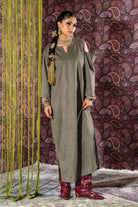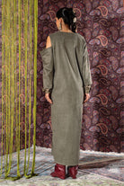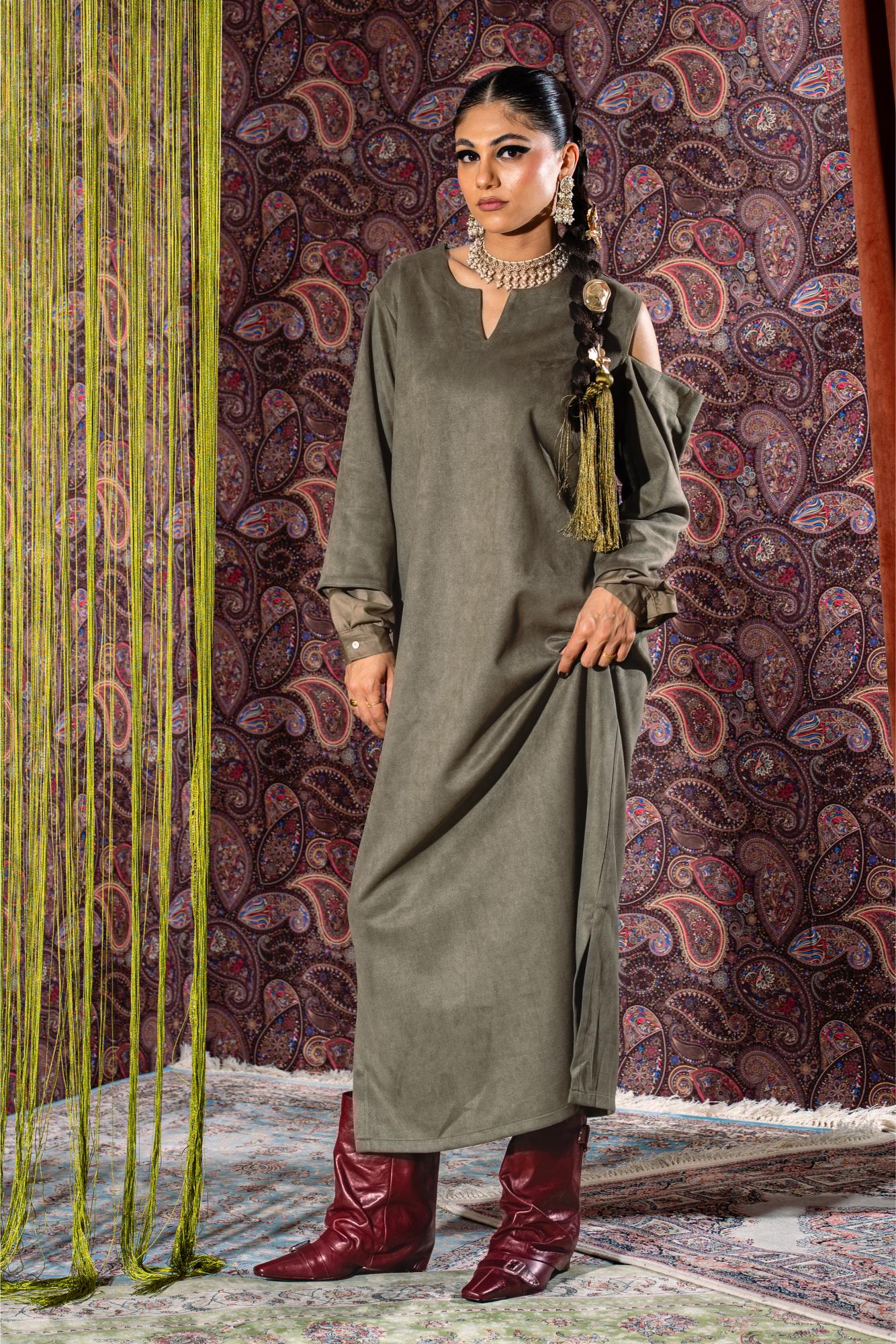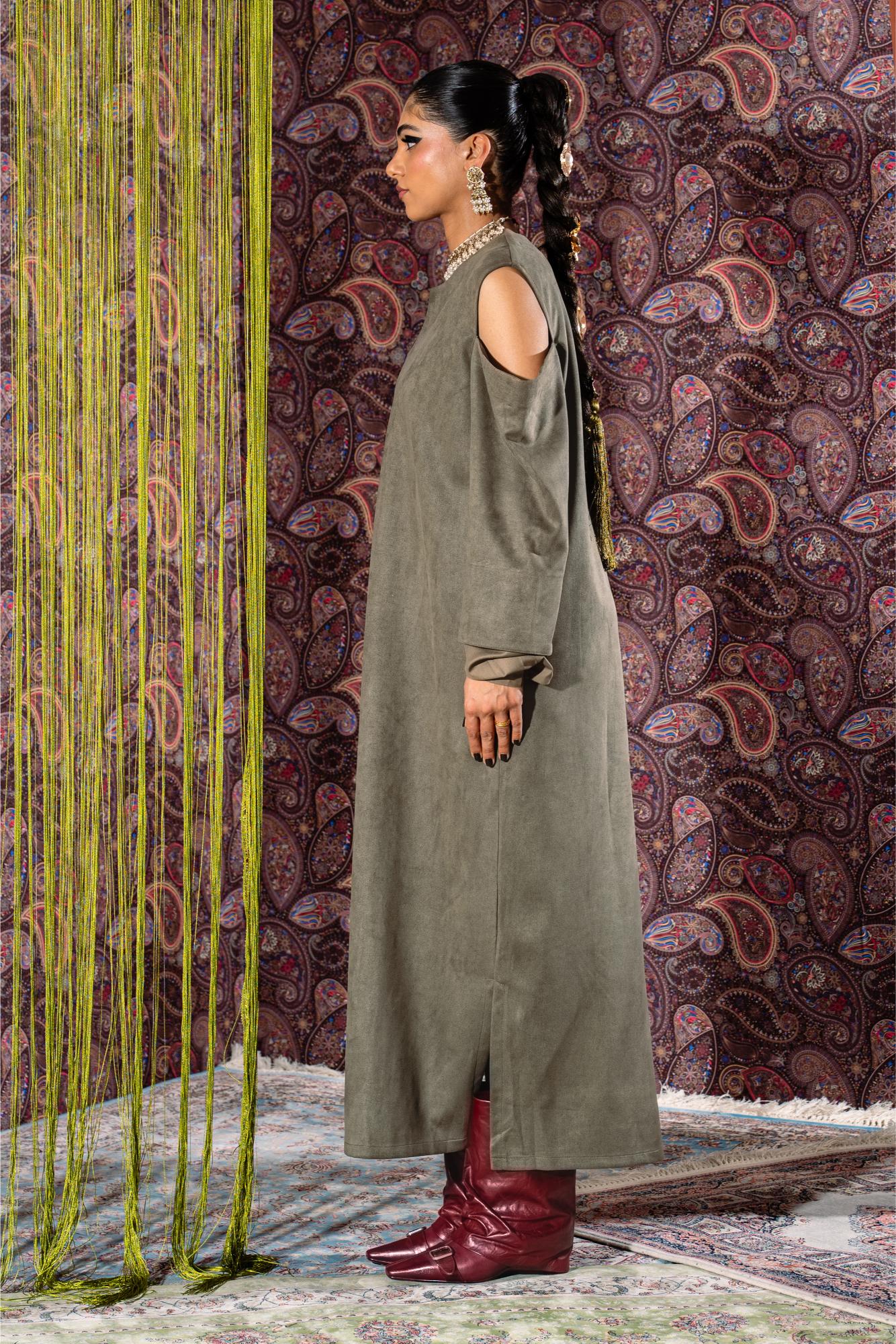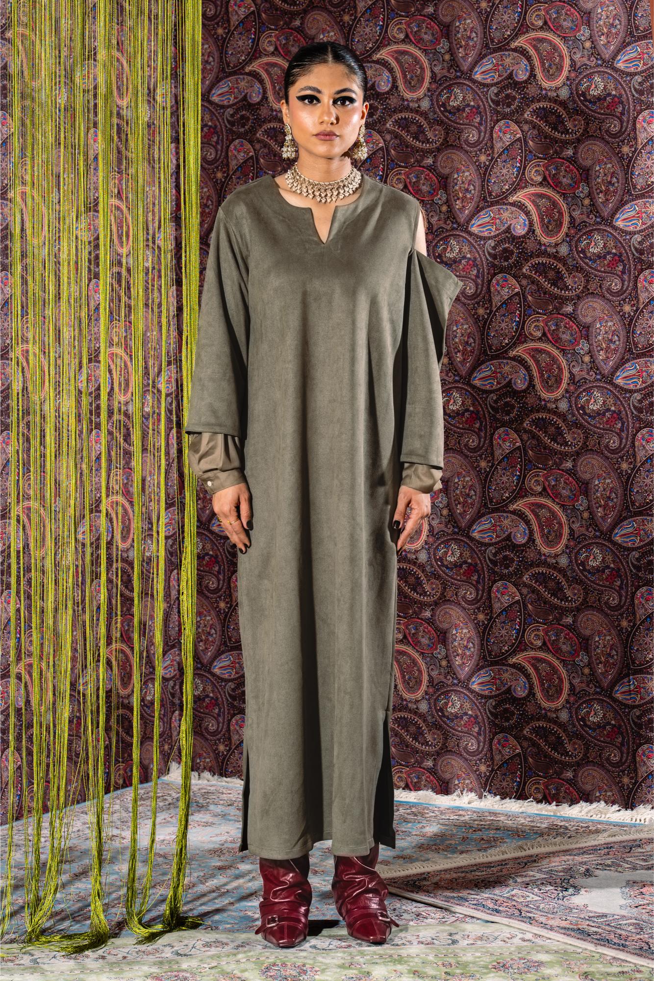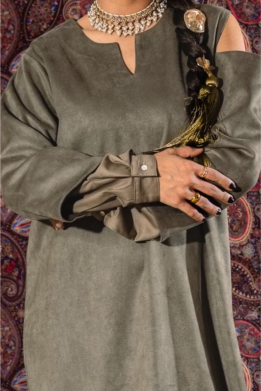 Crafted from soft suede material, this elegant dress features a unique layered sleeve design that blends structure with fluidity. The long outer sleeves are complemented by an inner shirt-style sleeve underneath, creating a refined double-sleeve effect. One side is designed with an open-shoulder detail, adding a modern and unexpected touch. The collar is clean and minimal, enhancing the dress’s sophisticated silhouette. Finished with side hem slits on both sides for ease of movement and a graceful flow.