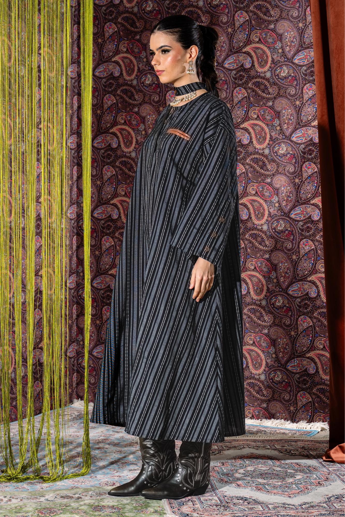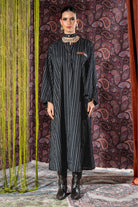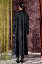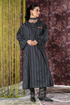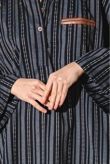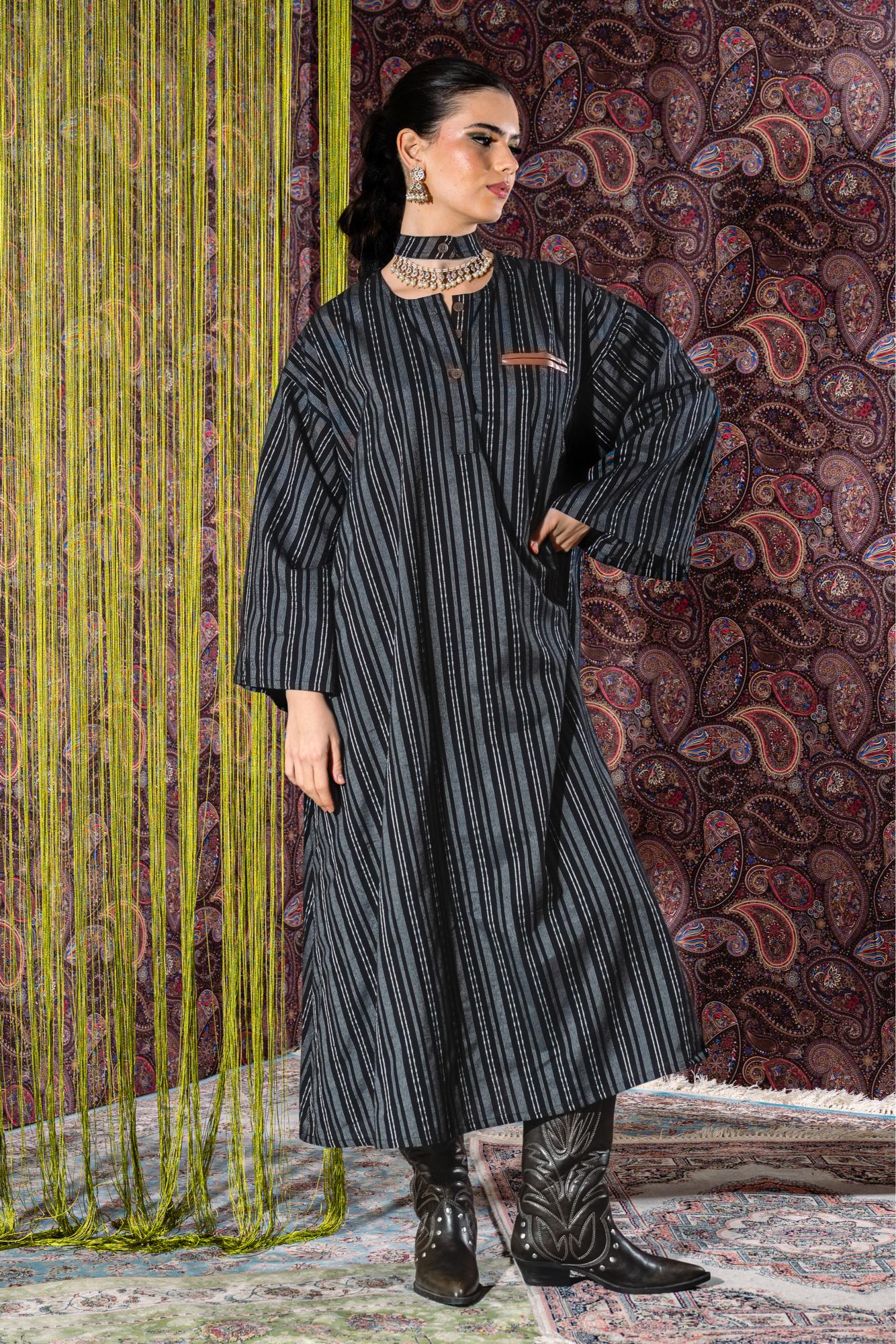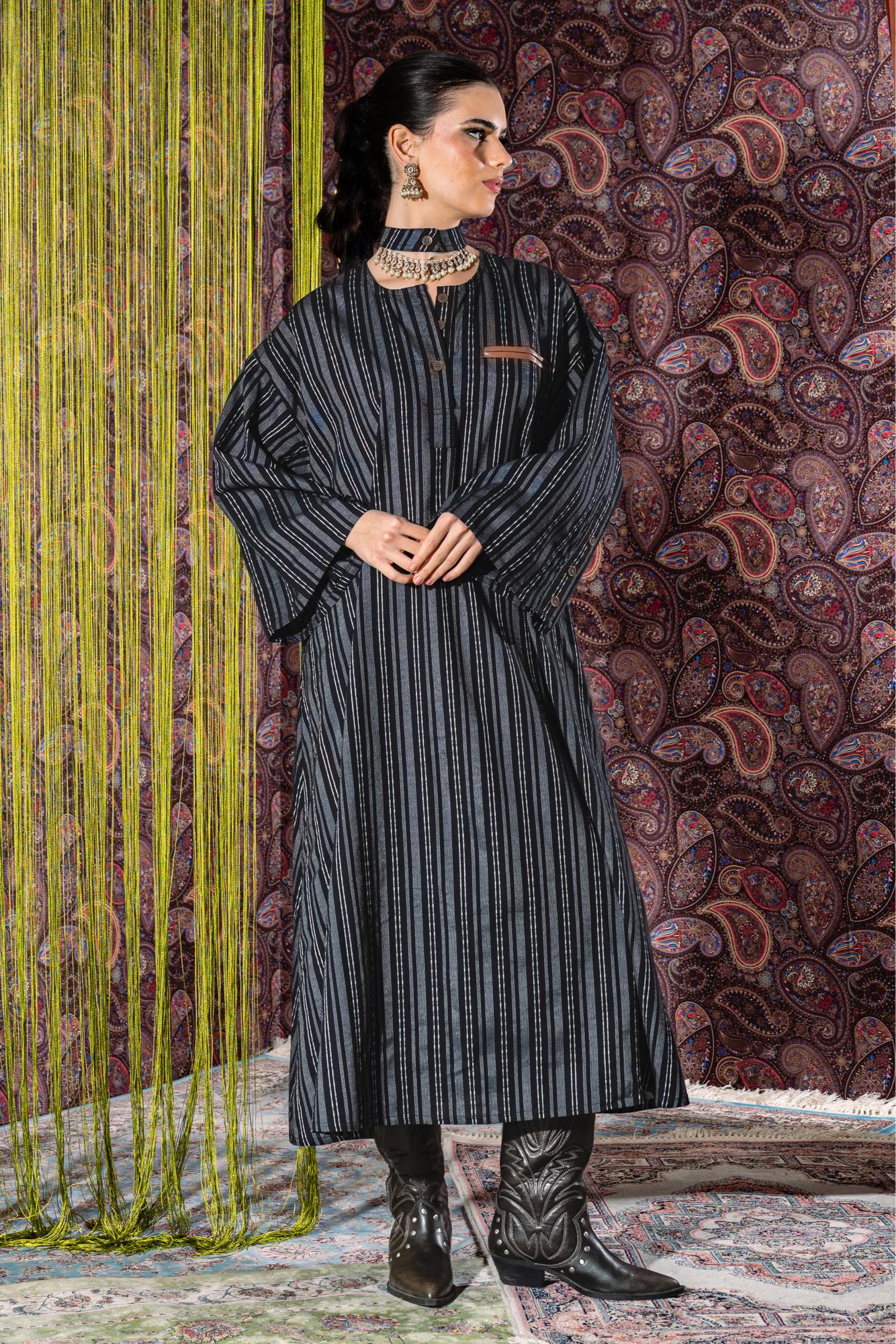This elegant kaftan features a refined vertical stripe design that elongates the silhouette and adds a modern, structured feel. The standout detail is the matching attached collar, seamlessly integrated into the neckline for a polished, cohesive look. Designed with a half button-front closure, it offers both ease and styling versatility. A subtle leather-lined pocket adds a contemporary contrast and functional touch, elevating the overall design. Effortless yet distinctive, this kaftan blends traditional flow with modern detailing for a statement look.