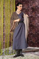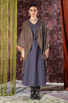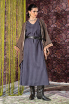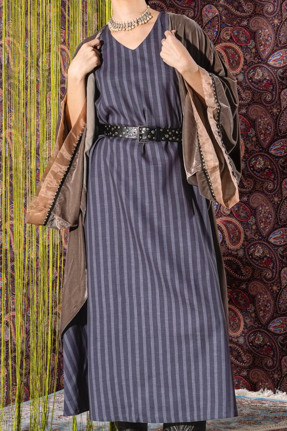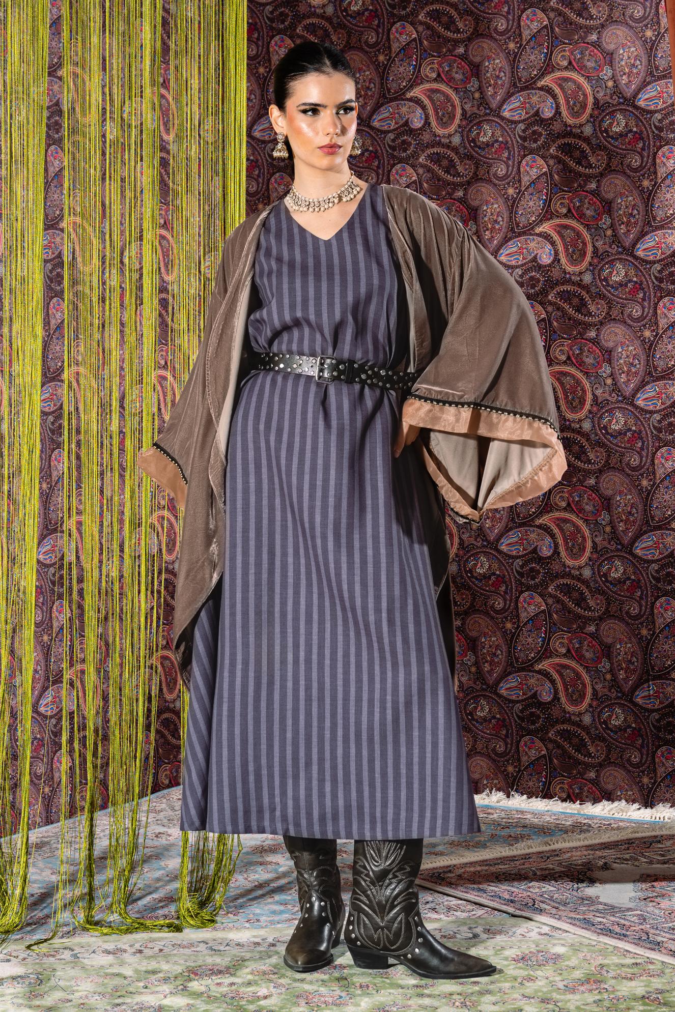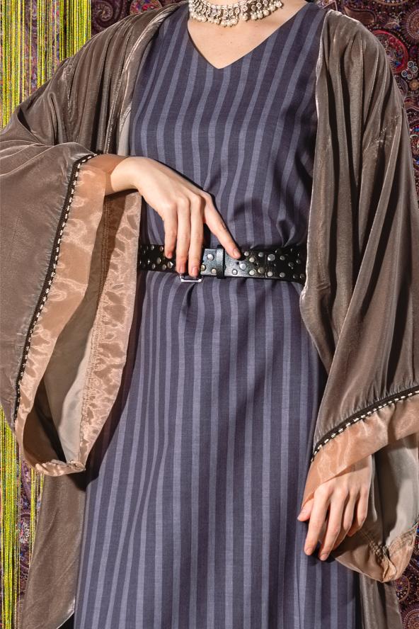 This elegant kaftan set is designed to be worn together for a complete look. The outer layer features a soft, draped silhouette with a luxurious sheen and fluid sleeves that create a graceful fall. Underneath, the set includes a sleeveless, wide-cut striped dress that adds structure and movement. The look is finished with a statement studded belt.