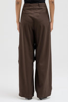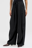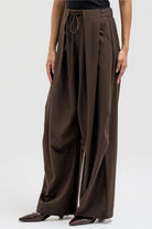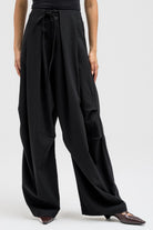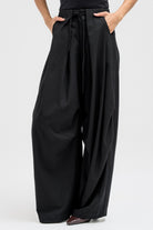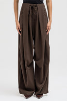 Elegant yet relaxed, these pants feature a soft draped silhouette with subtle pleating for a fluid, elongated look. Designed with adjustable drawstrings to customize the fit and create gentle gathers along the waistline. Finished with a metal clasp and zipper closure, blending functionality with a refined, modern edge. Perfect for pairing with structured tops or effortless layers.