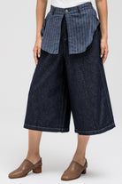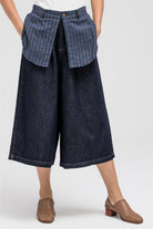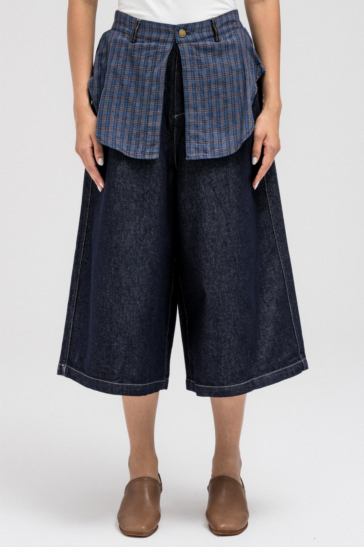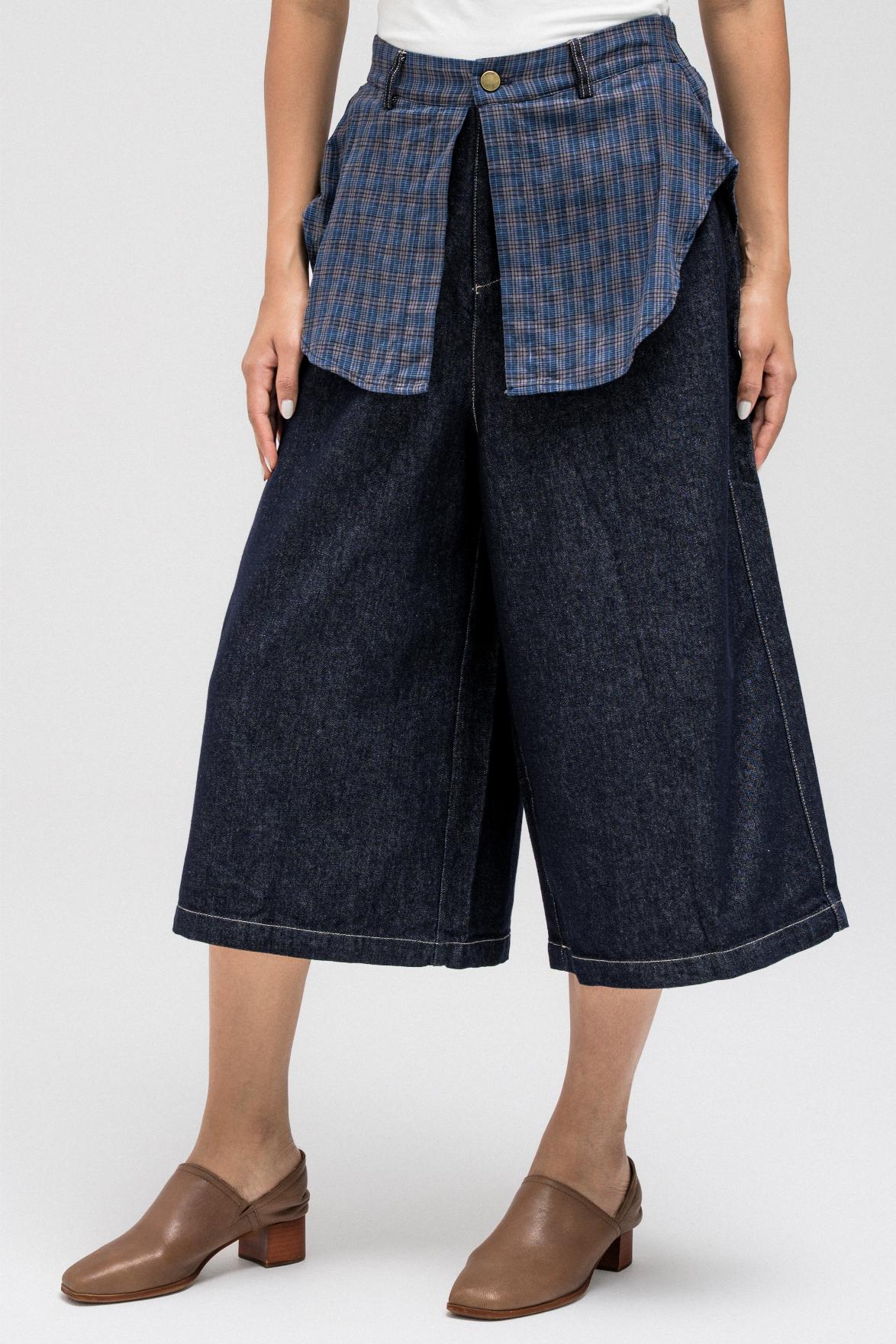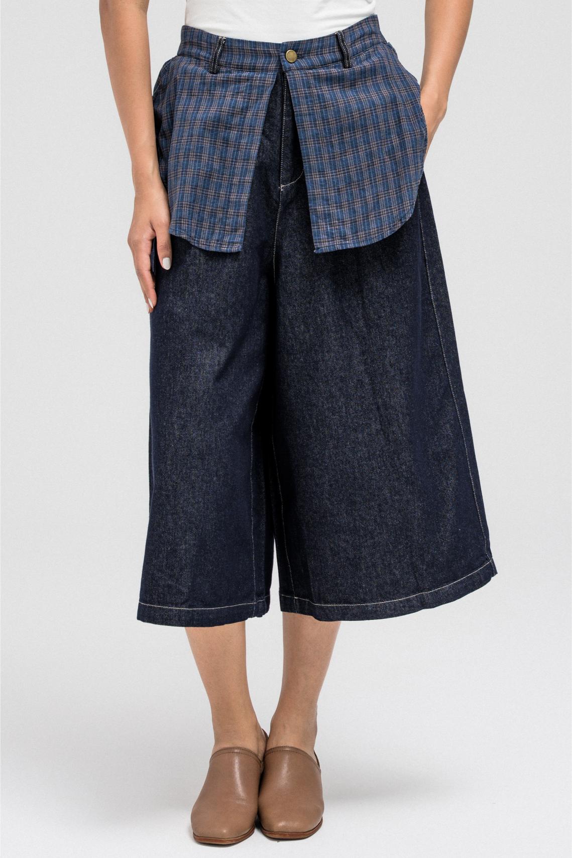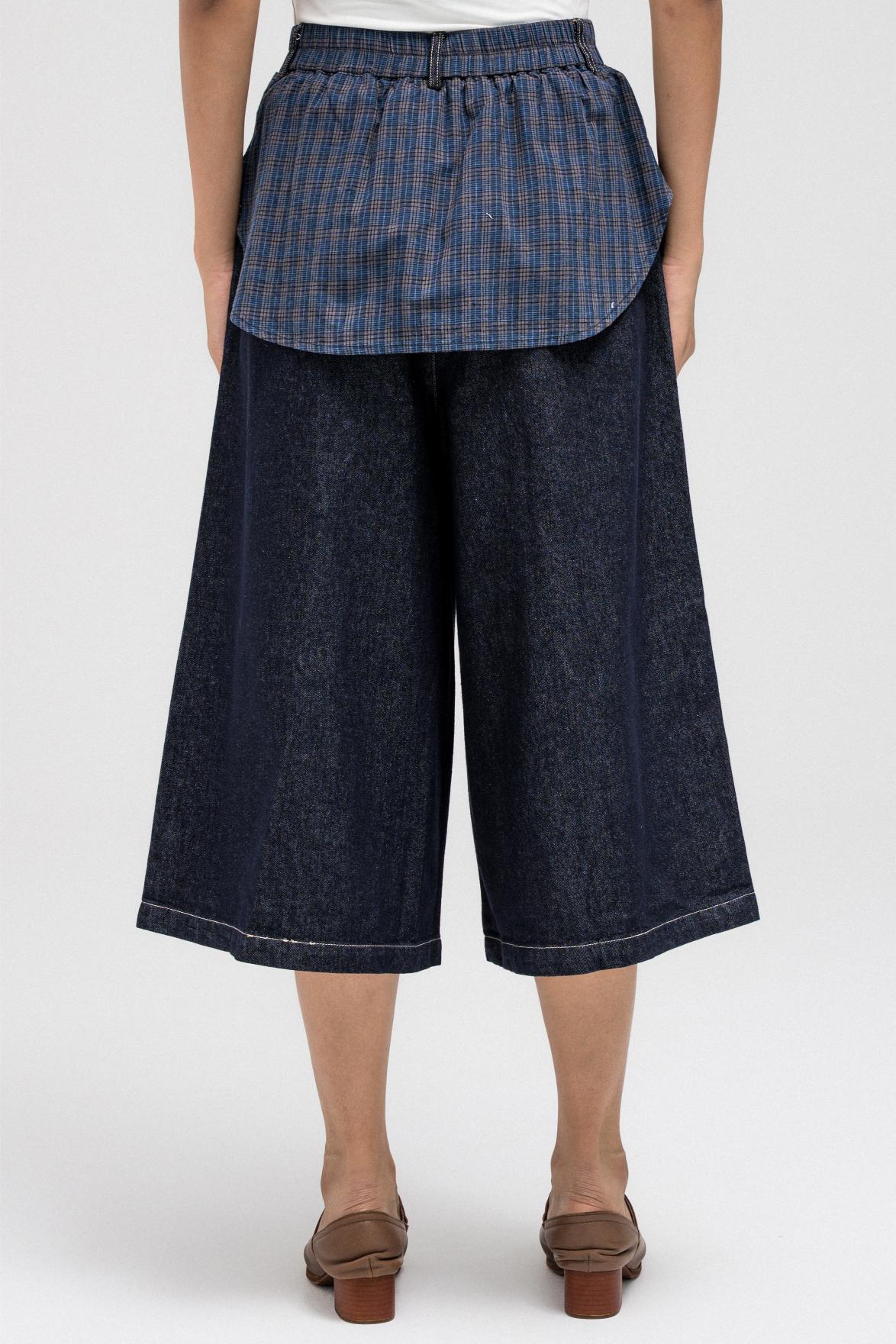 Lightweight denim pants featuring a front metal zipper closure. Designed with an attached checkered wrap design that wraps around the waist, adding a unique layered detail. Perfectly pairs with the matching denim vest for a coordinated look.