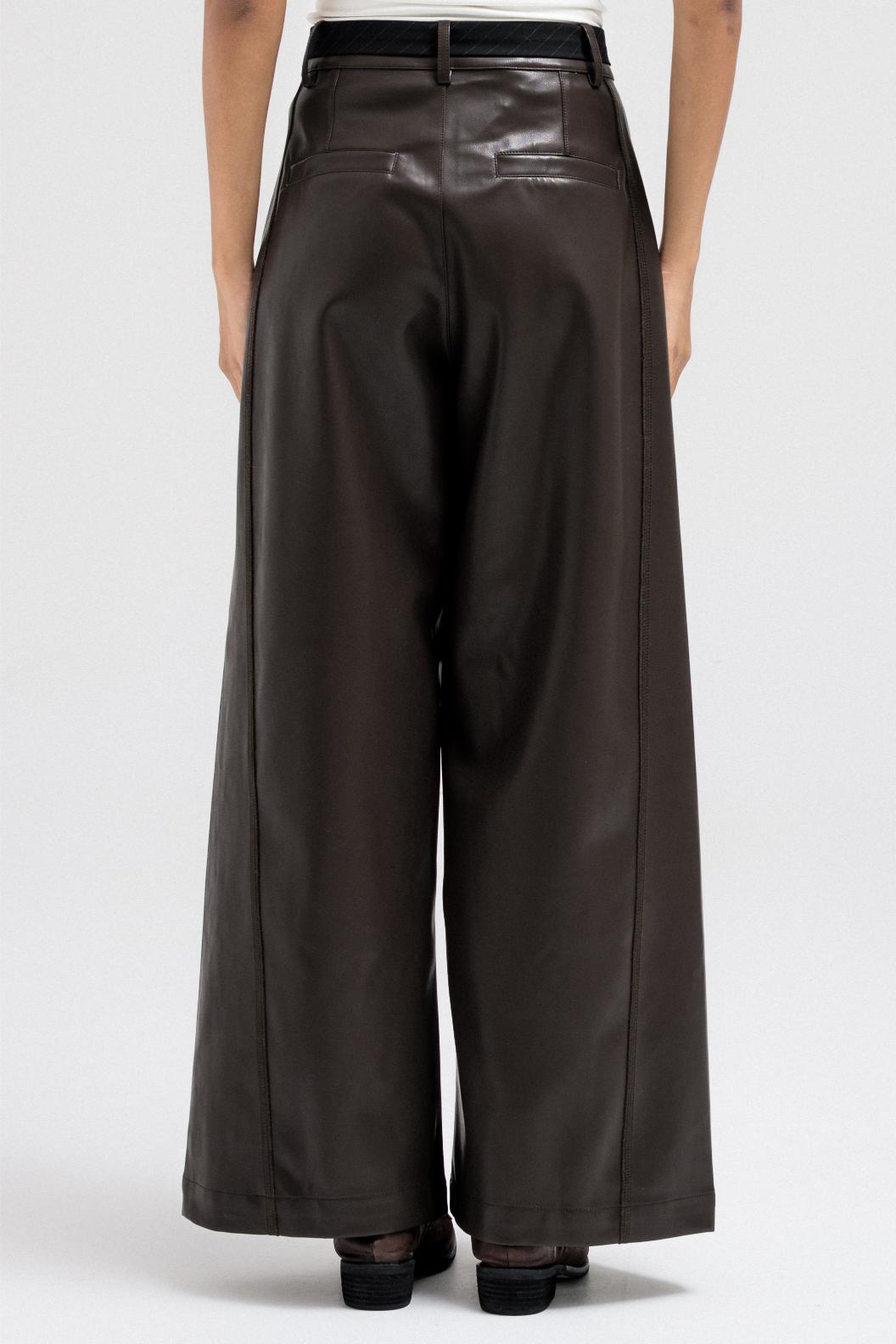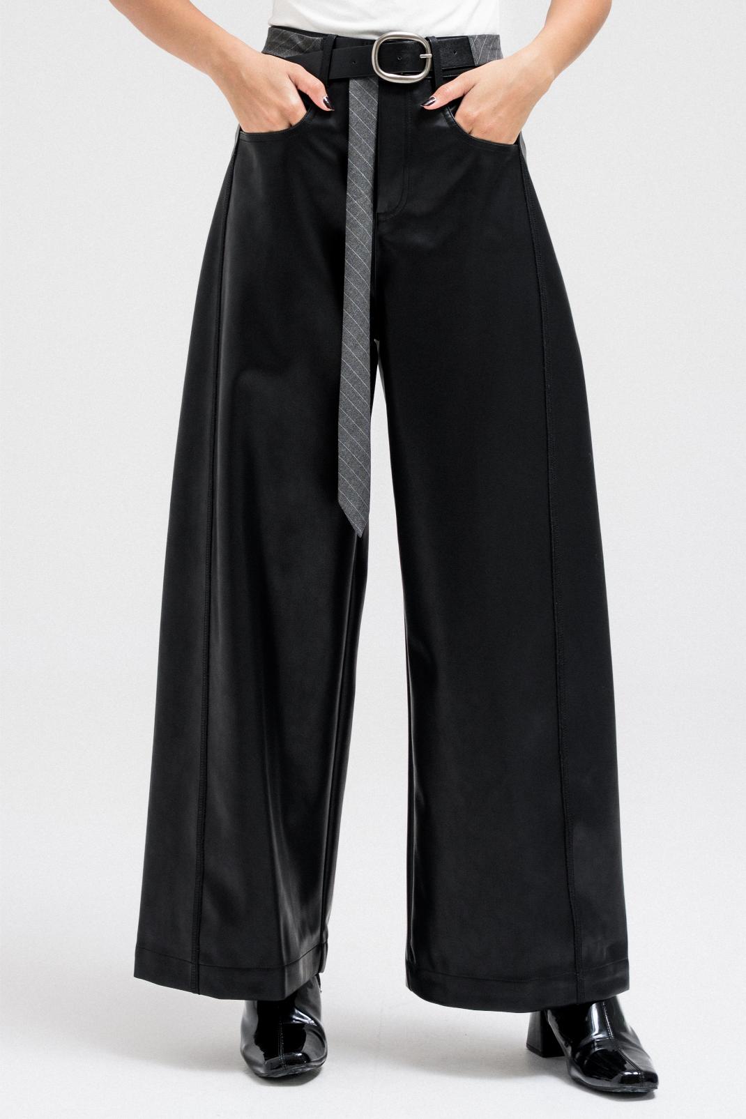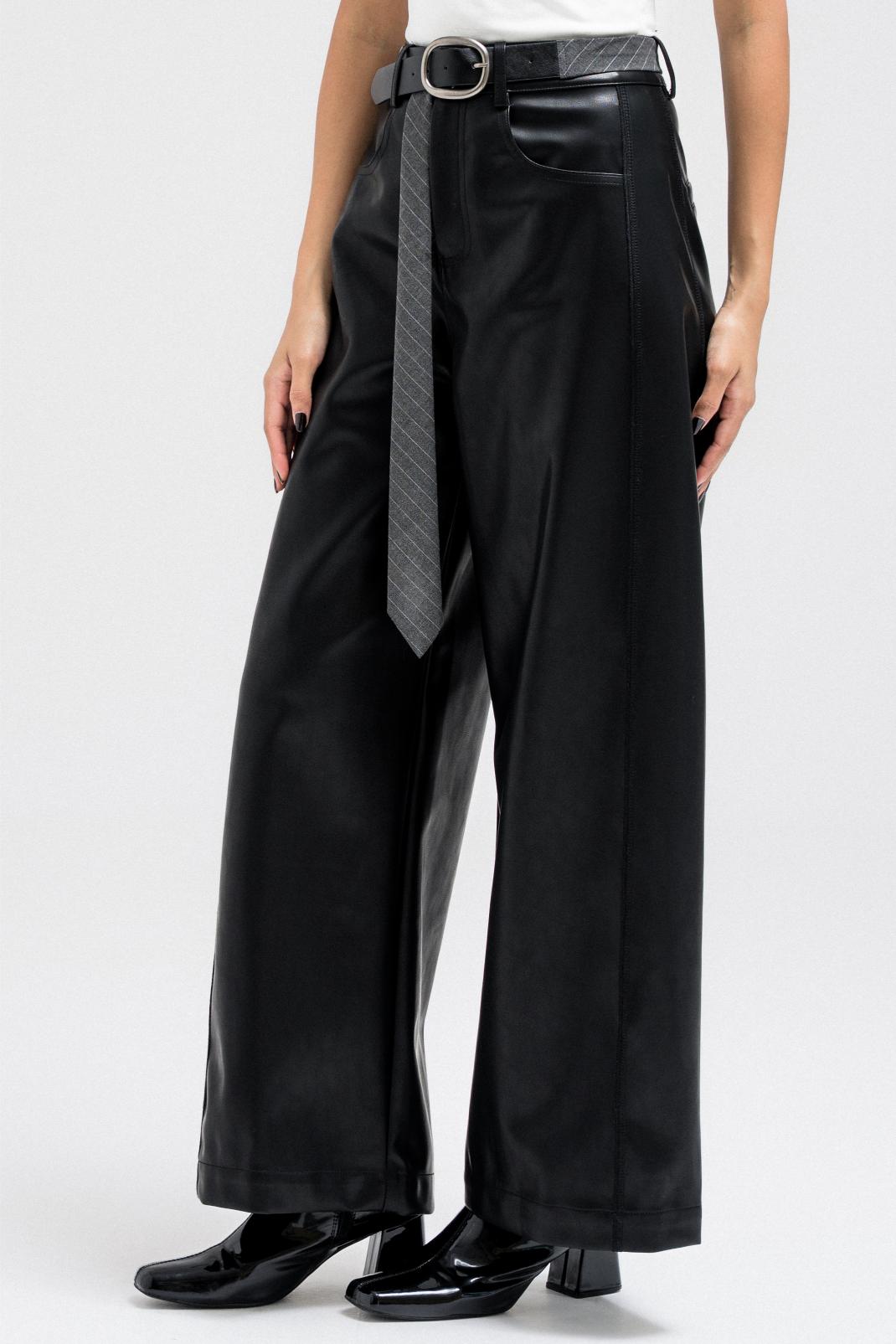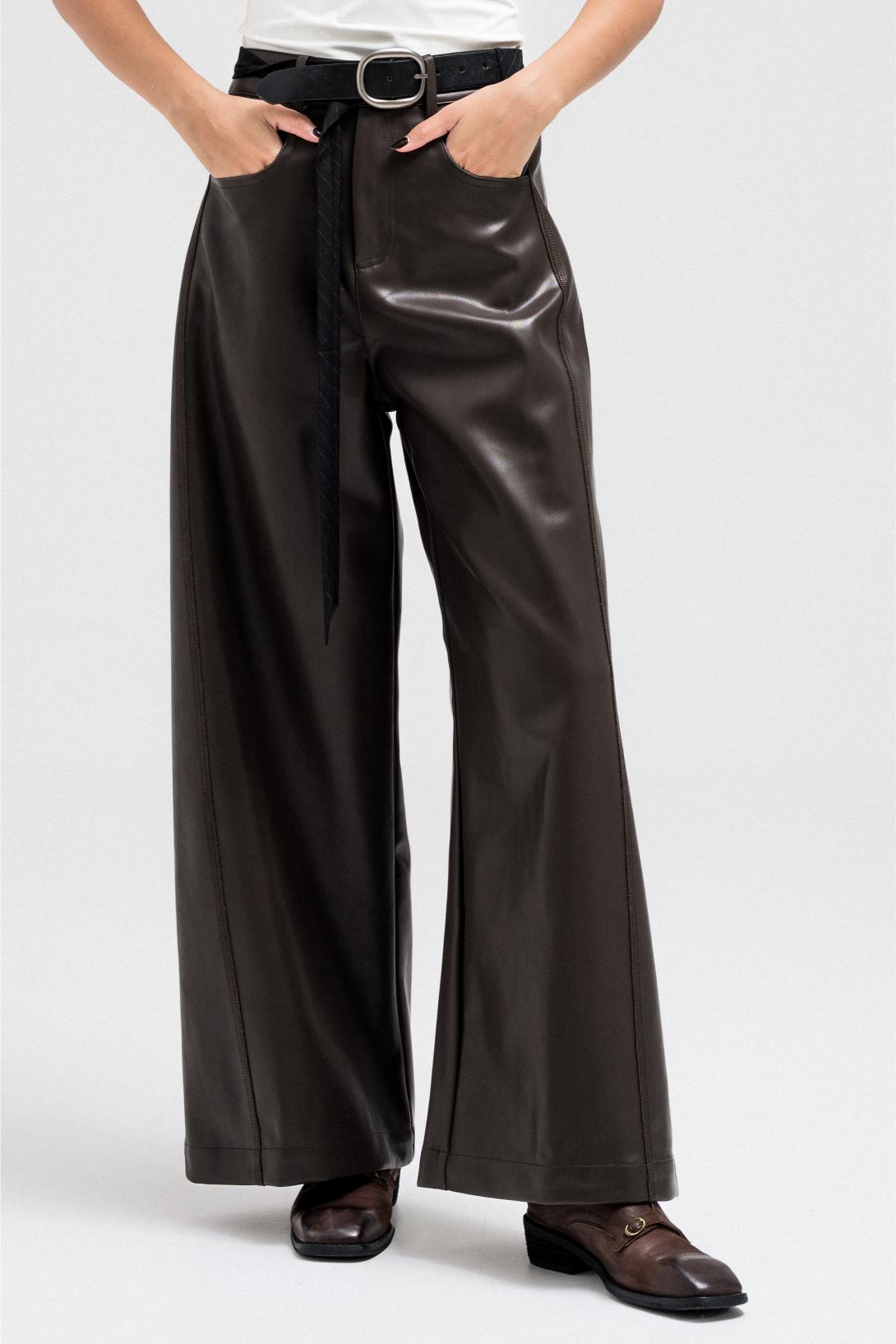 These pants come in a sleek leather-like material and feature a unique belt detail that mimics the look of a tie, complete with a buckle for styling. They have a front button and zipper closure and include side pockets for practicality. A standout, modern piece that elevates any outfit.