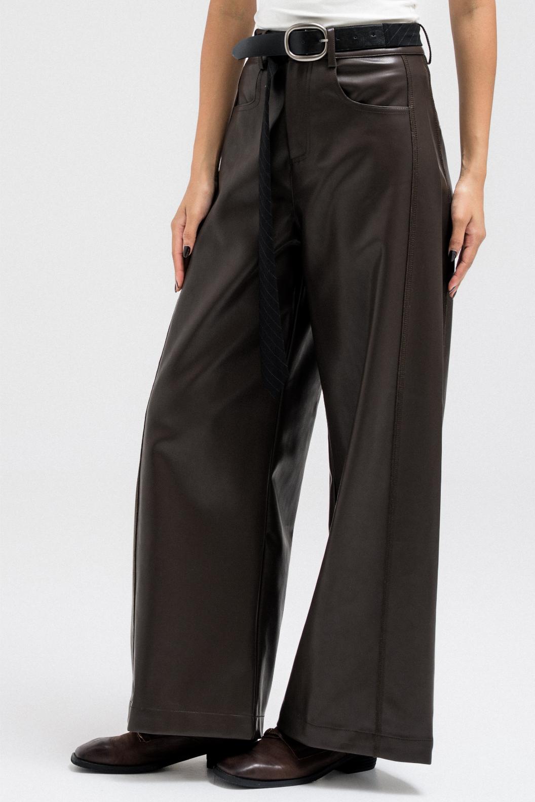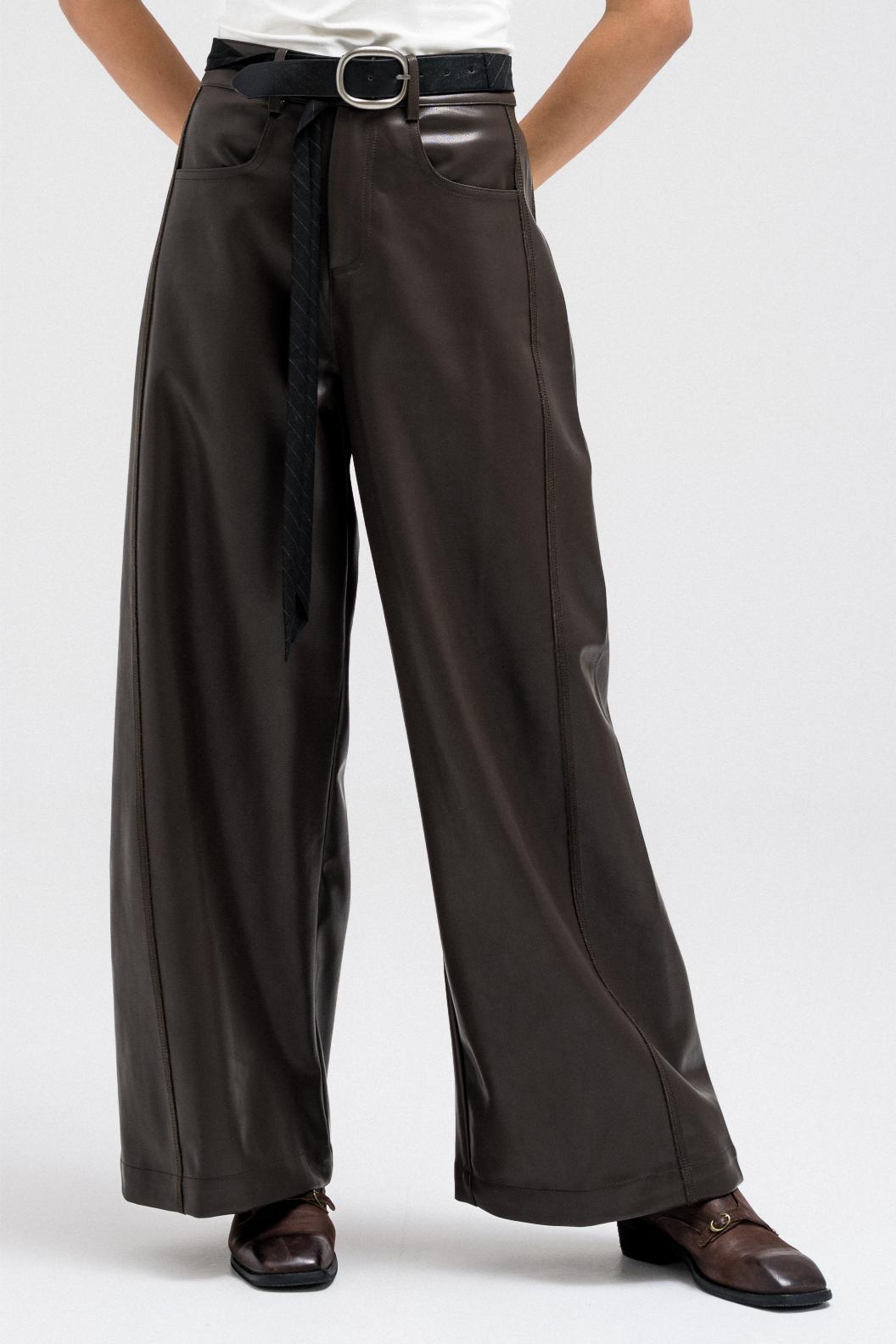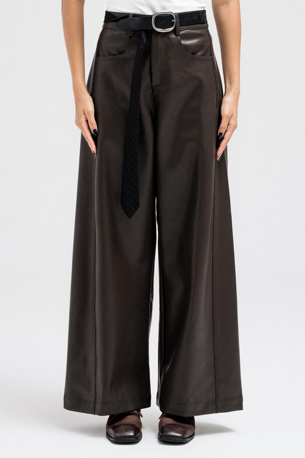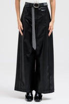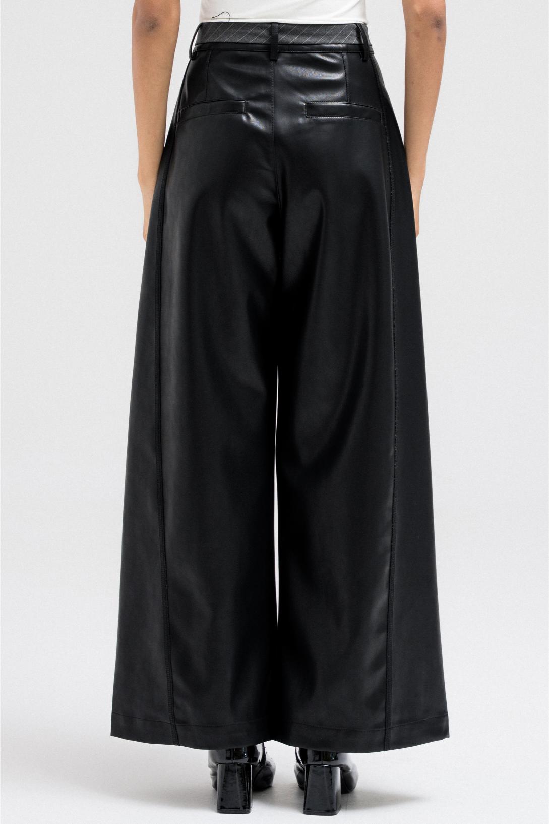 These pants come in a sleek leather-like material and feature a unique belt detail that mimics the look of a tie, complete with a buckle for styling. They have a front button and zipper closure and include side pockets for practicality. A standout, modern piece that elevates any outfit.