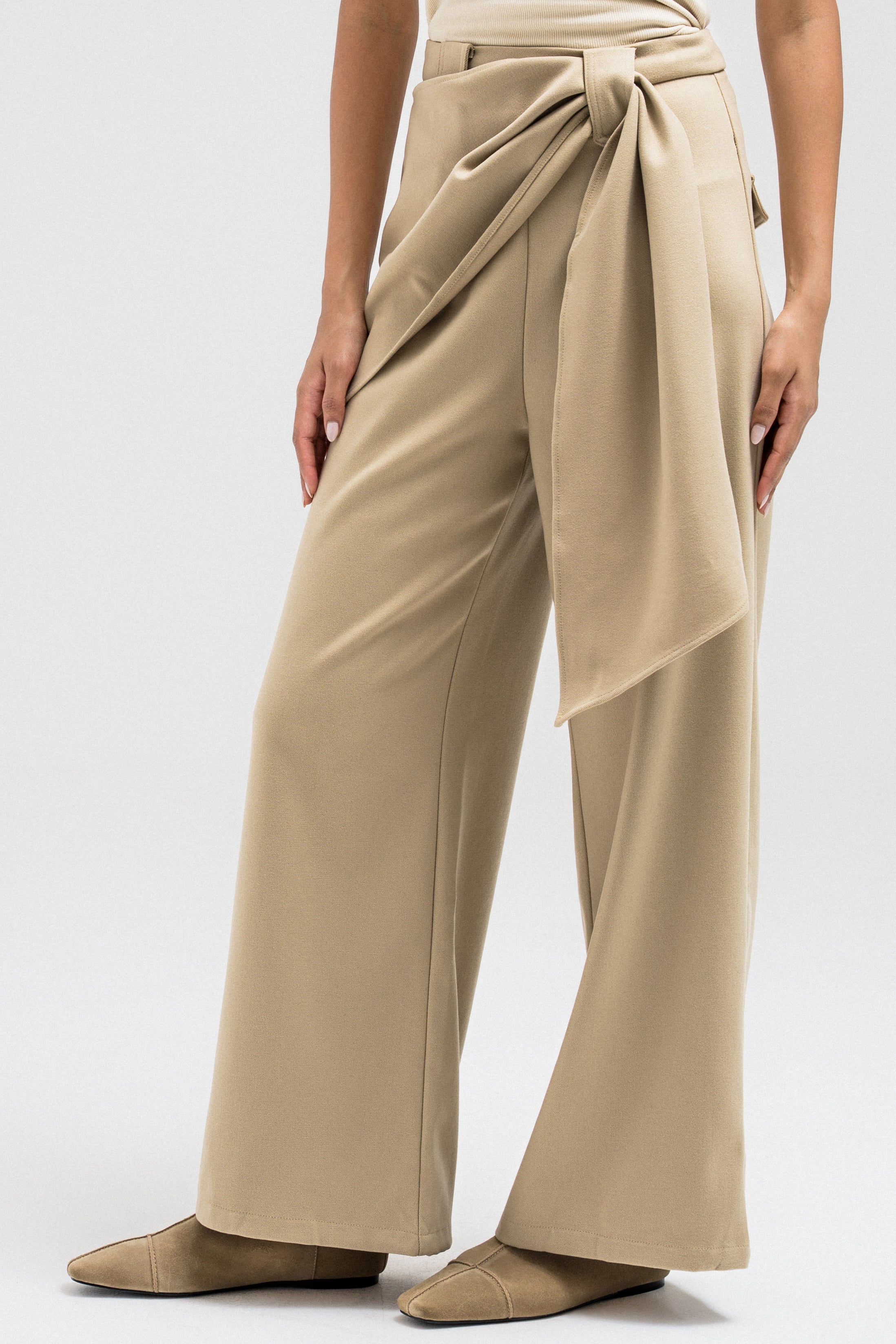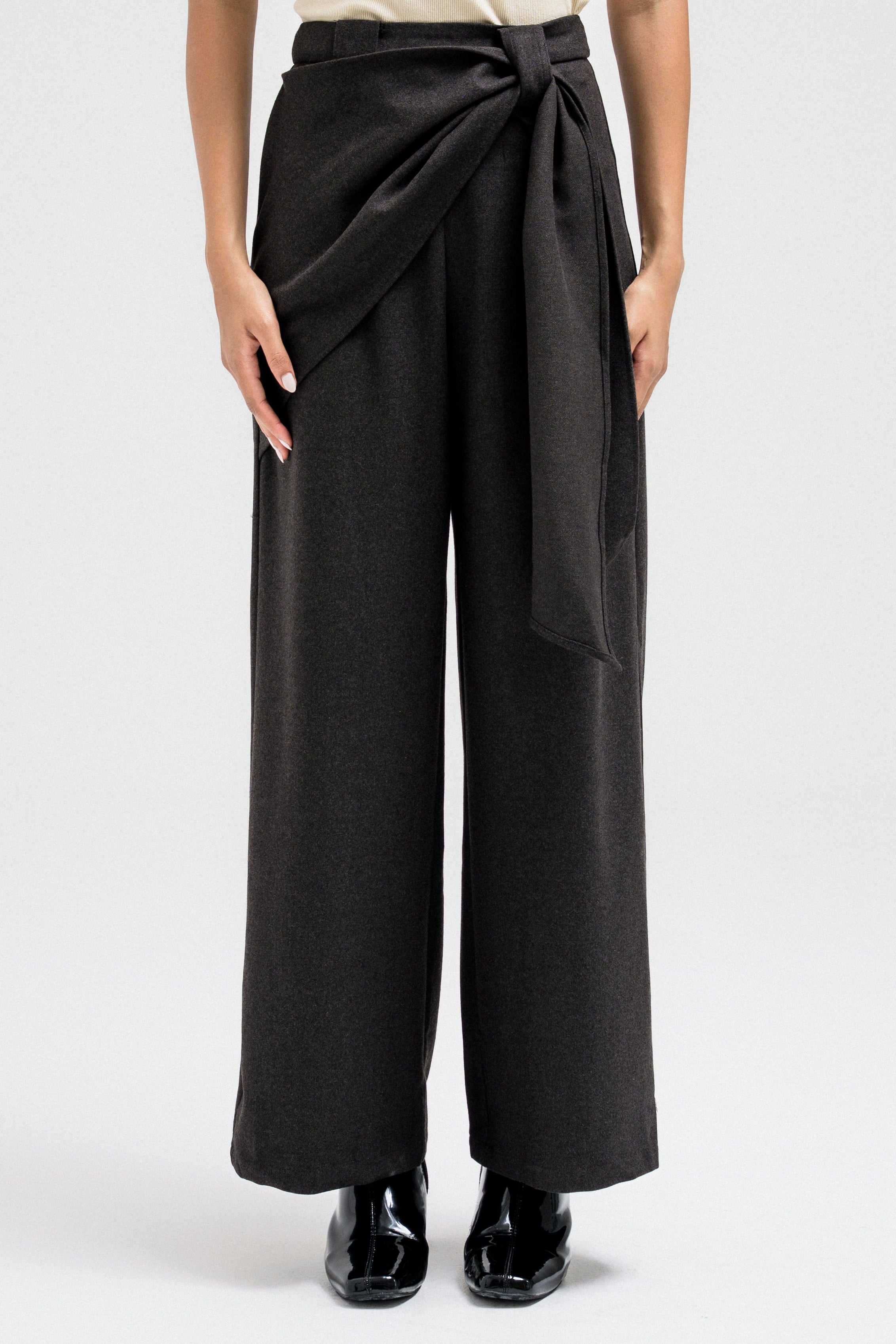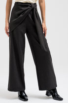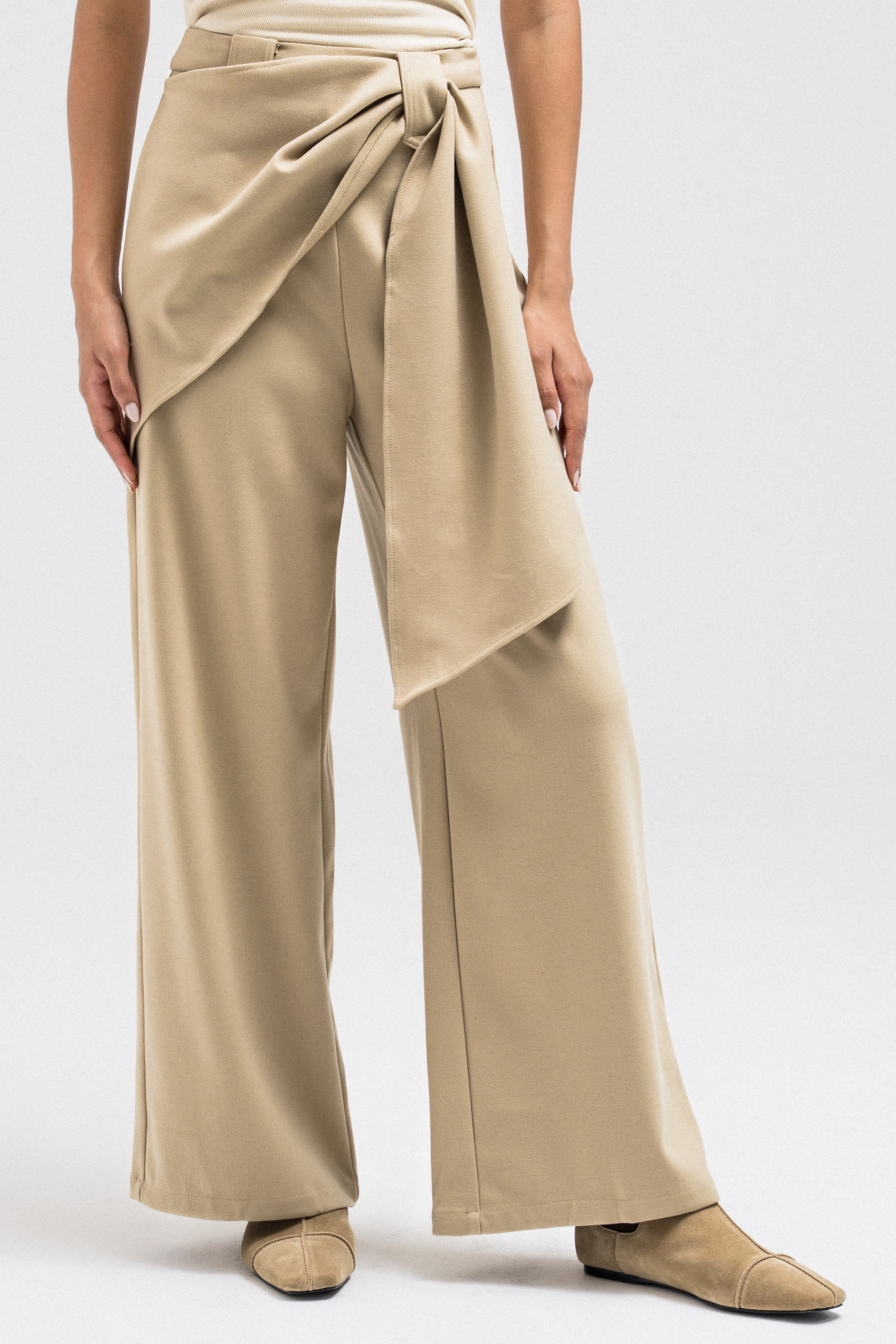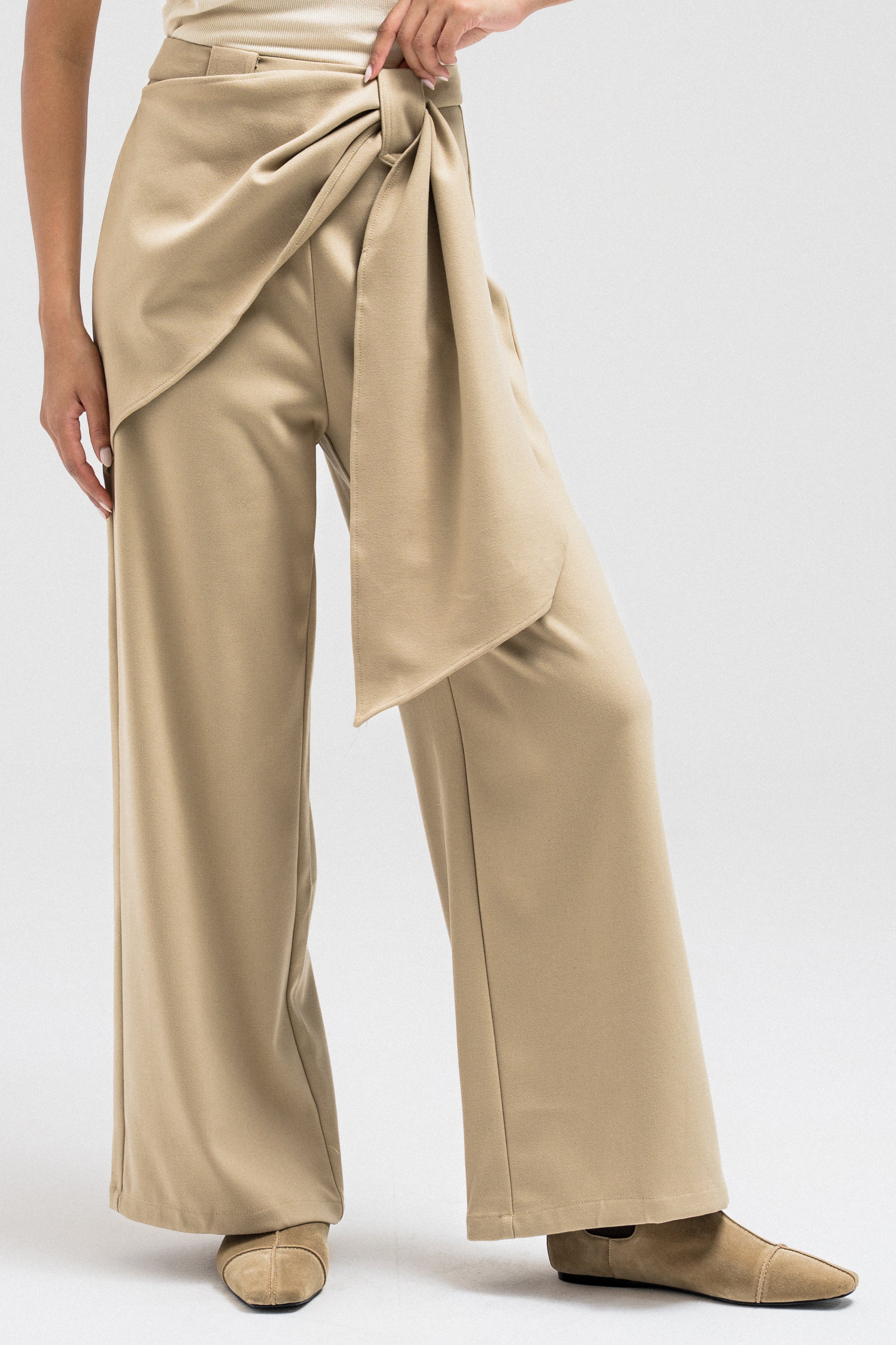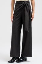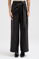 These elegant pants feature a distinctive wrap design that ties through front waist openings, creating a layered and fluid silhouette. Designed with a concealed back zipper closure for a sleek finish, they offer a refined balance of comfort and modern sophistication.