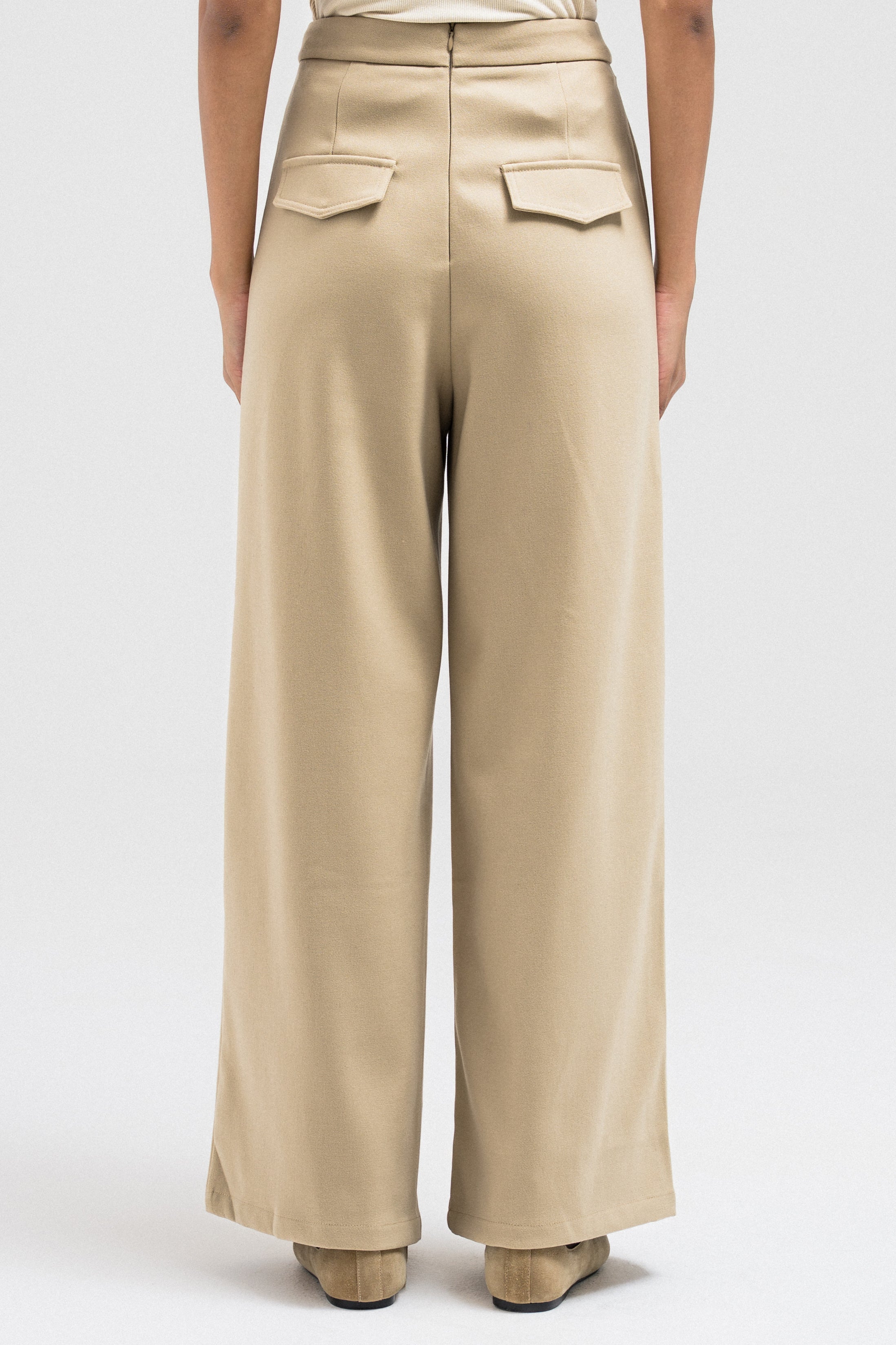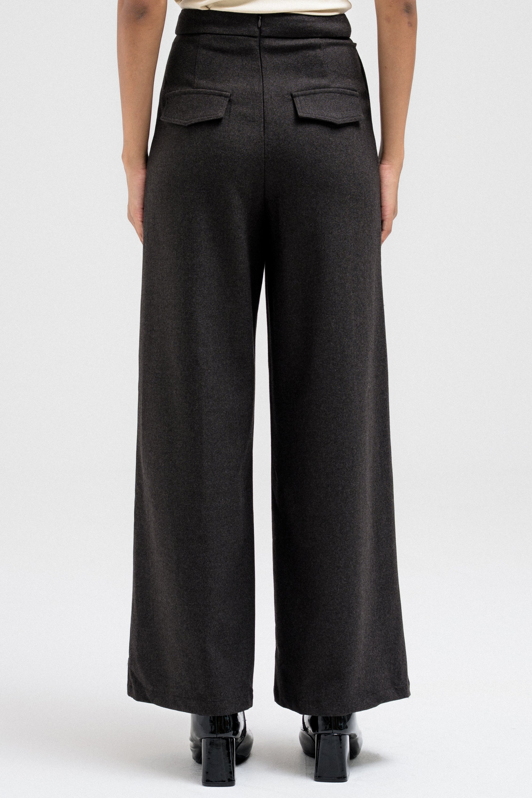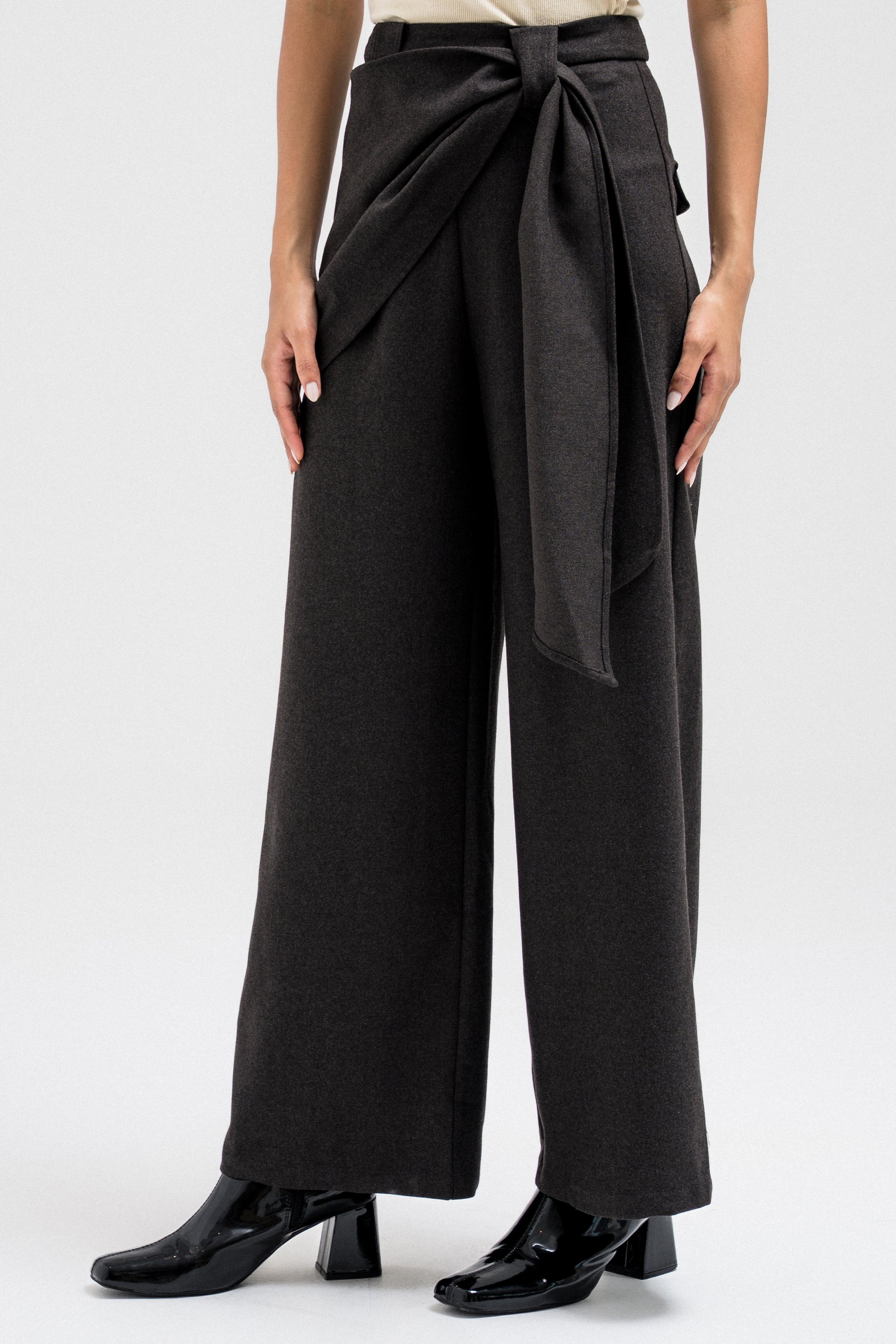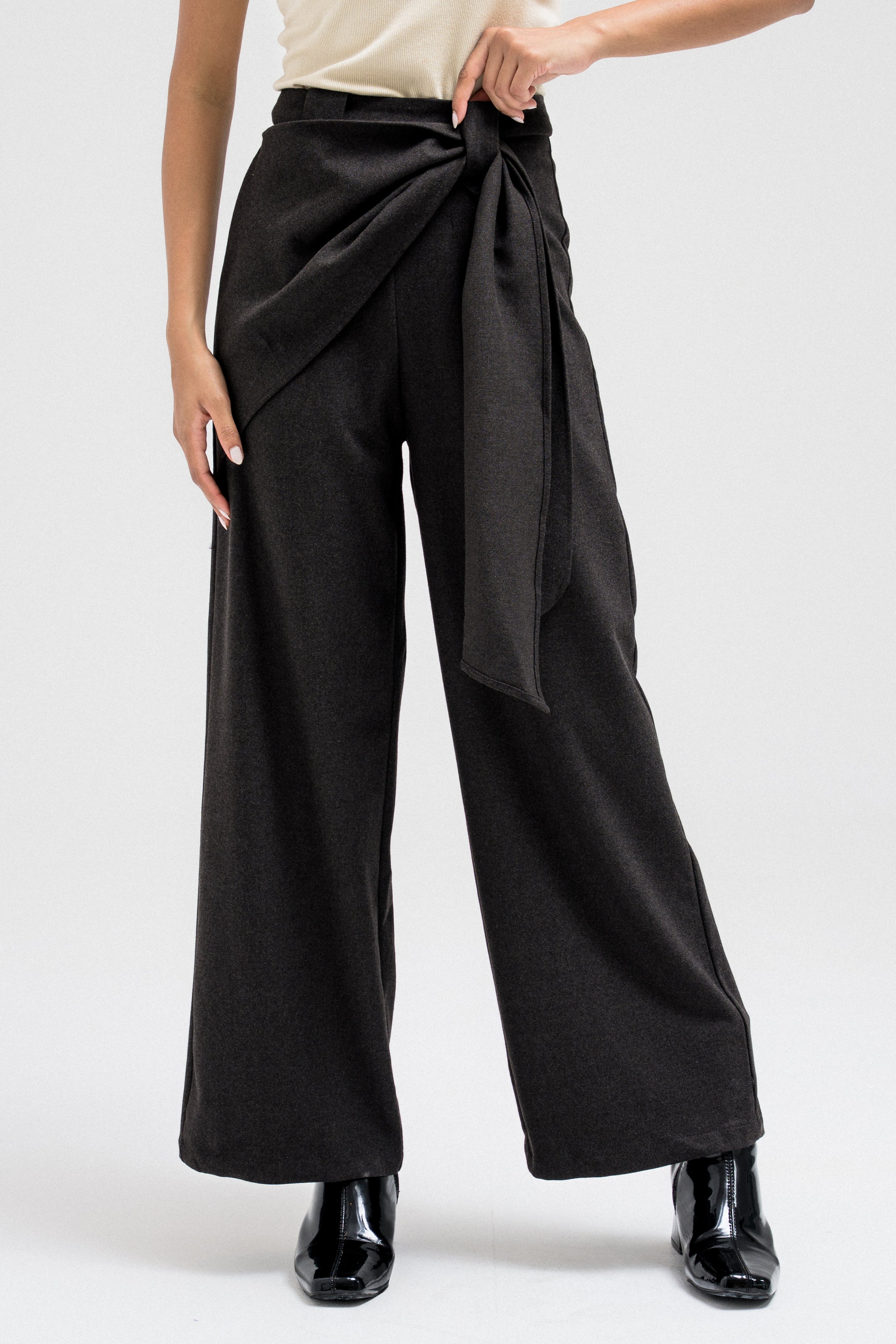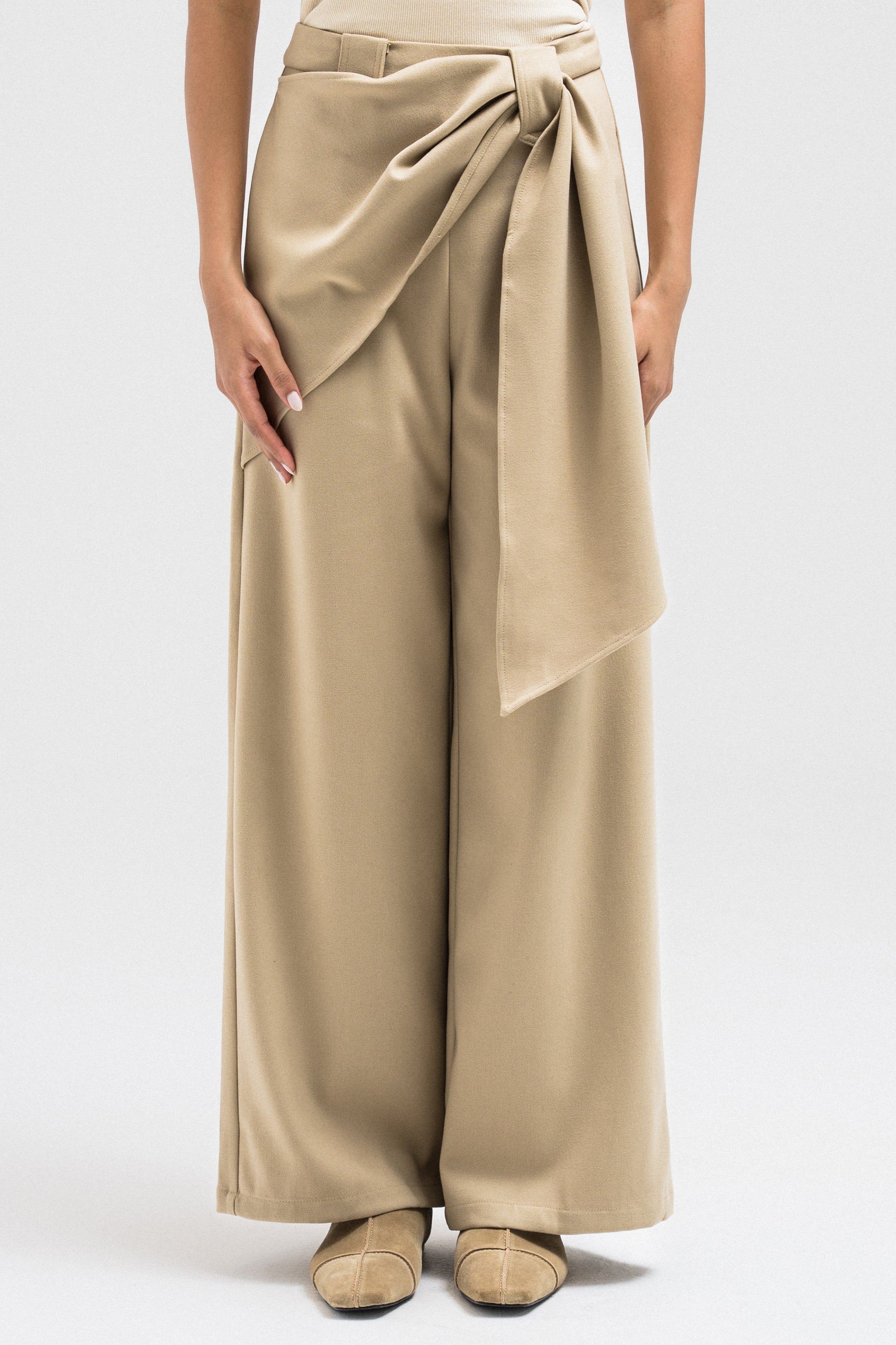 These elegant pants feature a distinctive wrap design that ties through front waist openings, creating a layered and fluid silhouette. Designed with a concealed back zipper closure for a sleek finish, they offer a refined balance of comfort and modern sophistication.