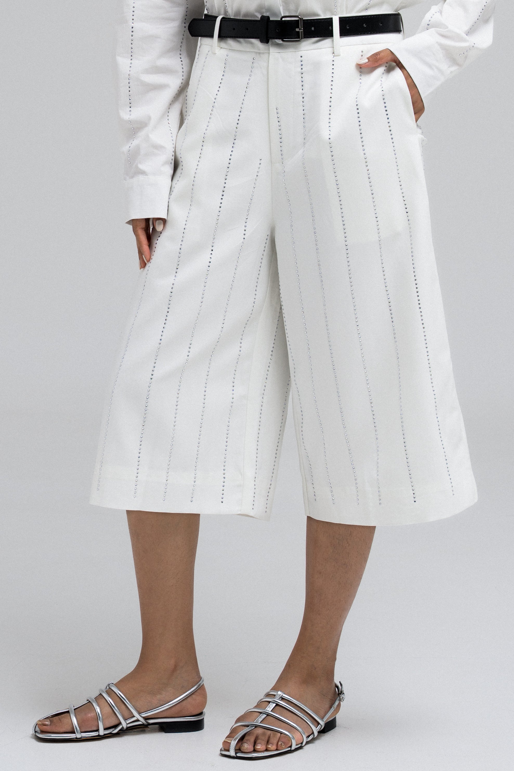 Bermuda shorts are elevated with all-over crystal rhinestone embellishments that add a touch of sparkle to the design. Featuring a button and zipper front closure, it comes with a sleek leather belt.