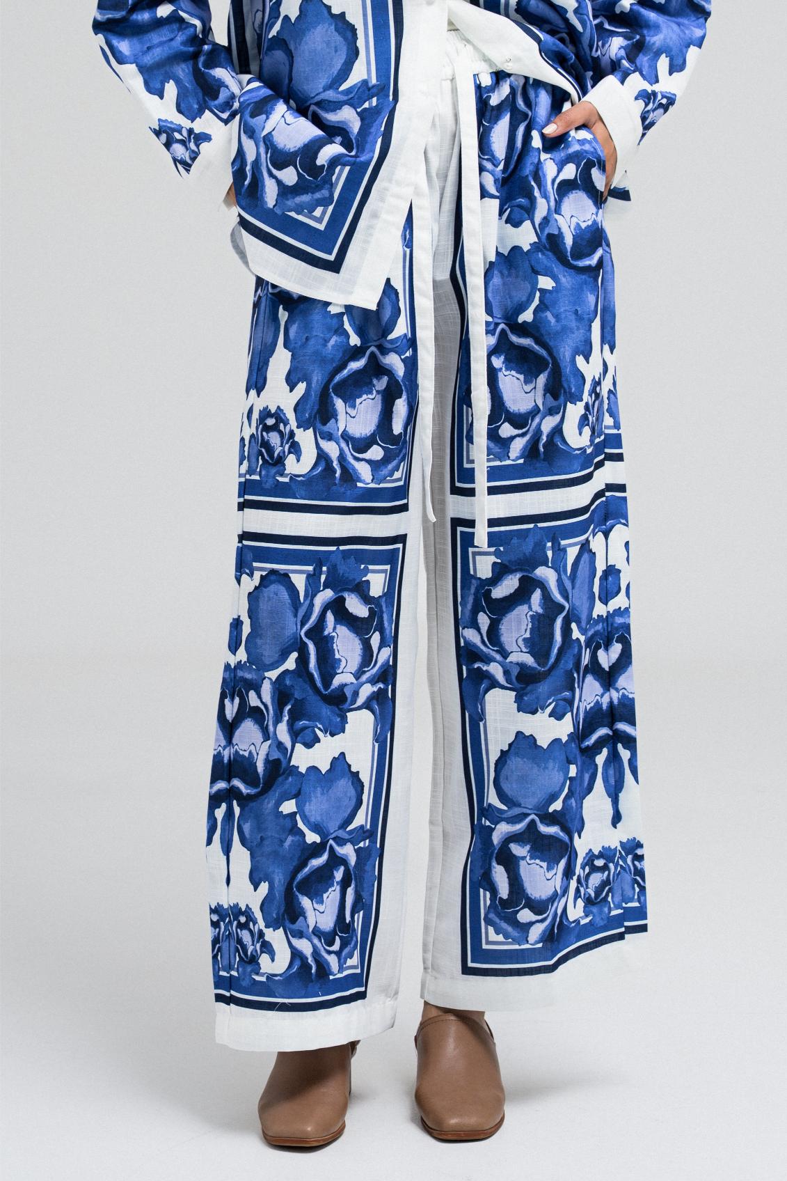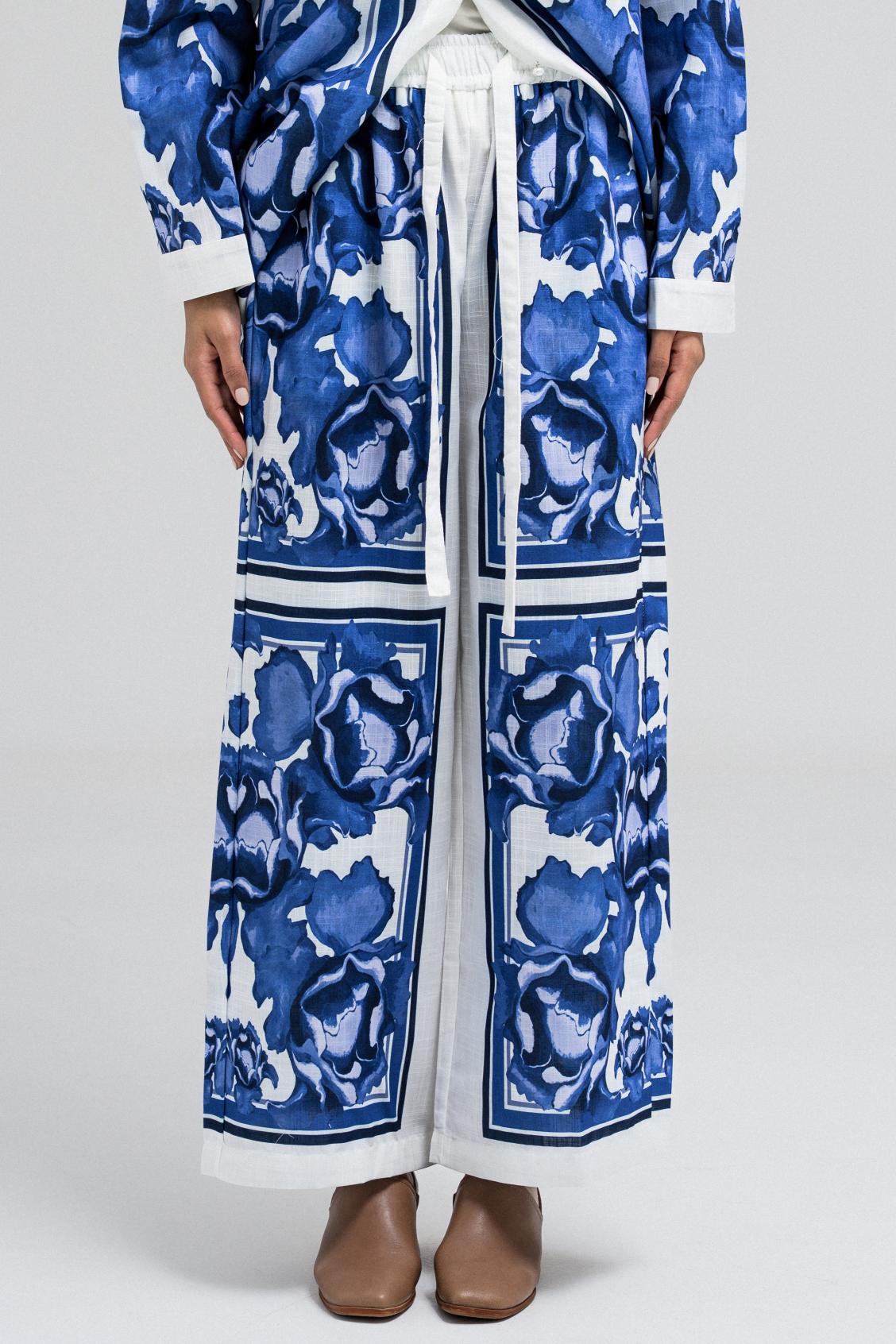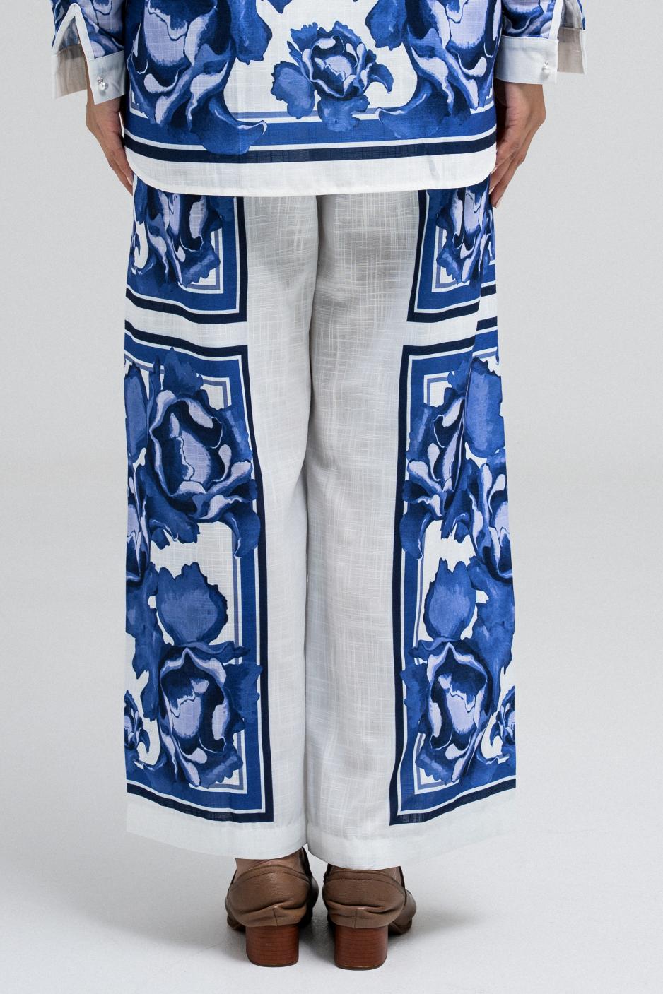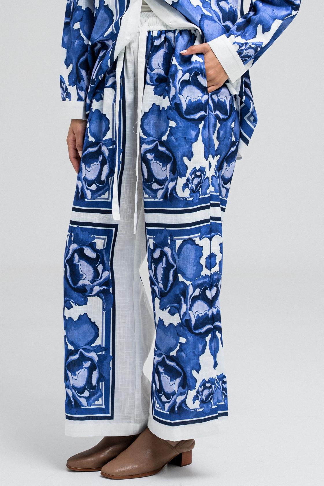These pants feature a standout blue and white bold print, perfectly matching the shirt. Designed with a comfortable fit, they include a front button and zipper closure, and two side pockets for functionality. Pair it with the matching top to complete the statement set.