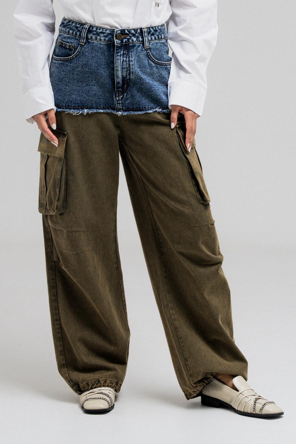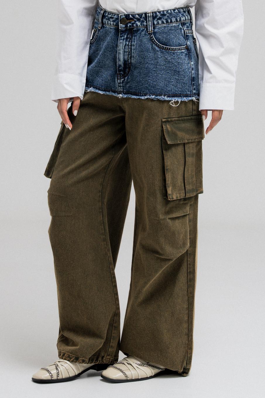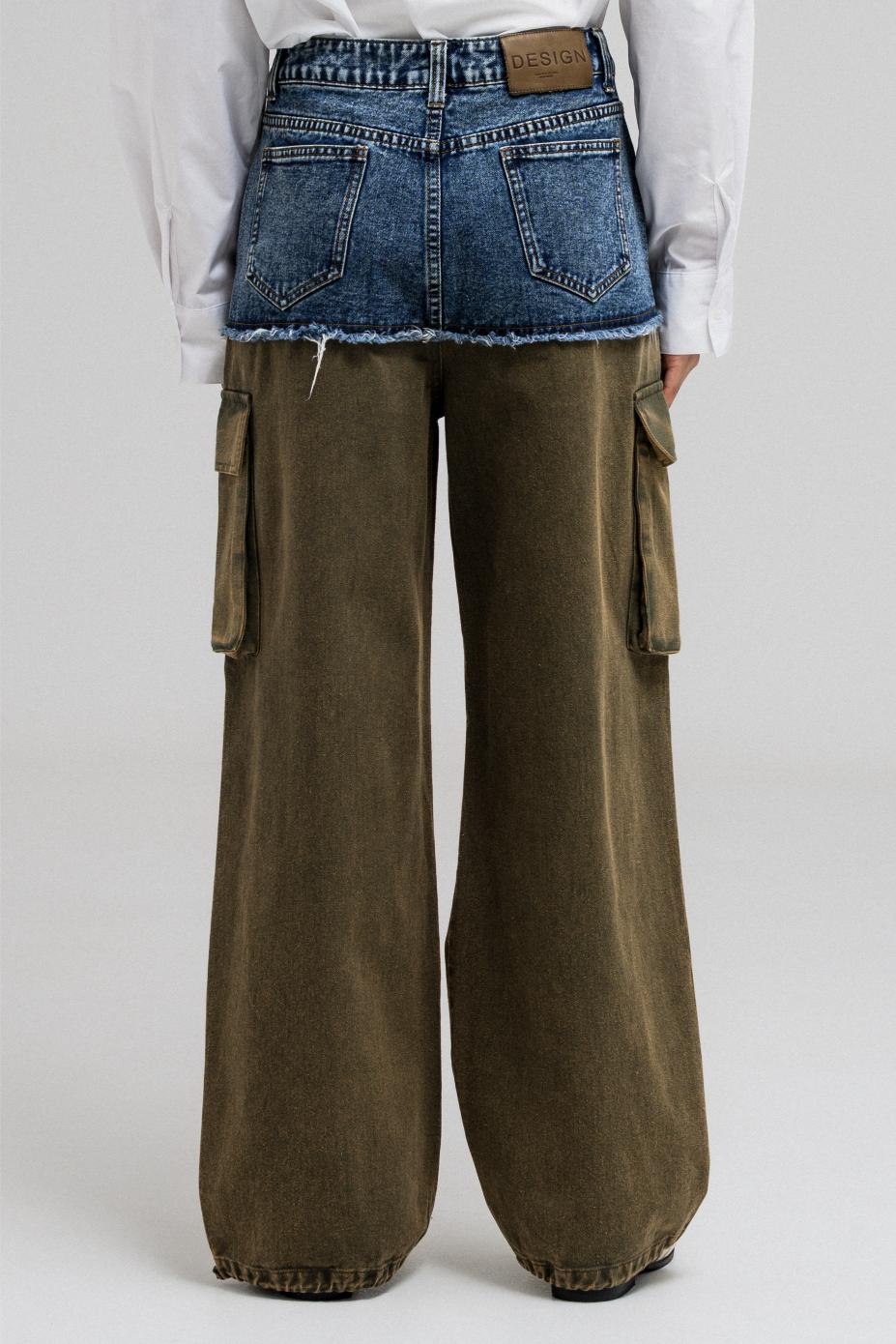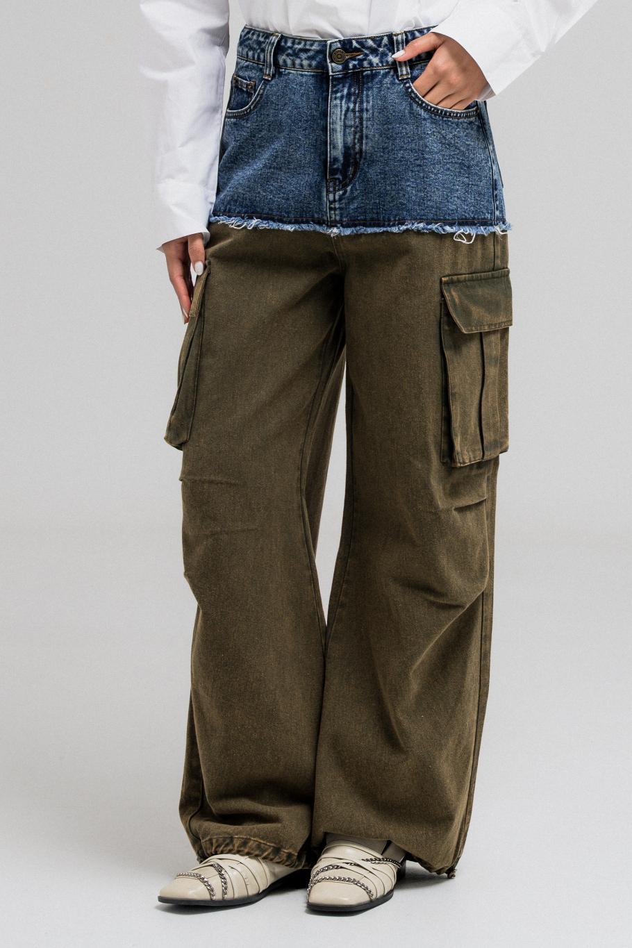 These statement pants feature a unique two-part design the upper half has a classic blue denim look with front button and zipper closure, while the bottom half shifts into a contrasting cargo-style denim. Both sections are crafted from denim material but differ in texture and structure, with the cargo part including multiple flap pockets and a loose, wide-leg fit for an edgy streetwear vibe.