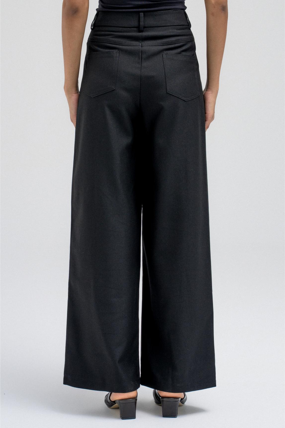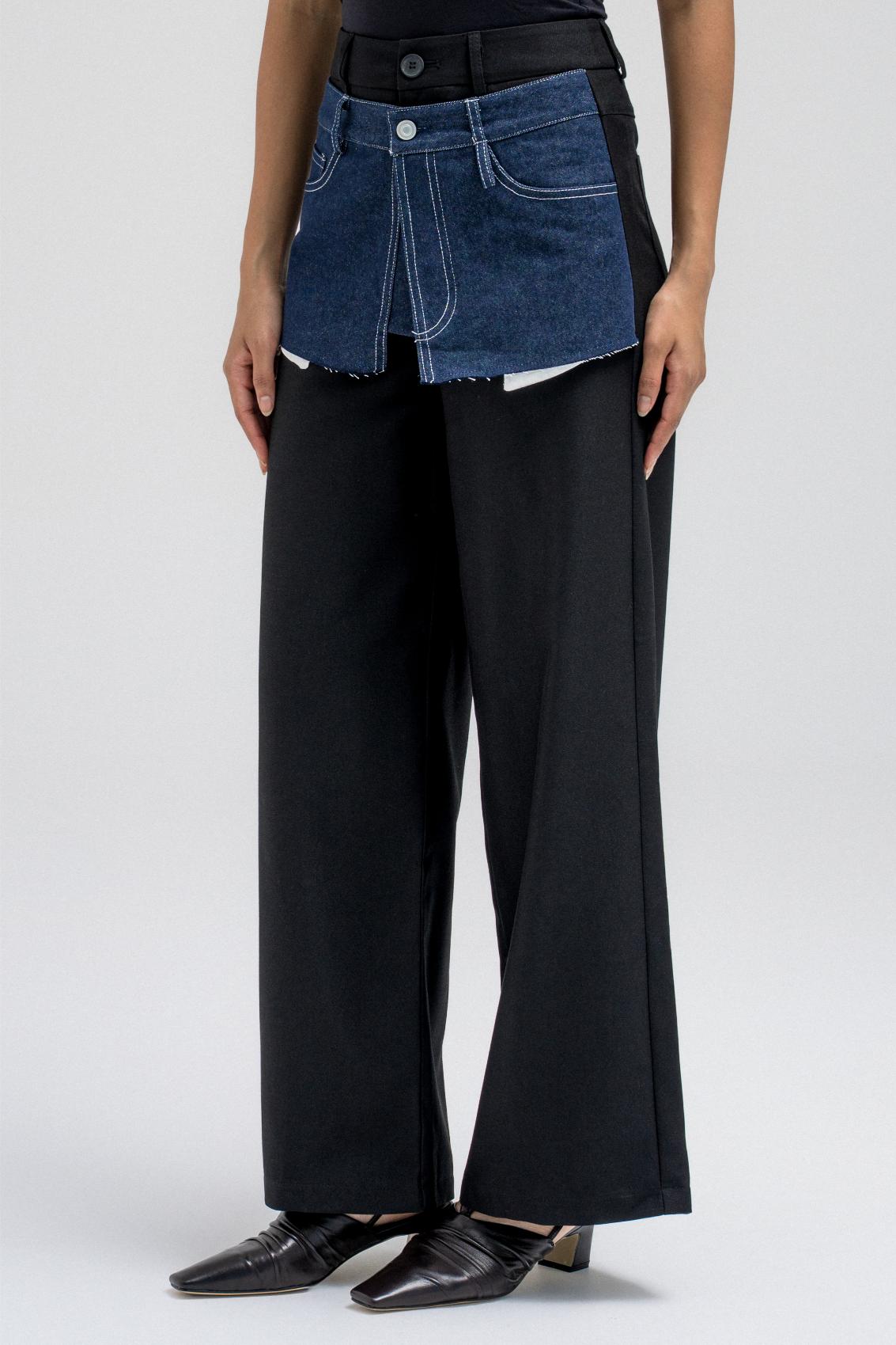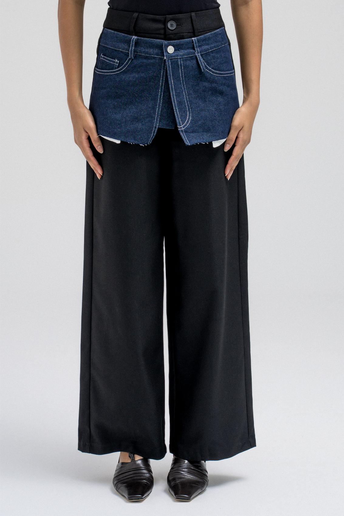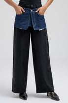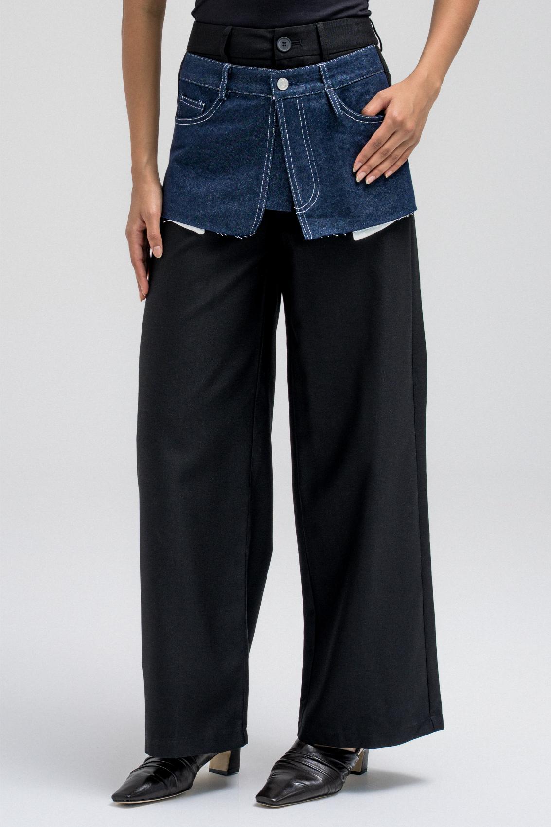 Straight-cut denim pants with front button and zipper closure, finished with functional back pockets. The design features a unique front wrap panel secured with its own metal button closure and small pockets, adding a layered denim-on-denim effect.