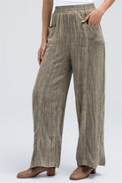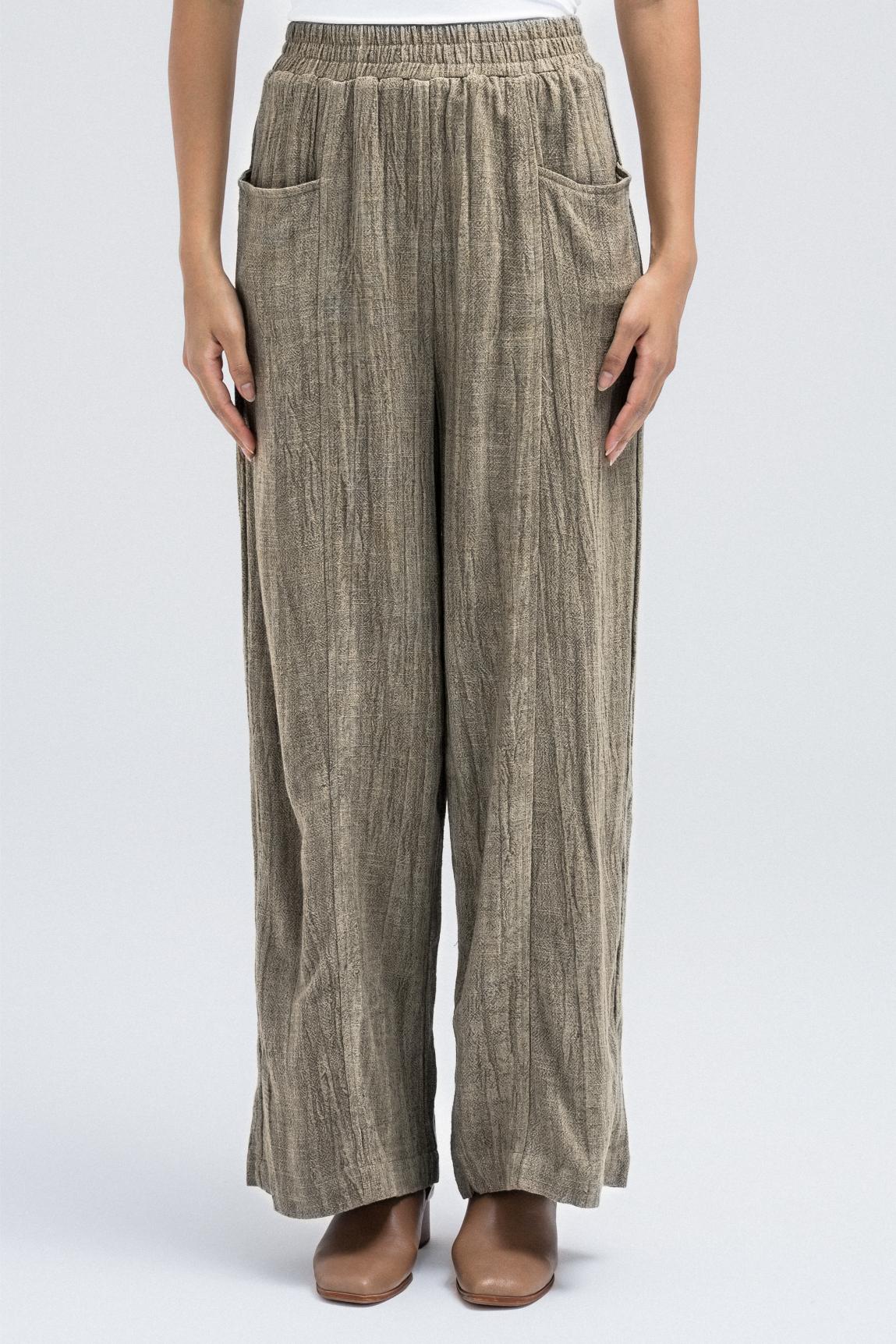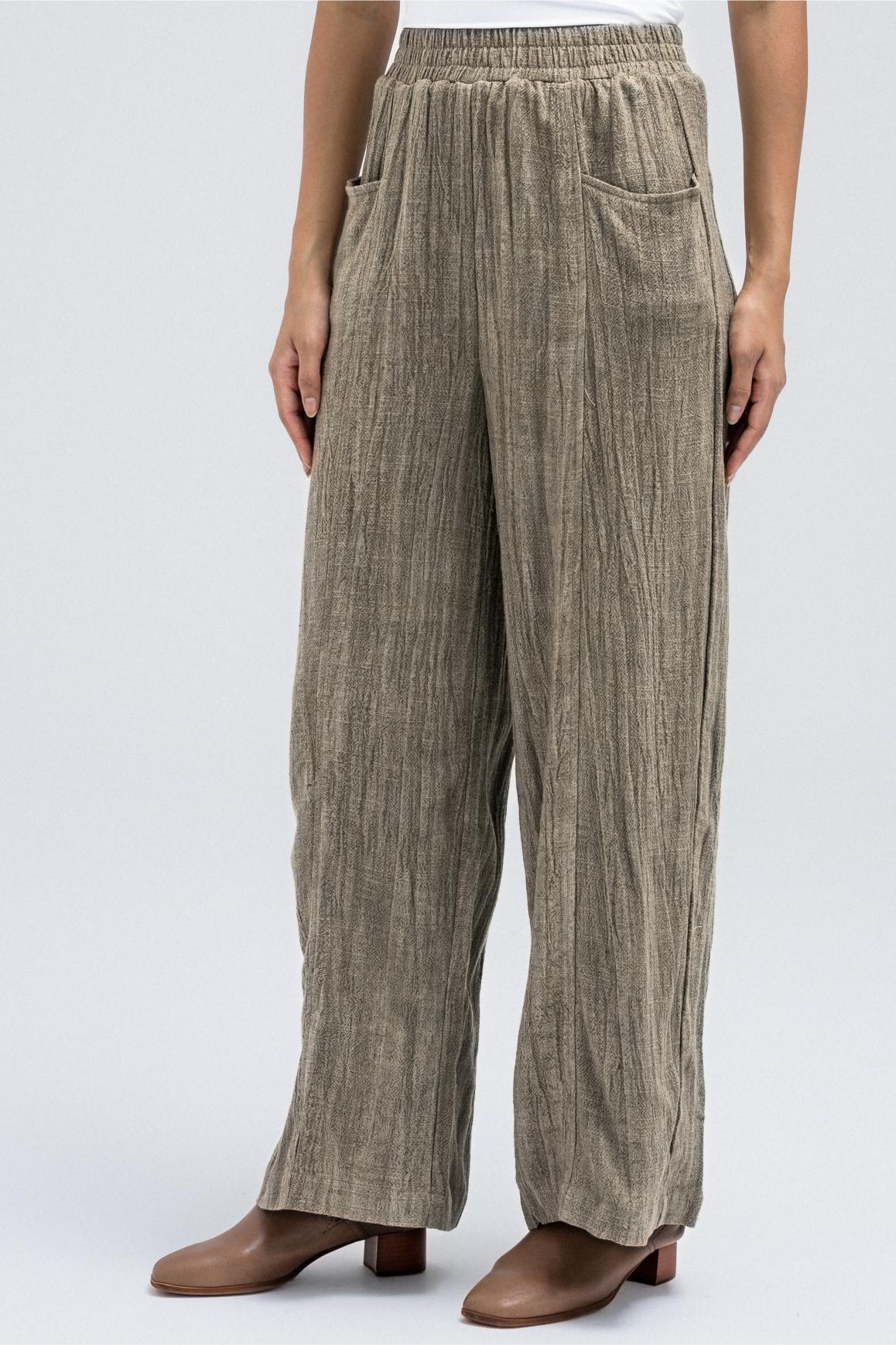 Relaxed-fit pants crafted from a textured material, designed with an elastic waistband for added comfort. Features both front and back pockets, offering a practical yet stylish touch. Perfect to pair with the matching blazer and vest for a coordinated full look.
