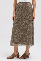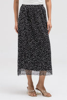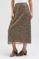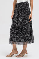 This statement skirt is crafted from a sheer mesh fabric with delicate sequin embellishments throughout. The lightweight, flowy design creates an elegant shimmer with every movement, while the layered construction keeps it refined and wearable. Ideal for dressing up with simple tops or blazers.