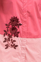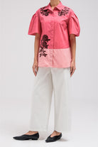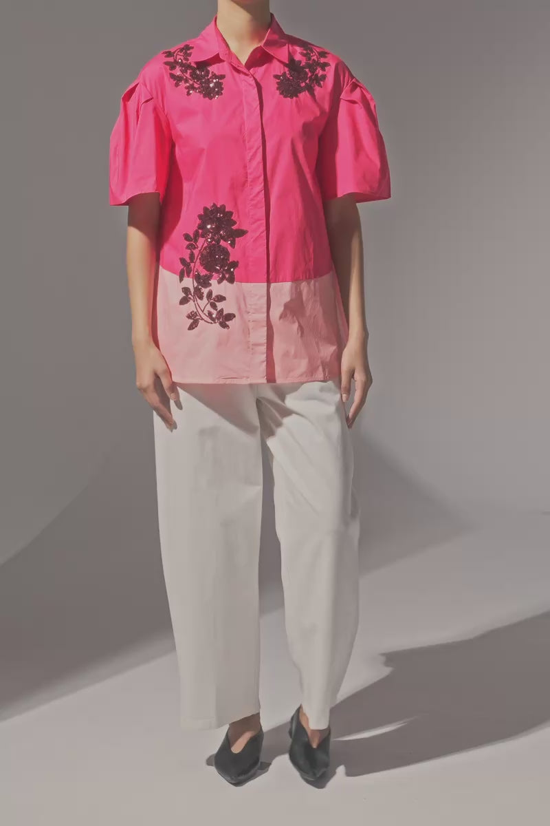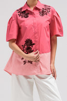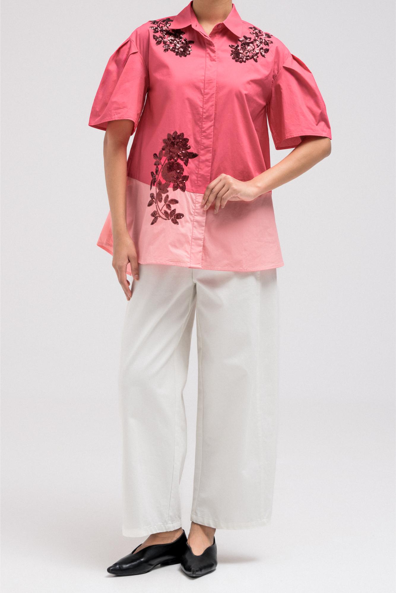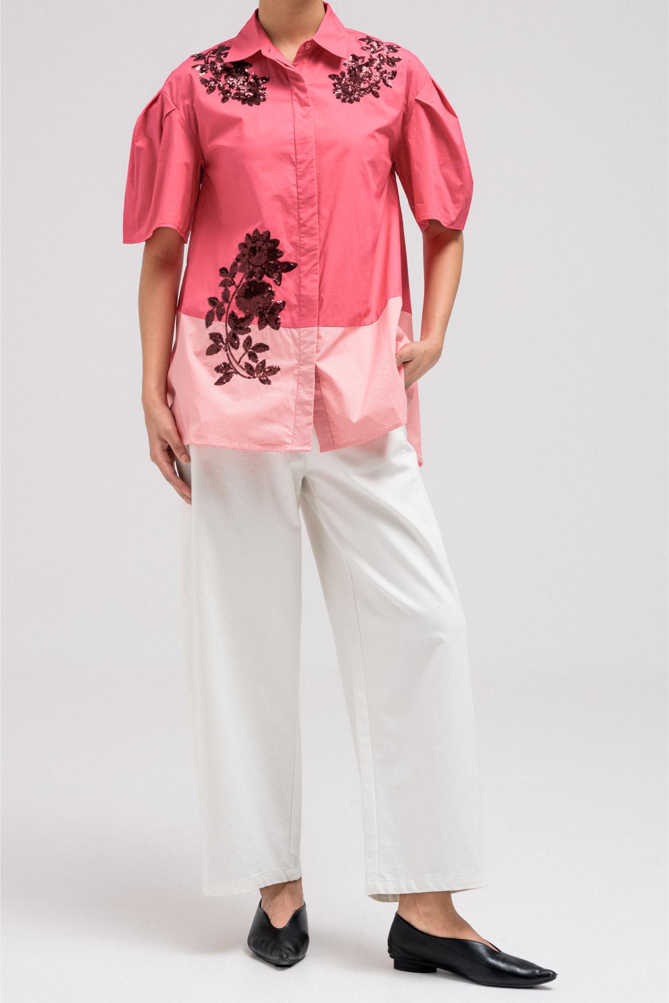 Stylish top designed with a two-tone color combination that adds contrast and visual interest to the piece. The top features 3/4 quarter sleeves and decorative flower-style sequin embellishments placed along the front for a subtle statement detail. It includes a classic front button closure and a relaxed silhouette that allows the fabric to drape comfortably. The combination of the two-tone design and sequin floral accents creates a refined yet eye-catching look.