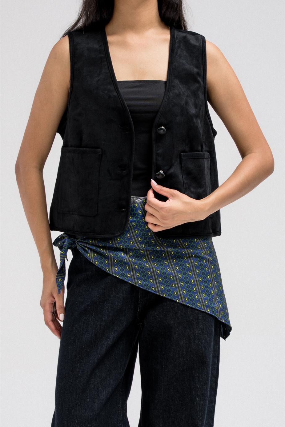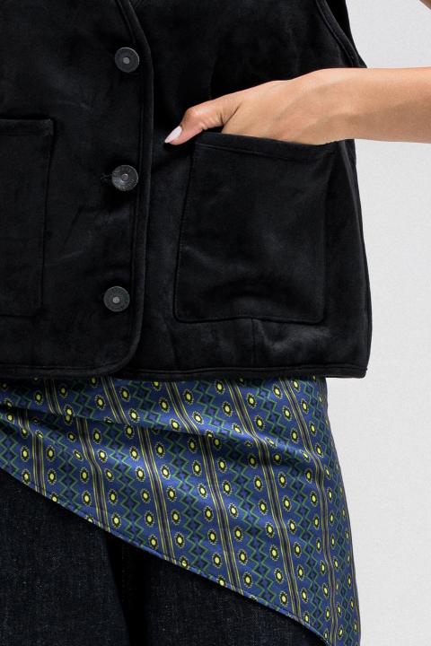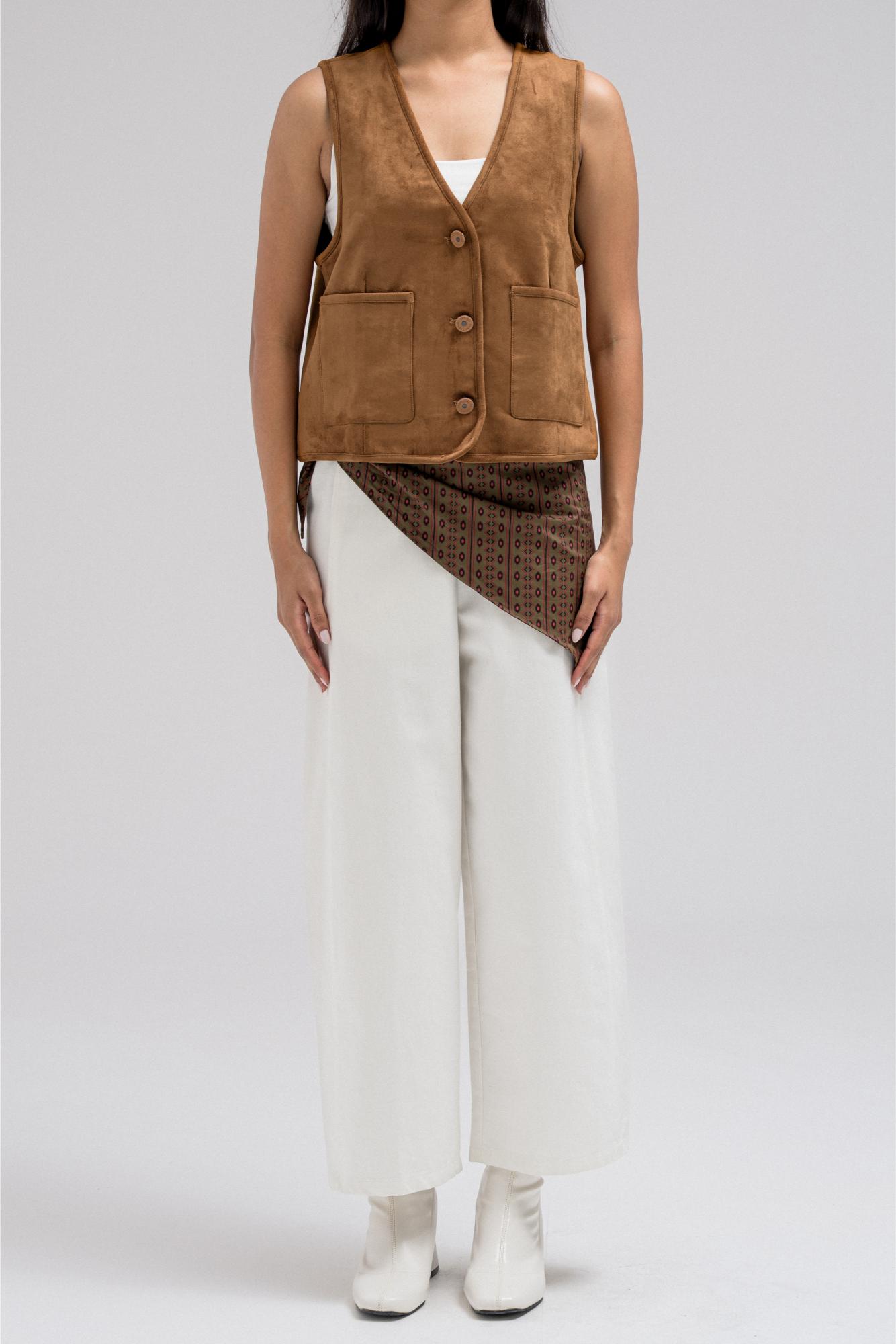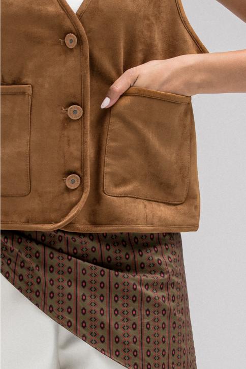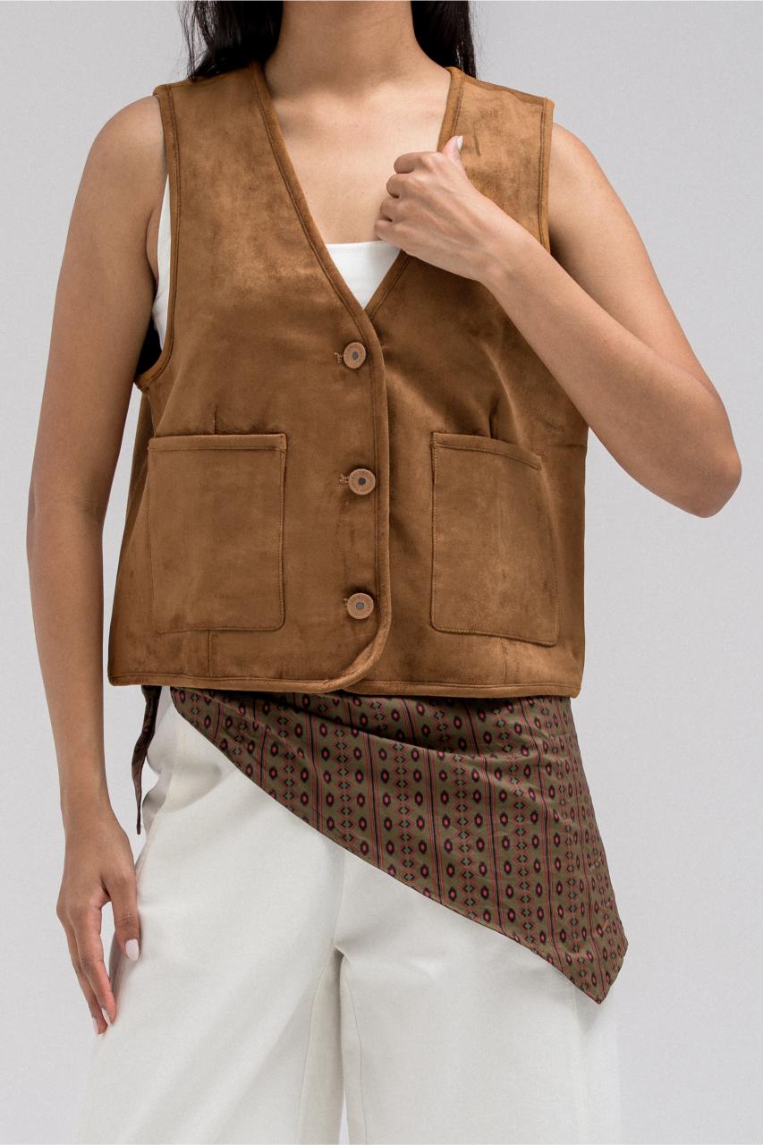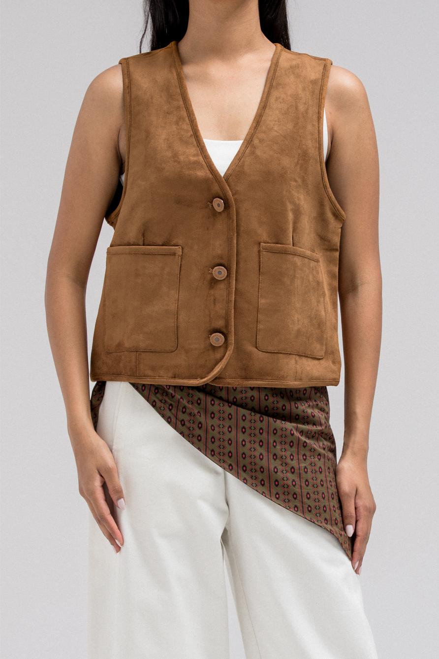 A timeless layering piece crafted from soft suede material, featuring front button closure and functional pockets. The inner lining reveals a subtle printed pattern that adds depth and character to the design. Pair it with the matching printed scarf for a coordinated and effortlessly chic look.