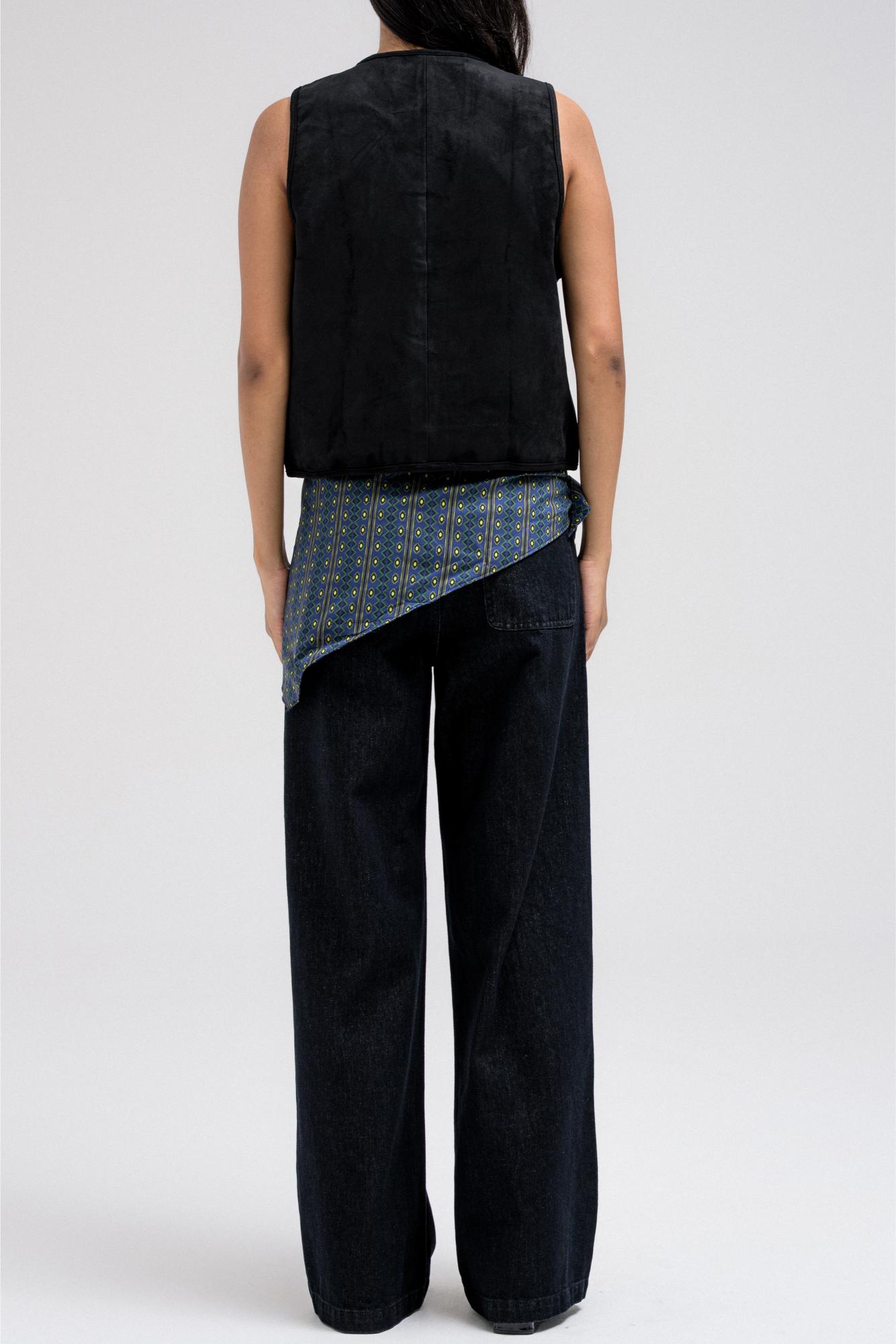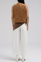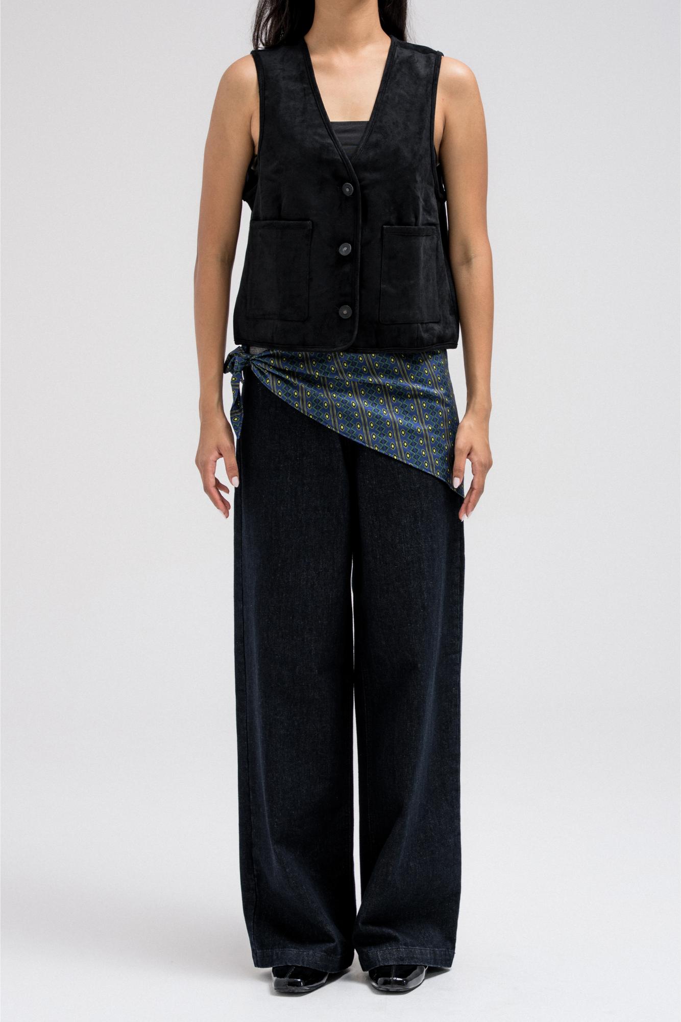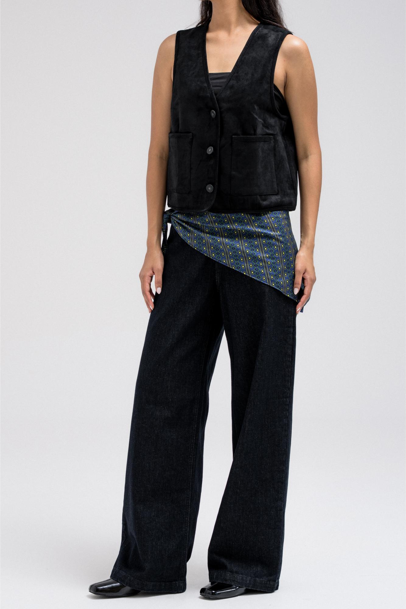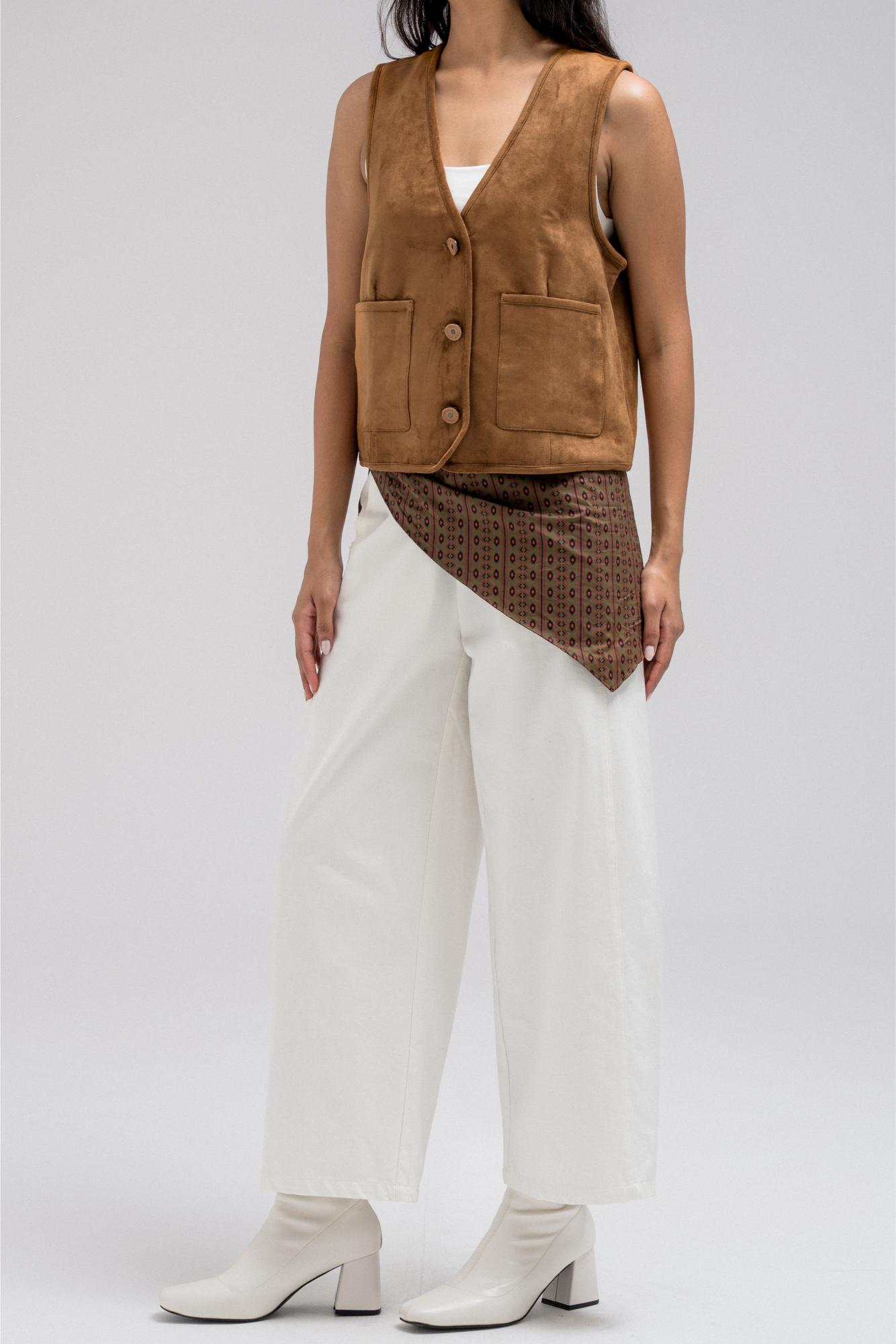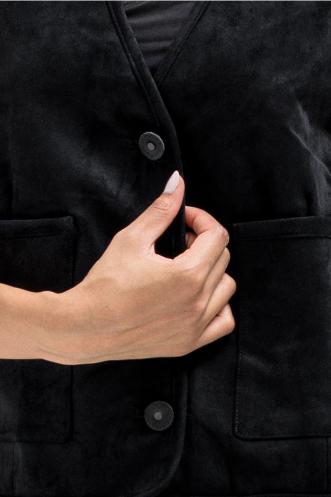 A timeless layering piece crafted from soft suede material, featuring front button closure and functional pockets. The inner lining reveals a subtle printed pattern that adds depth and character to the design. Pair it with the matching printed scarf for a coordinated and effortlessly chic look.