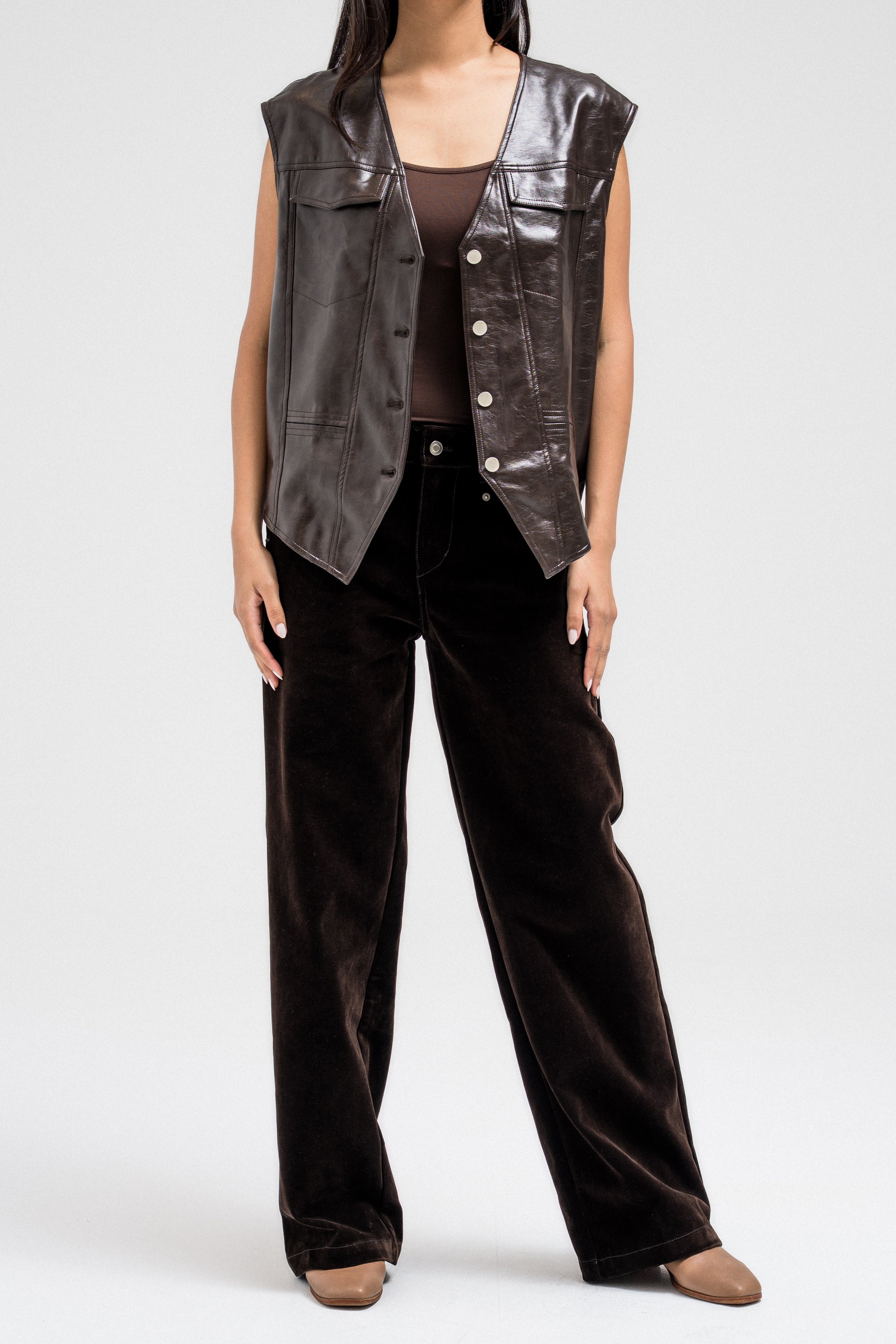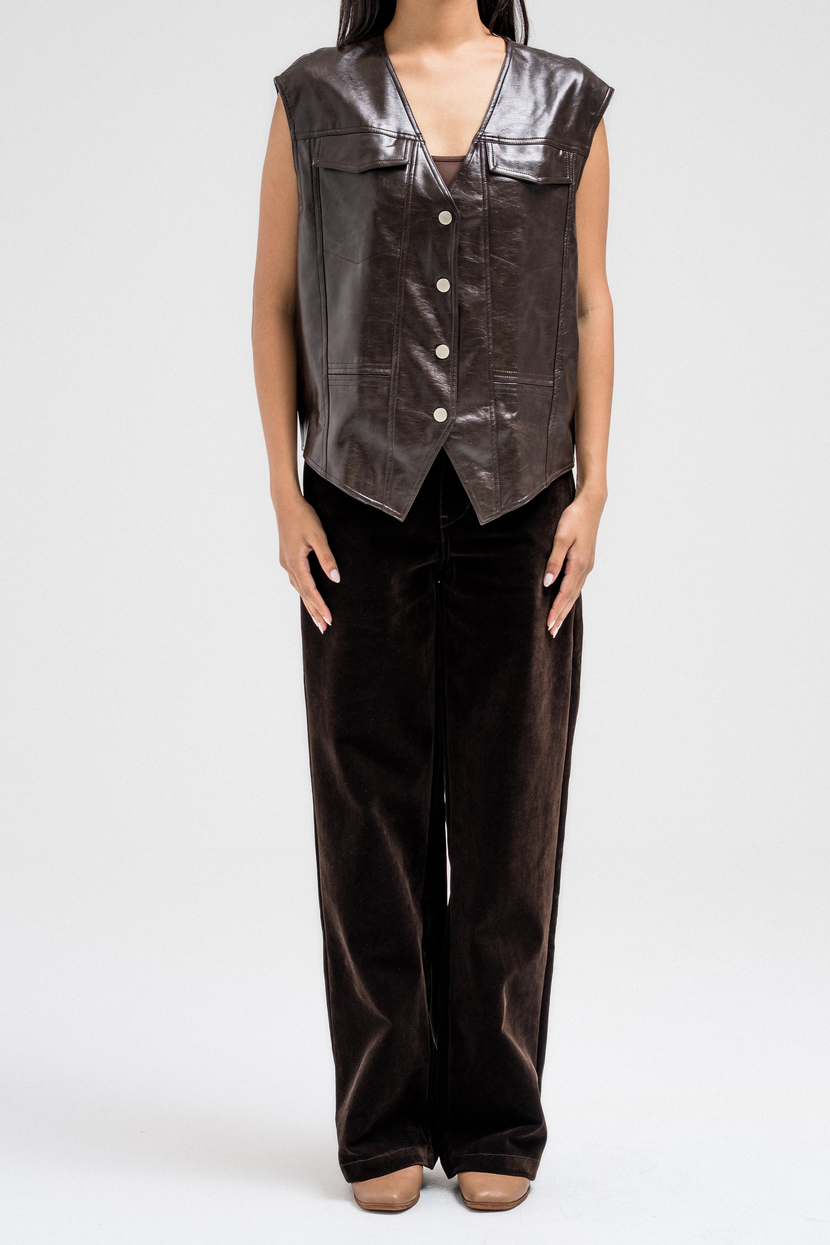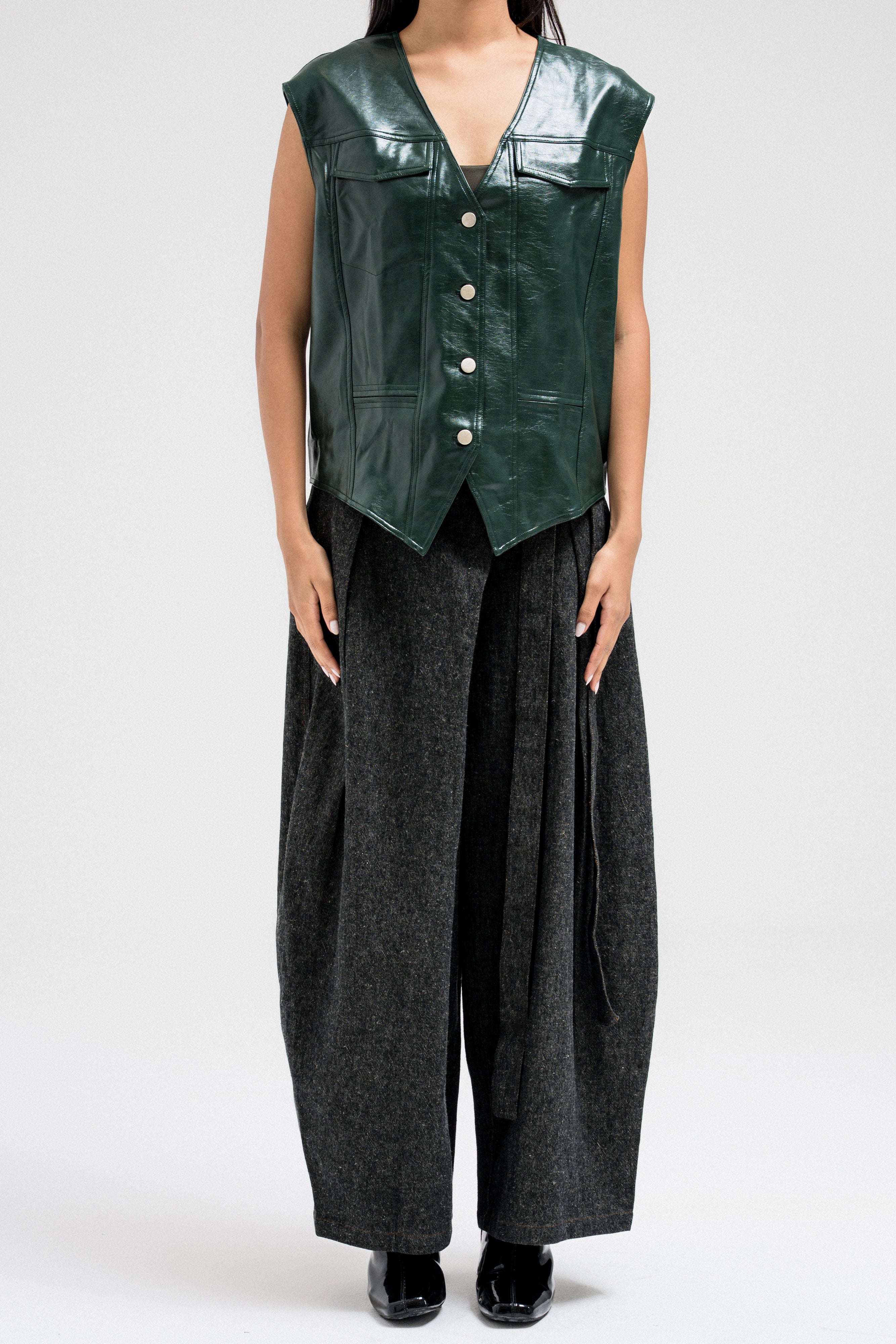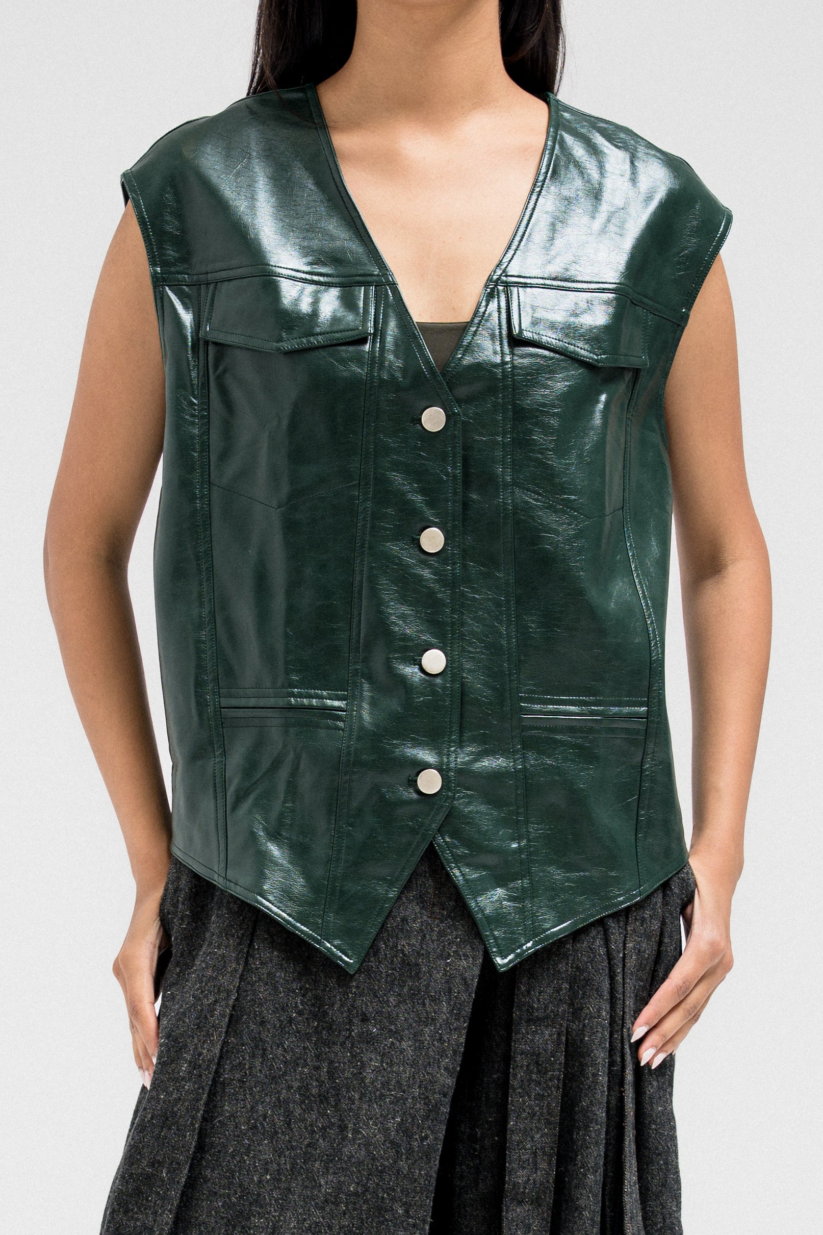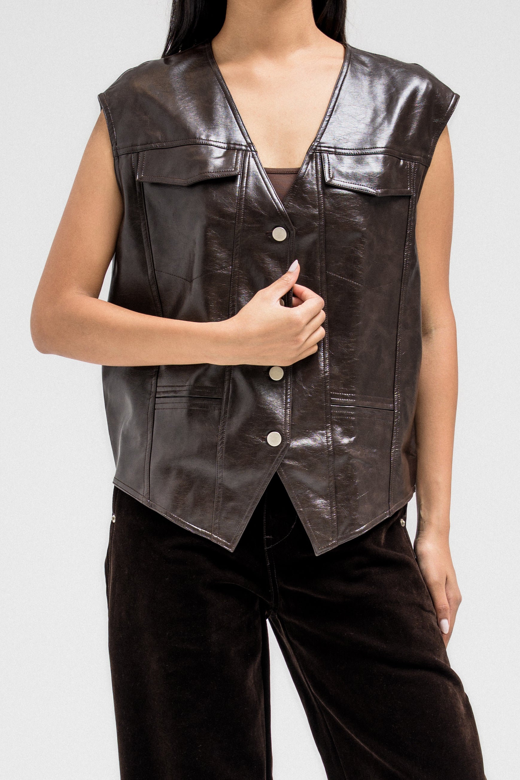 Sleek leather vest featuring a front button closure and a refined V-neck design. The glossy finish adds a bold touch, making it ideal for layering over shirts or dresses for a chic, edgy statement.