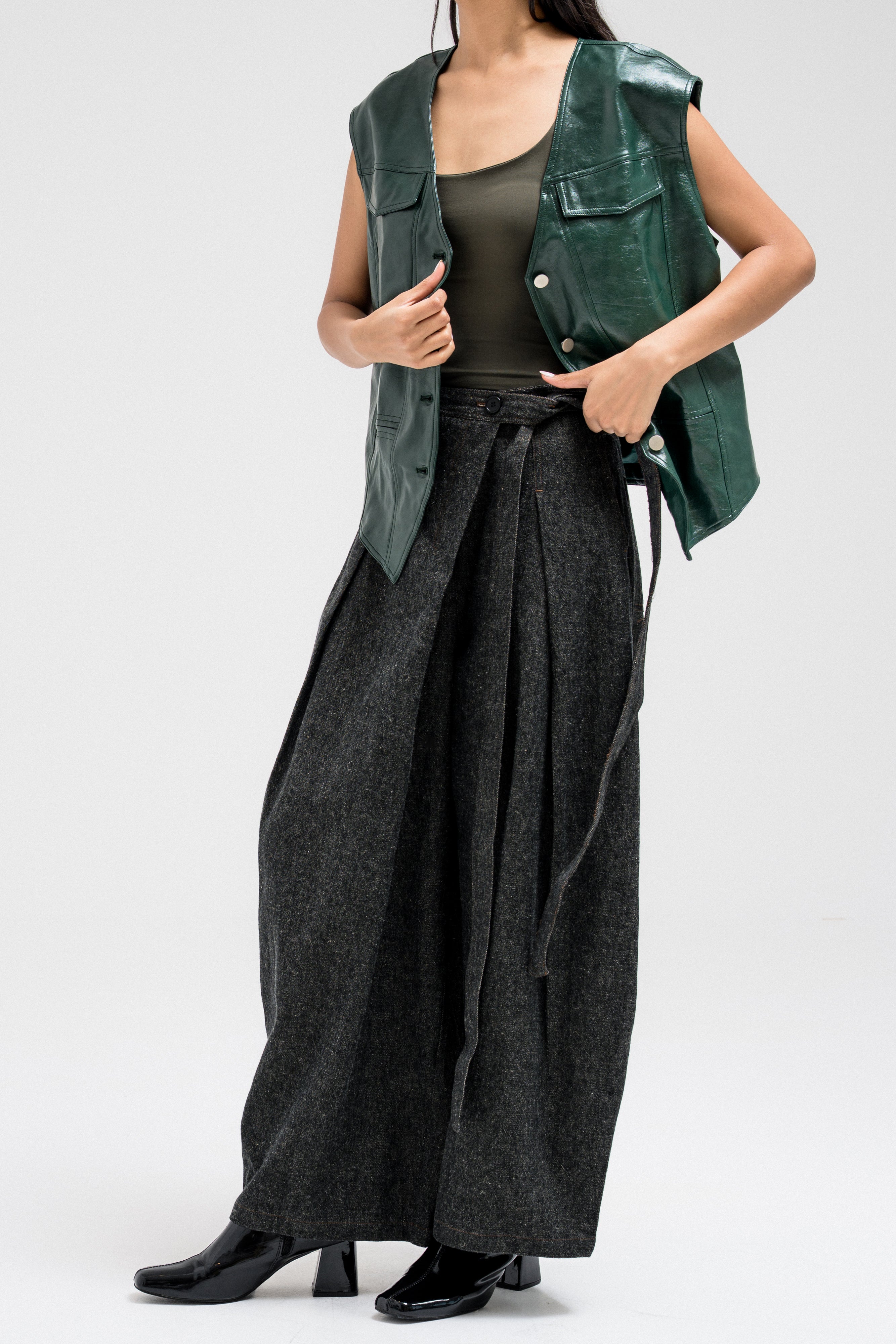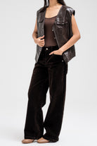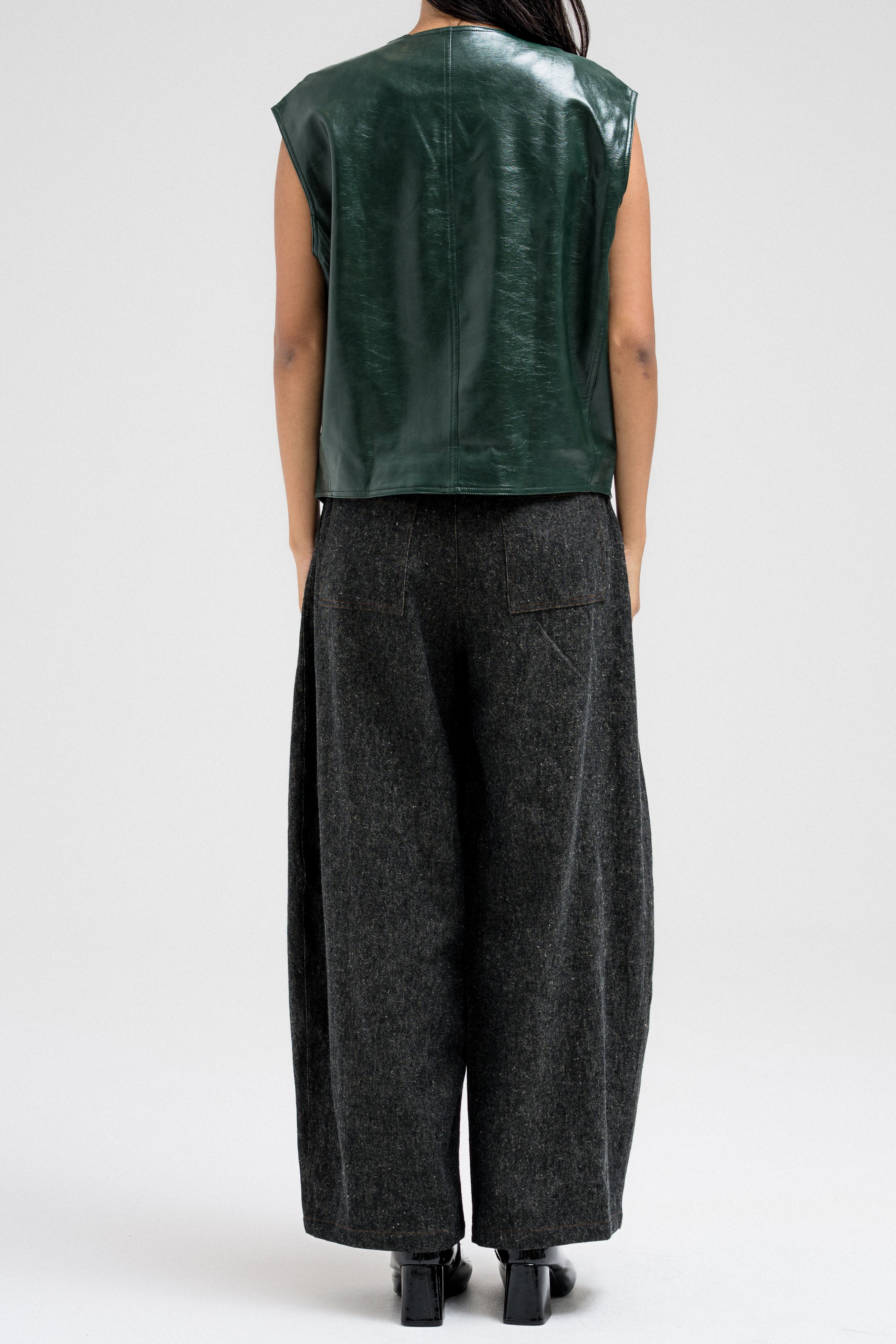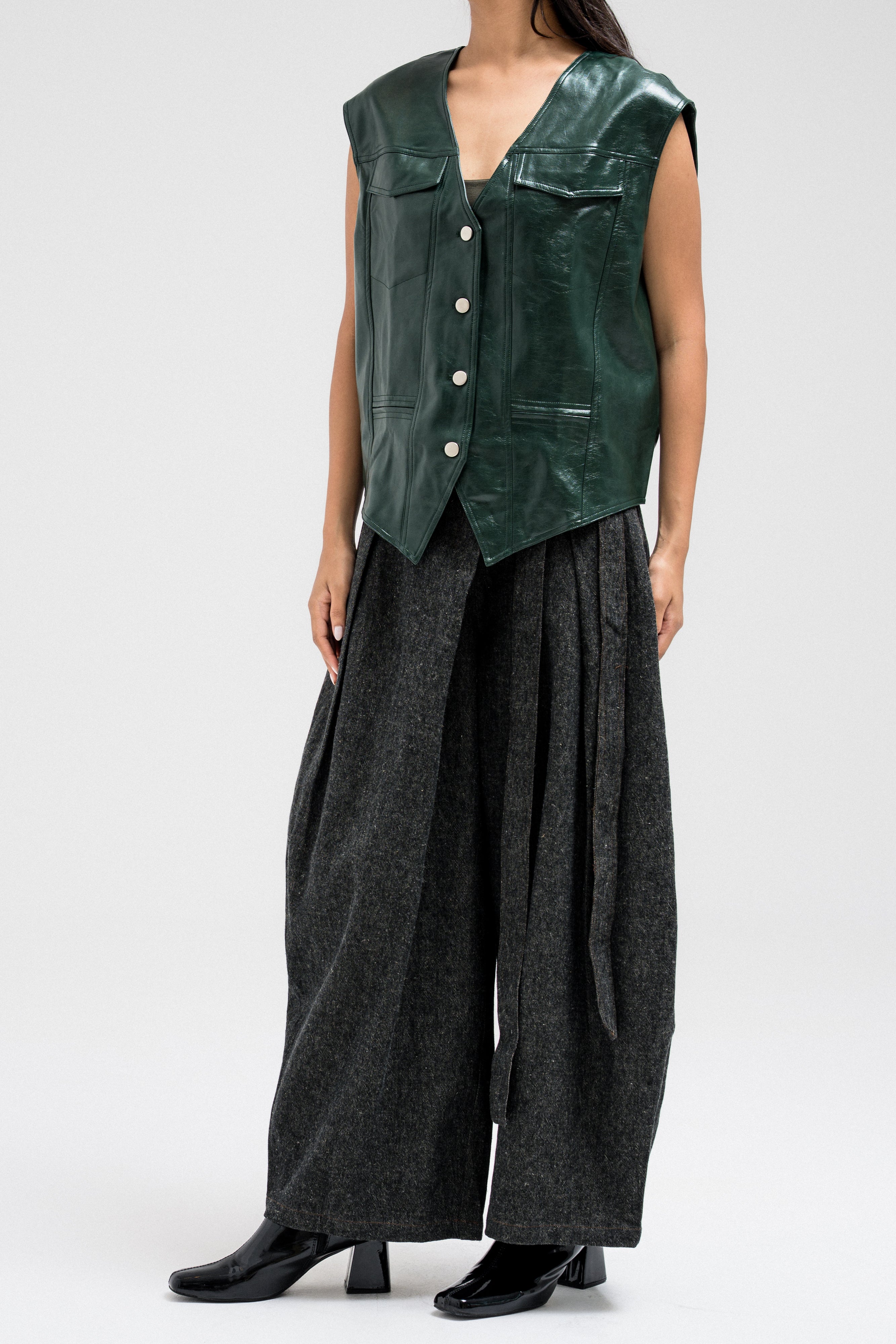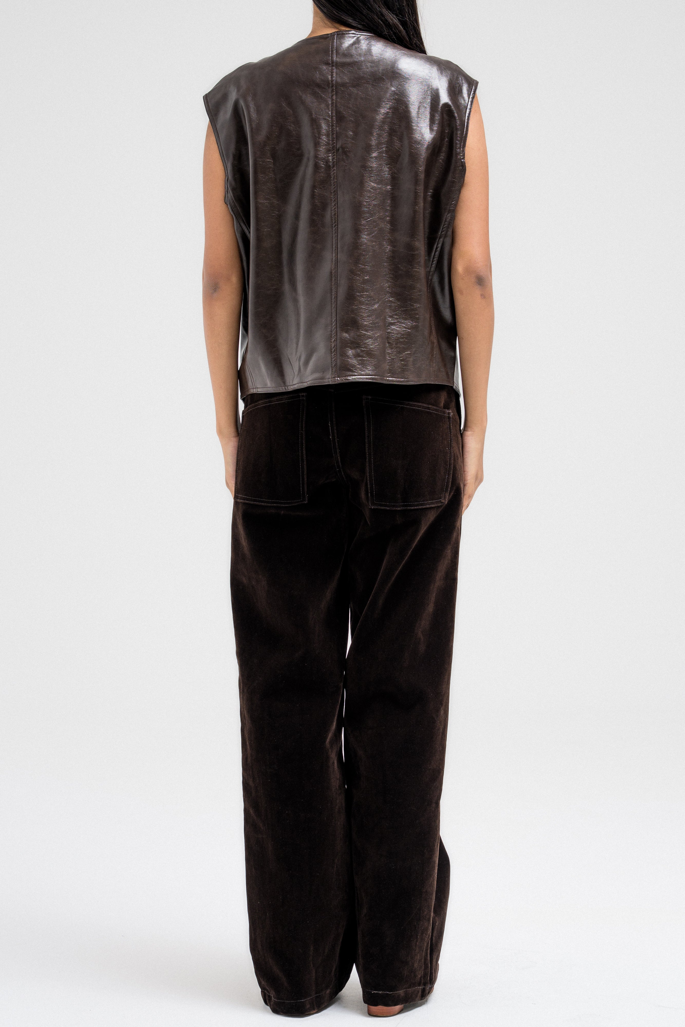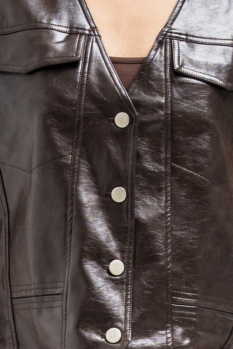 Sleek leather vest featuring a front button closure and a refined V-neck design. The glossy finish adds a bold touch, making it ideal for layering over shirts or dresses for a chic, edgy statement.