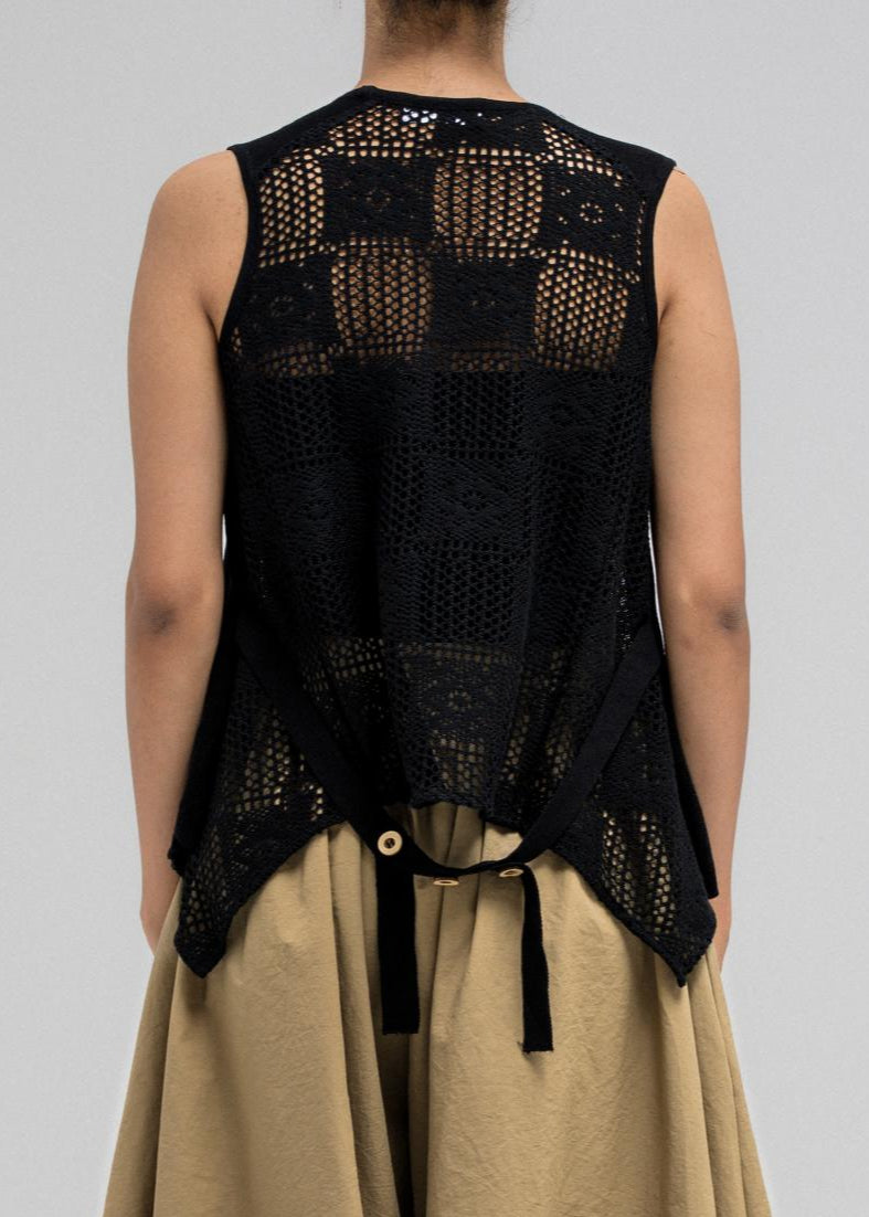 This vest blends a classic front look with a unique twist at the back. It features a button-down front with a V neckline and a structured shape. The standout detail is the crochet mesh back, adding a breezy, stylish touch. The hem is slightly pointed for added dimension, and it includes a back tie belt to cinch and adjust the fit.
