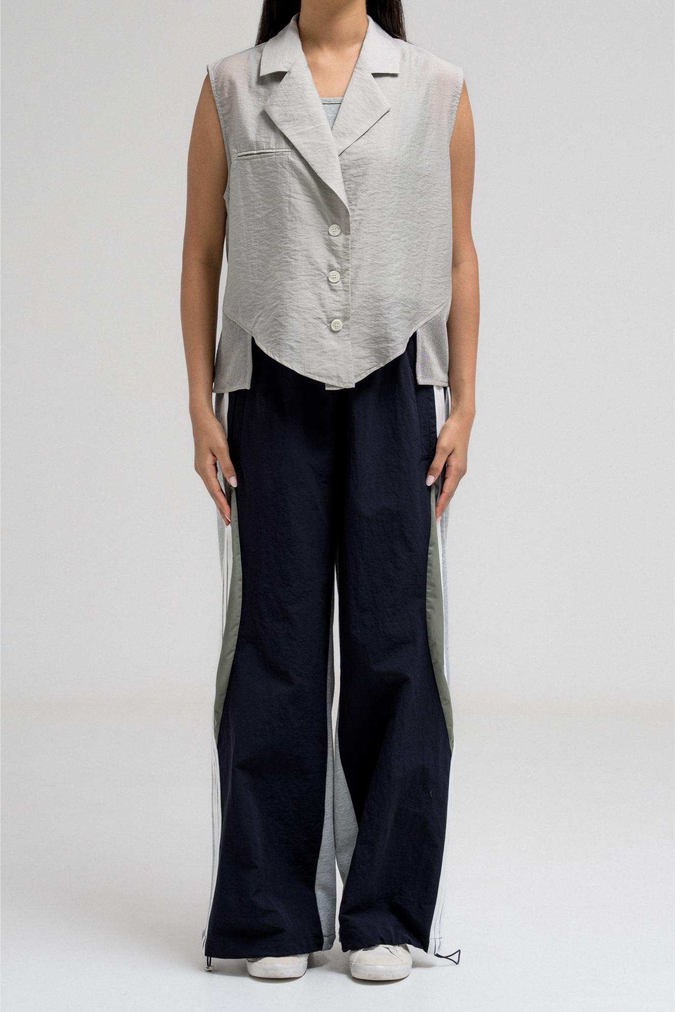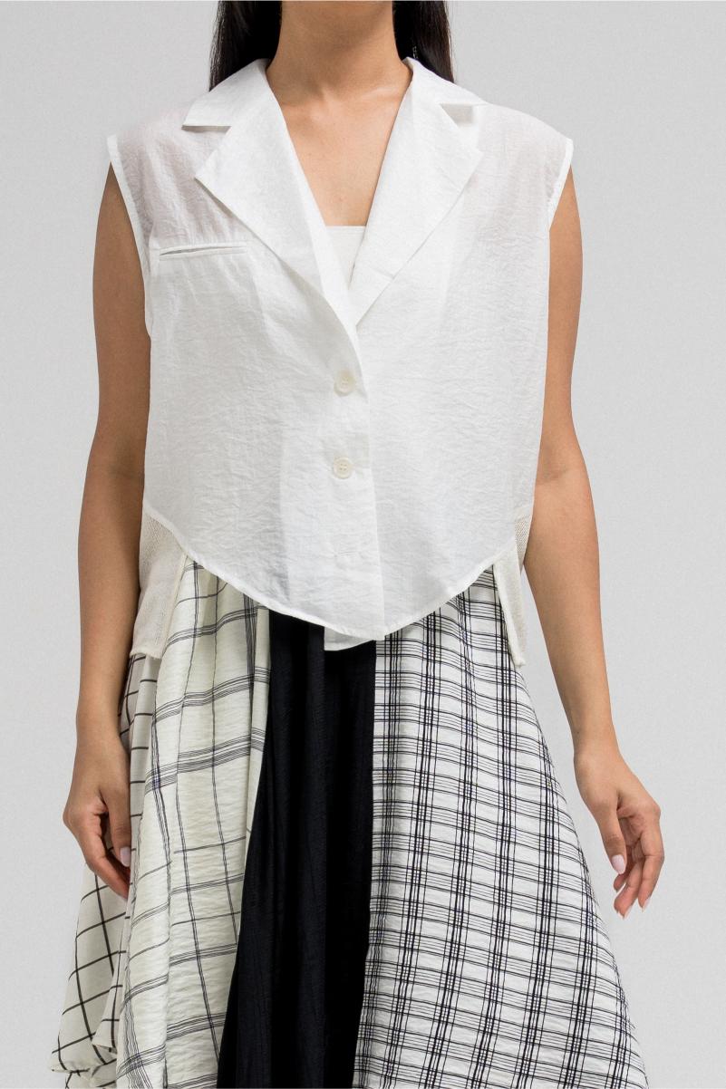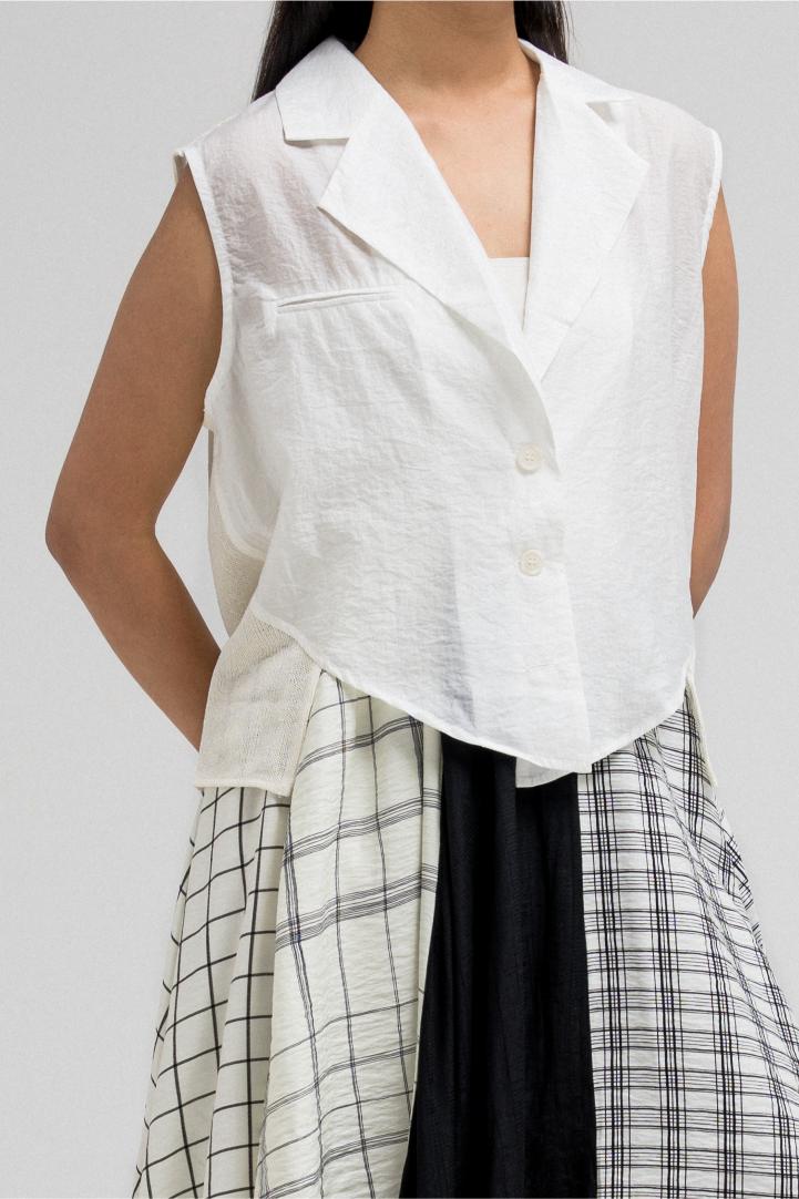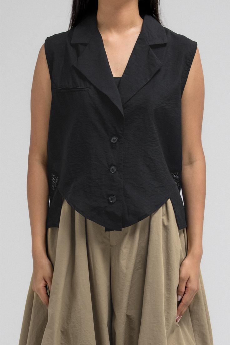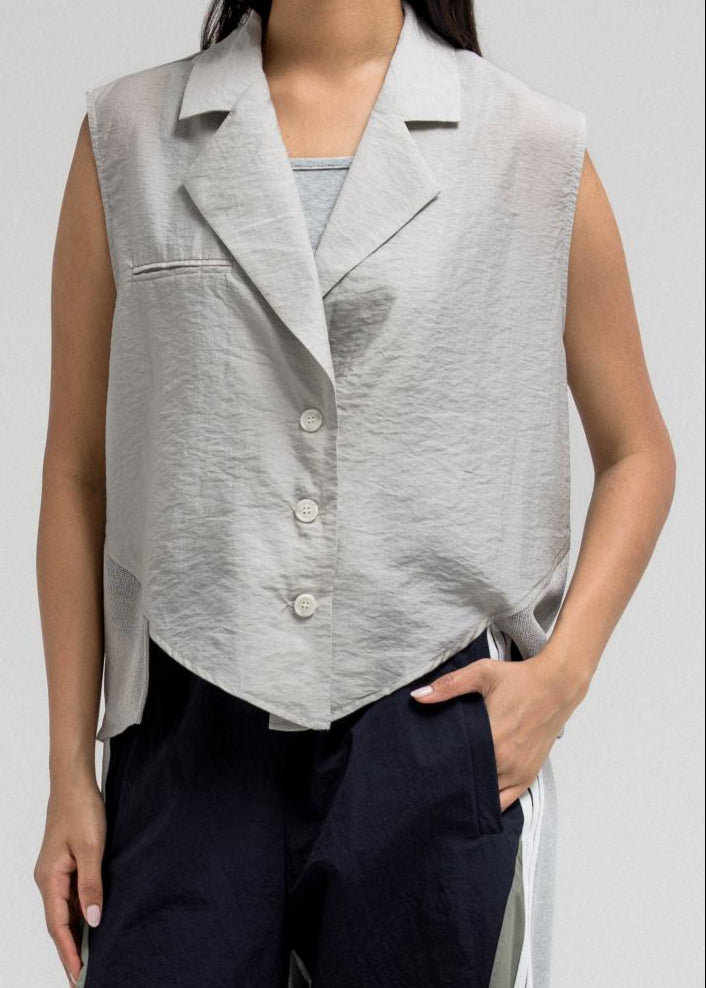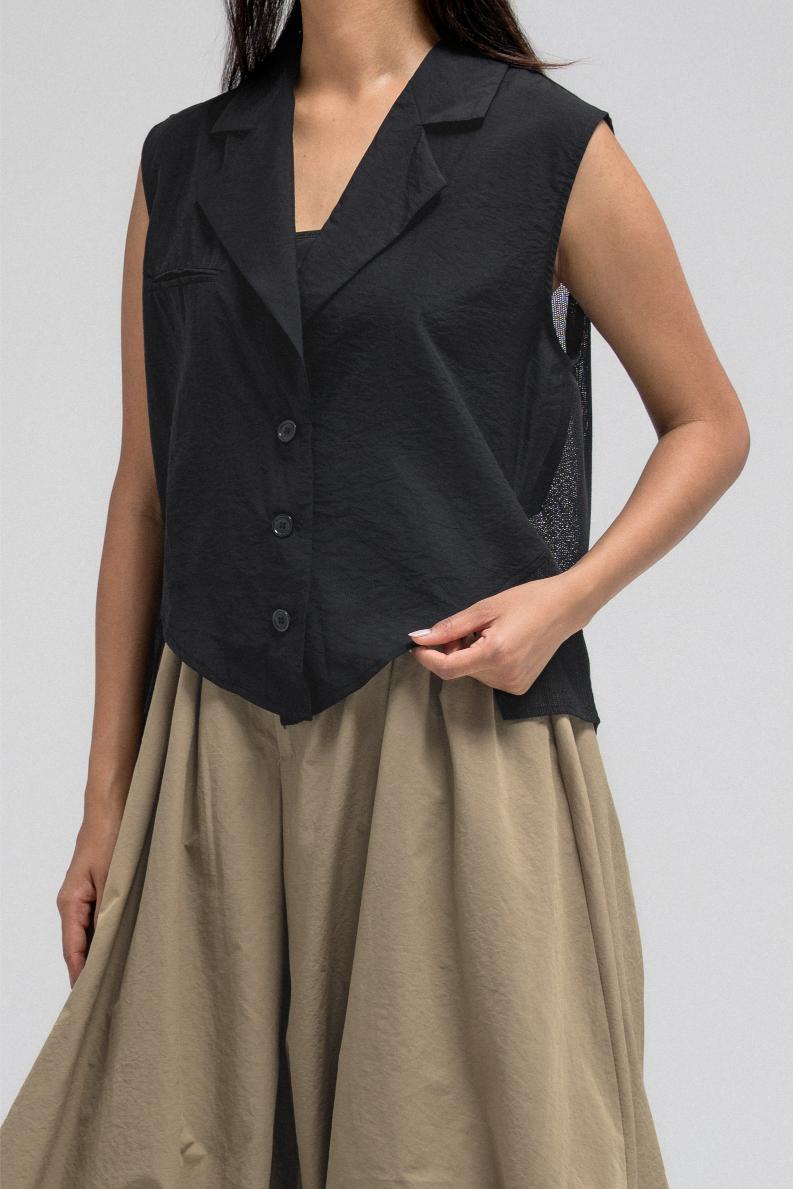 This sleeveless vest blends structure and softness with its light woven material at the front and sheer knit fabric at the back. The vest features a classic notched lapel collar for a tailored touch and includes a front button closure for easy layering