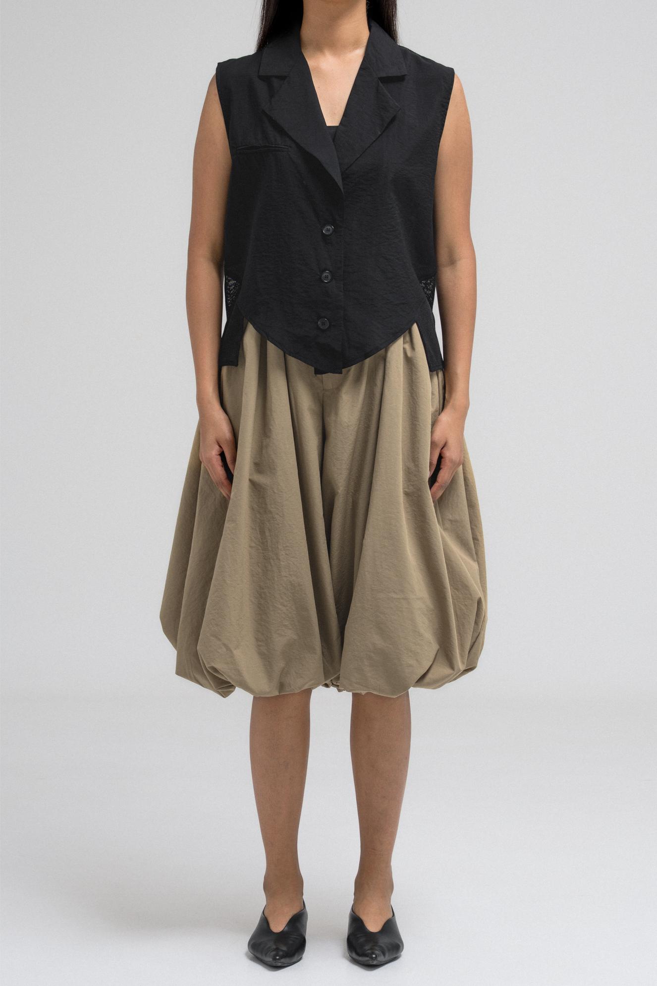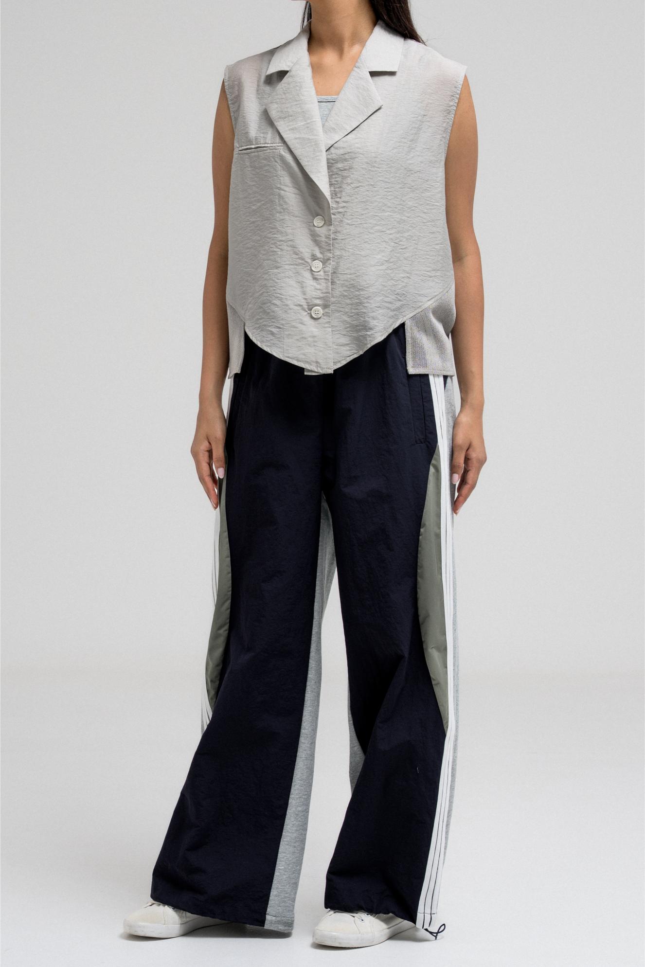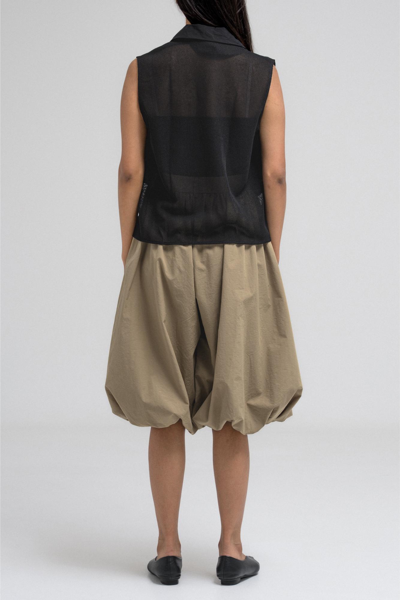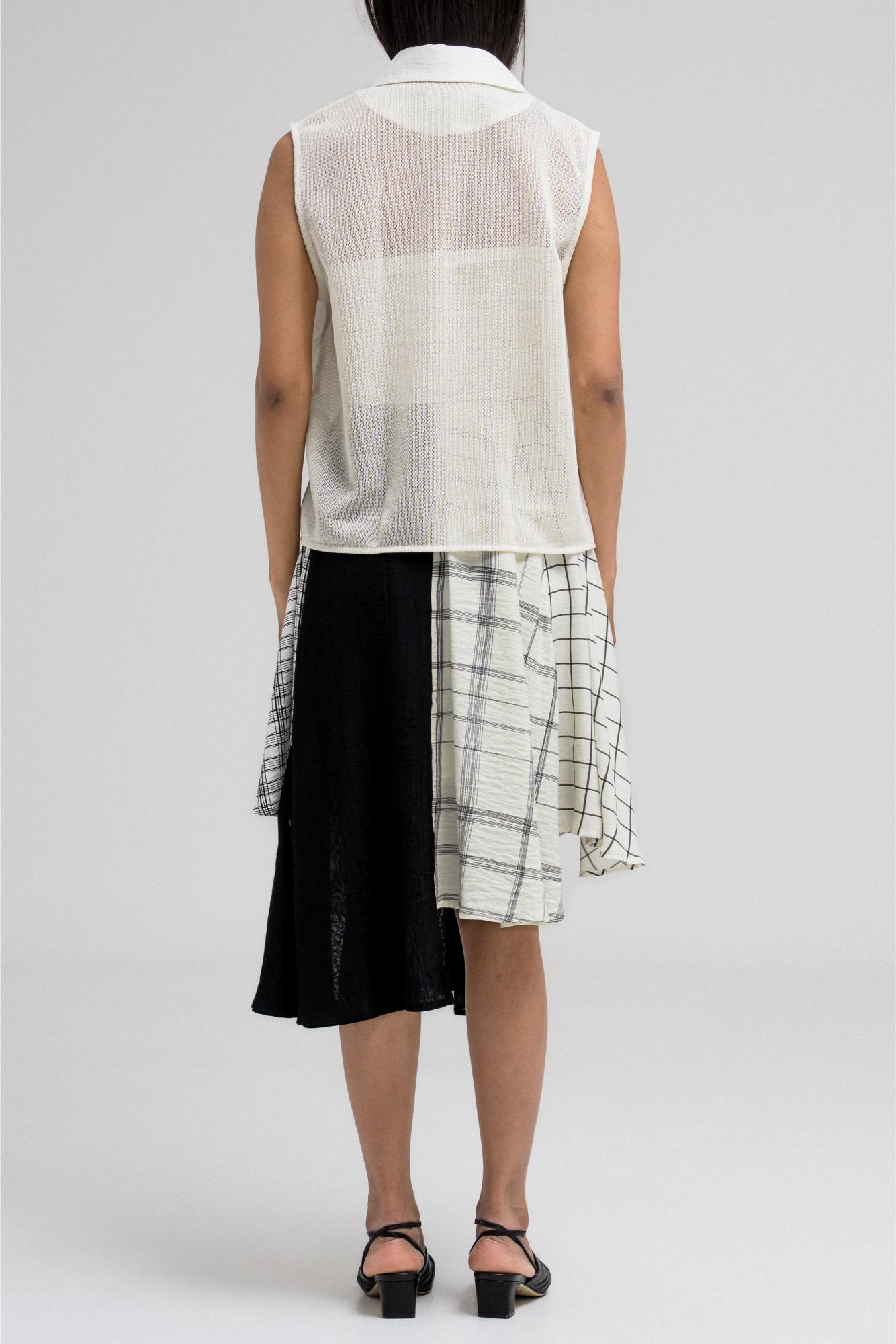 This sleeveless vest blends structure and softness with its light woven material at the front and sheer knit fabric at the back. The vest features a classic notched lapel collar for a tailored touch and includes a front button closure for easy layering