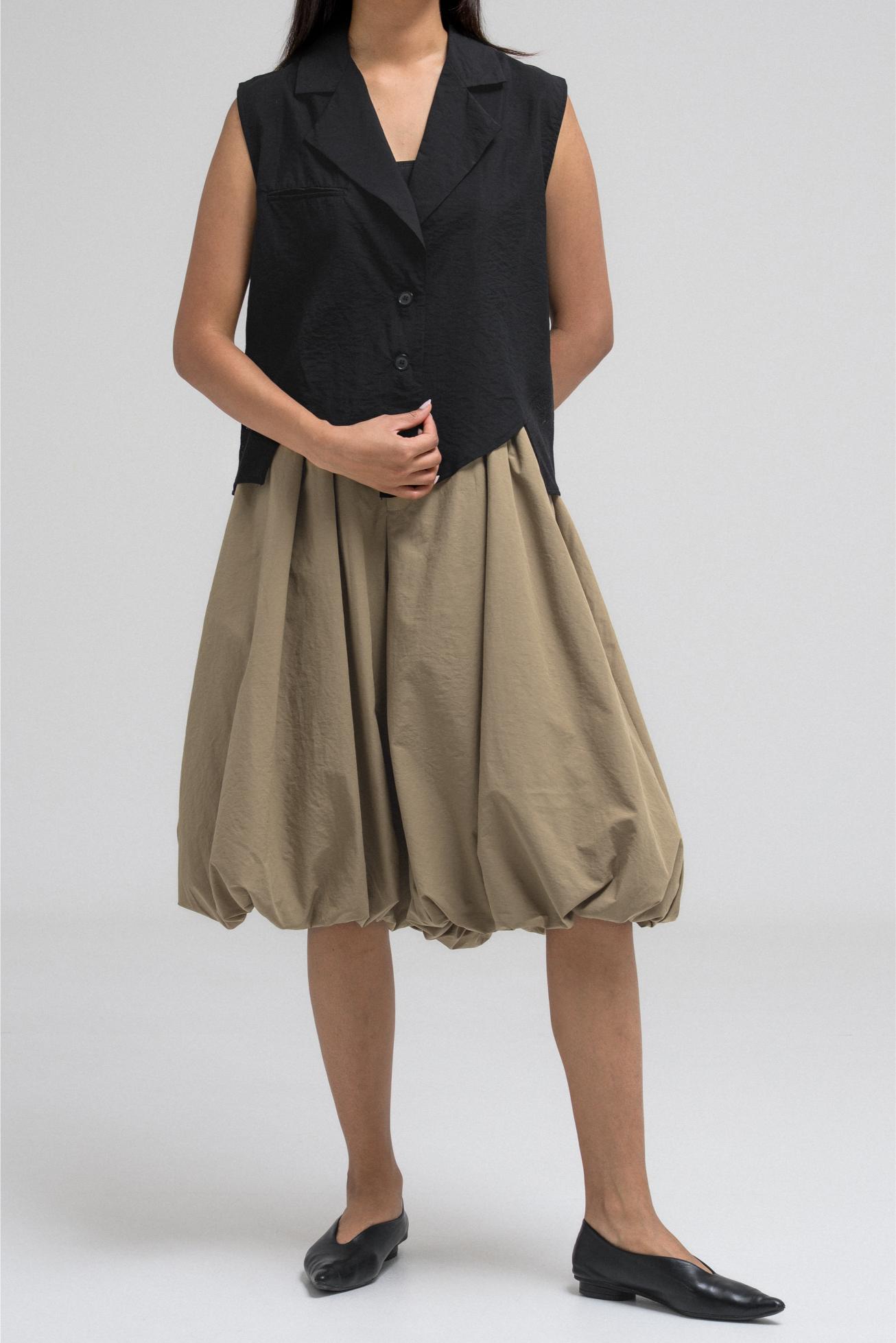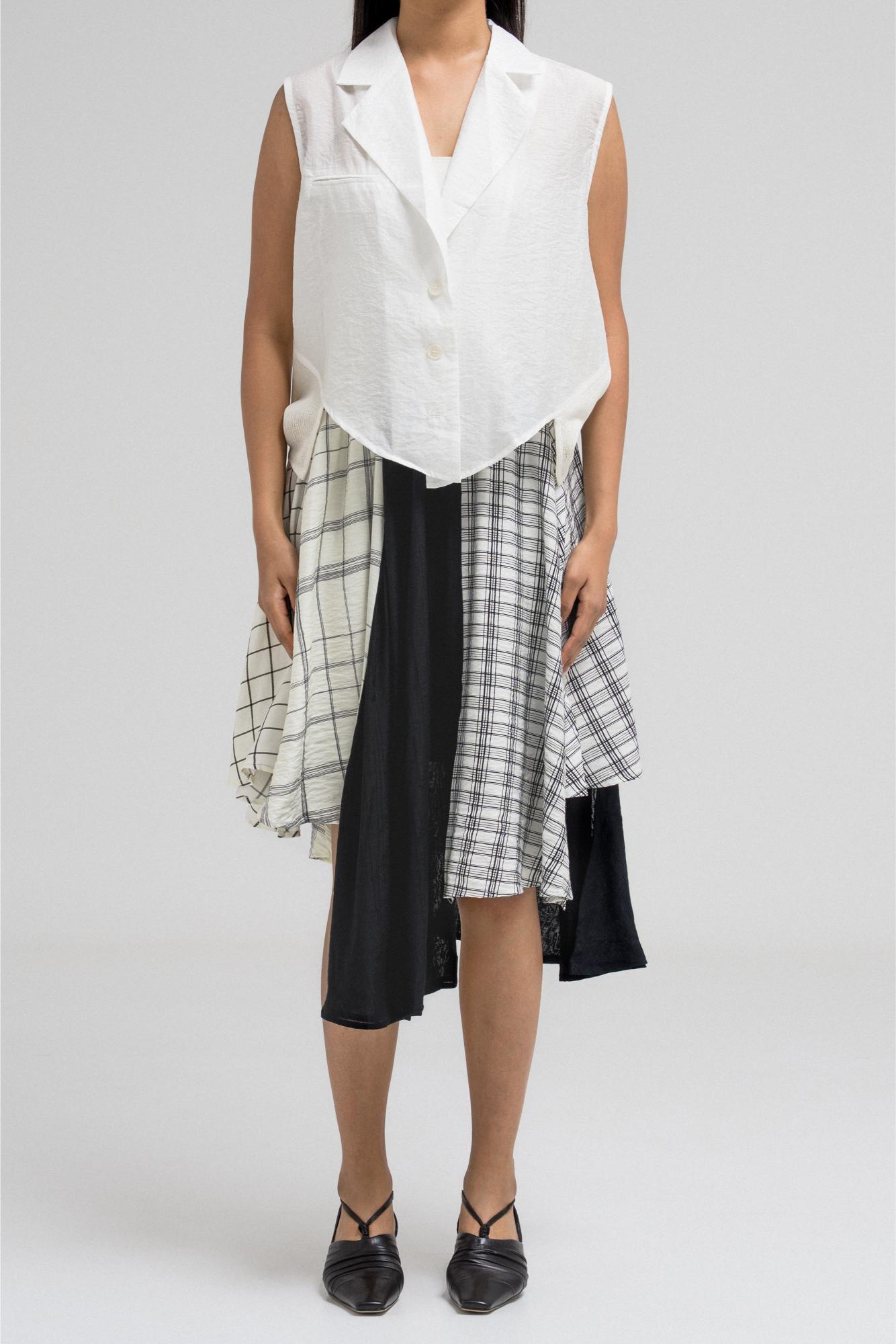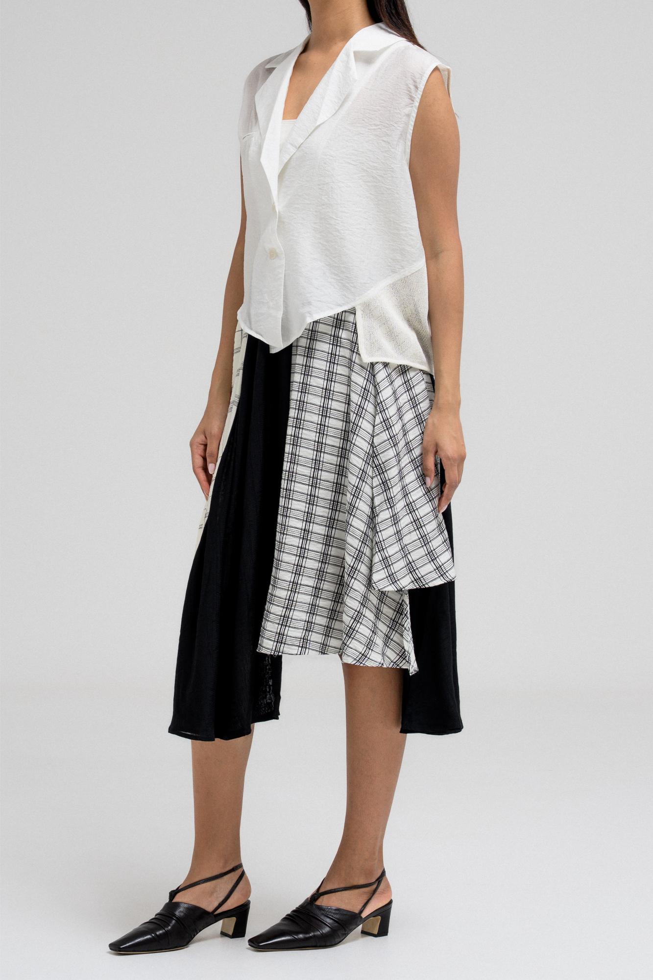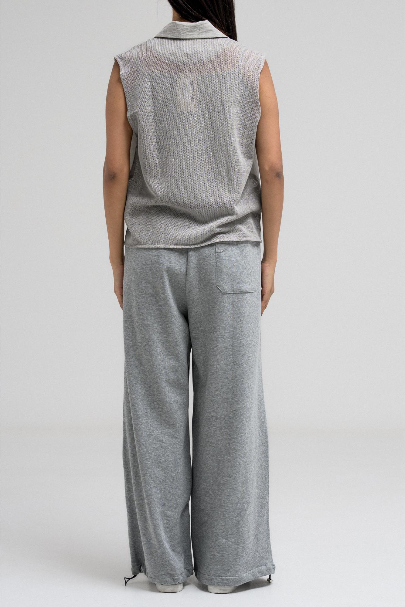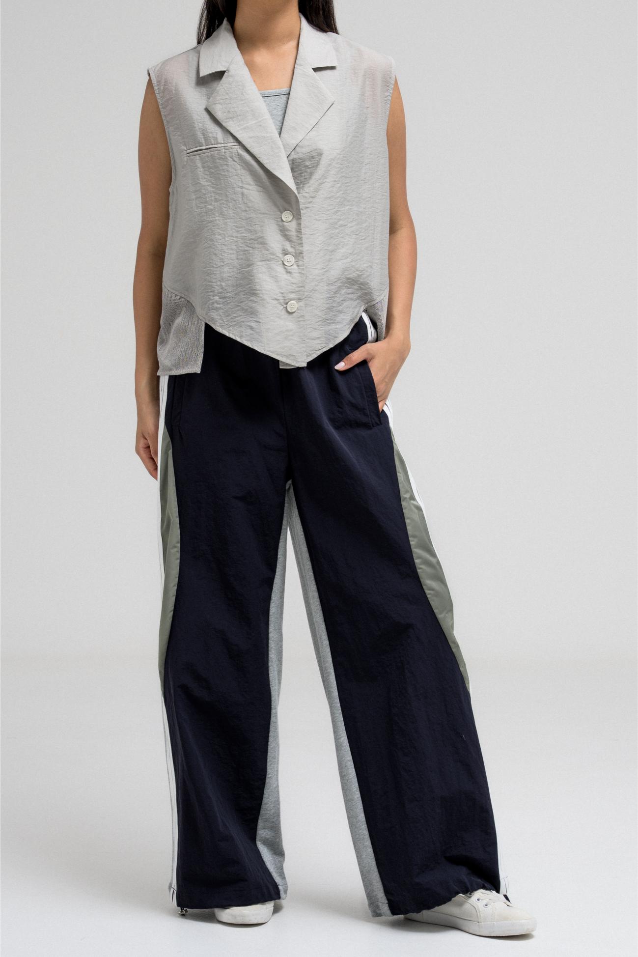 This sleeveless vest blends structure and softness with its light woven material at the front and sheer knit fabric at the back. The vest features a classic notched lapel collar for a tailored touch and includes a front button closure for easy layering