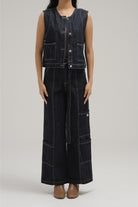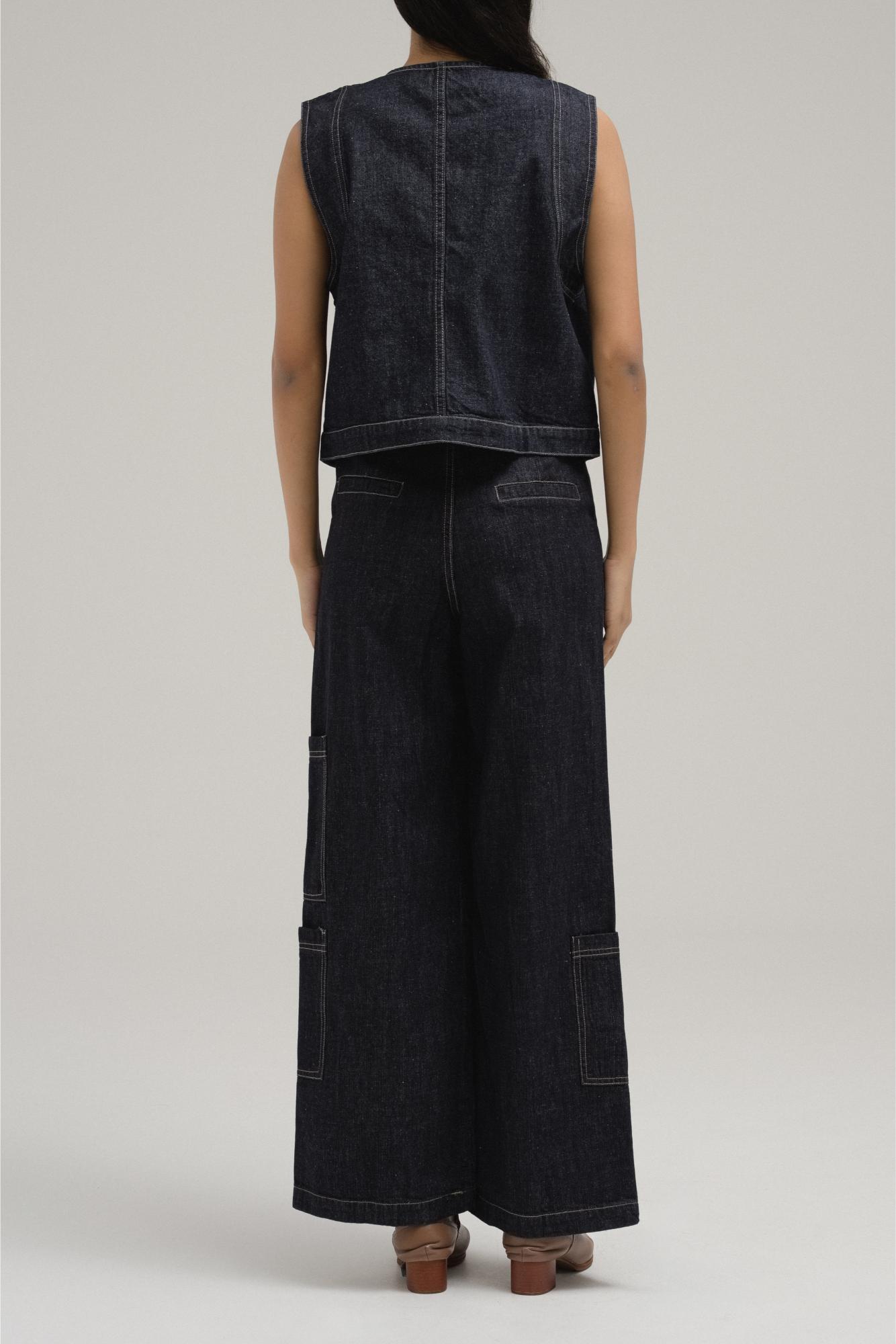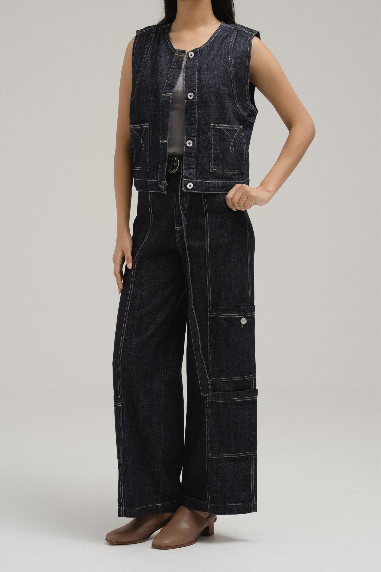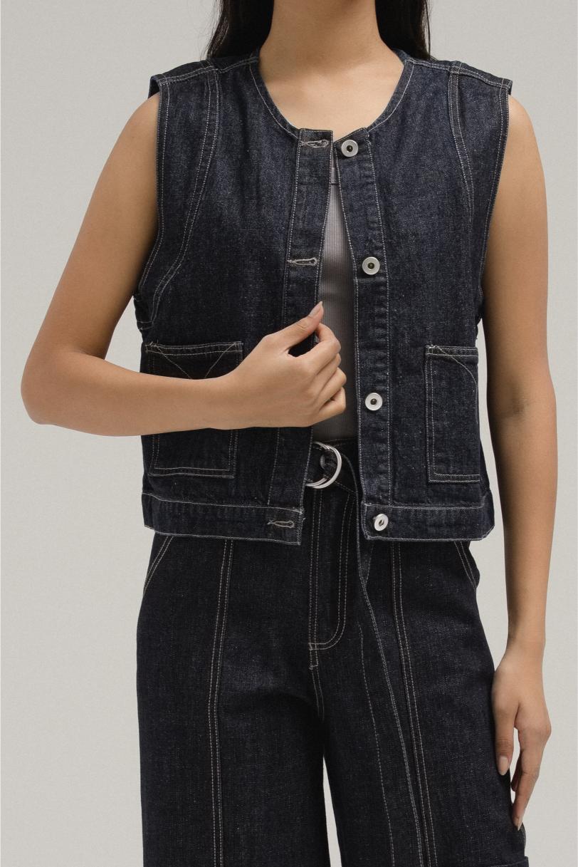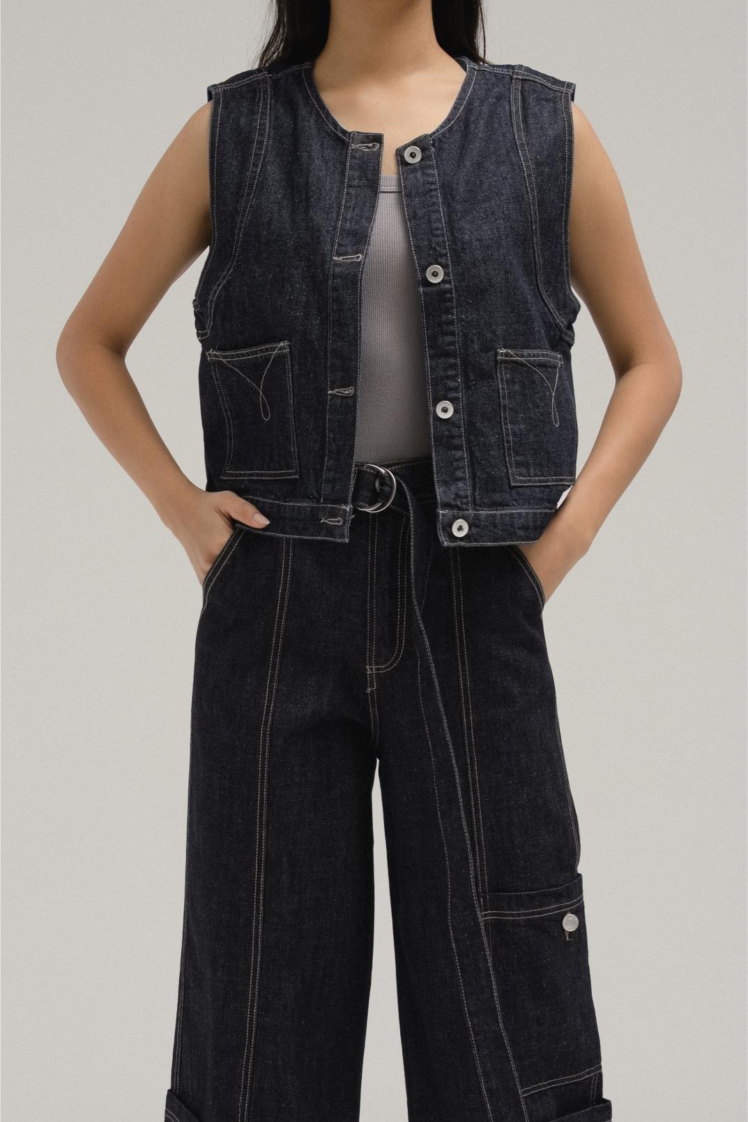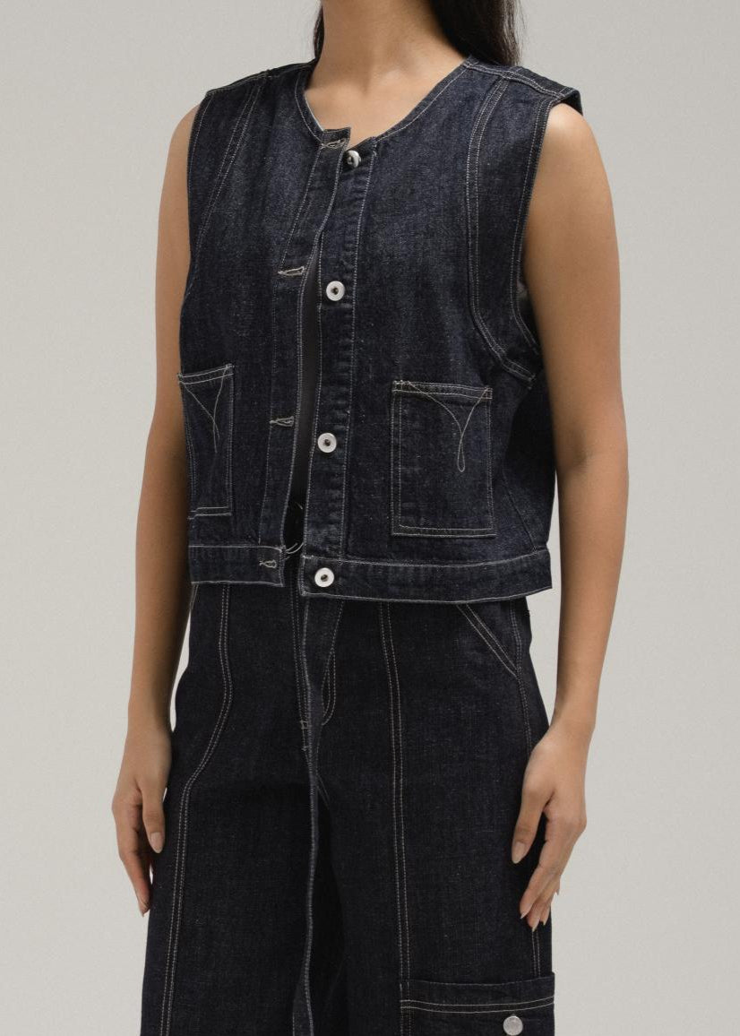 This denim vest blends casual structure with functional style. It features a sleeveless cut, round neckline, and front button closure, finished with contrast stitching and utility-inspired pocket details. Designed for layering, it’s versatile on its own or styled over a long-sleeve top. Pairs perfectly with the matching denim pants for a coordinated full look.