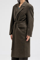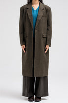 Elegant long-line coat with a clean tailored silhouette. Designed with a classic notched collar, front button closure, and straight sleeves for a refined finish. The coat features side pockets for a sleek look and practical comfort.