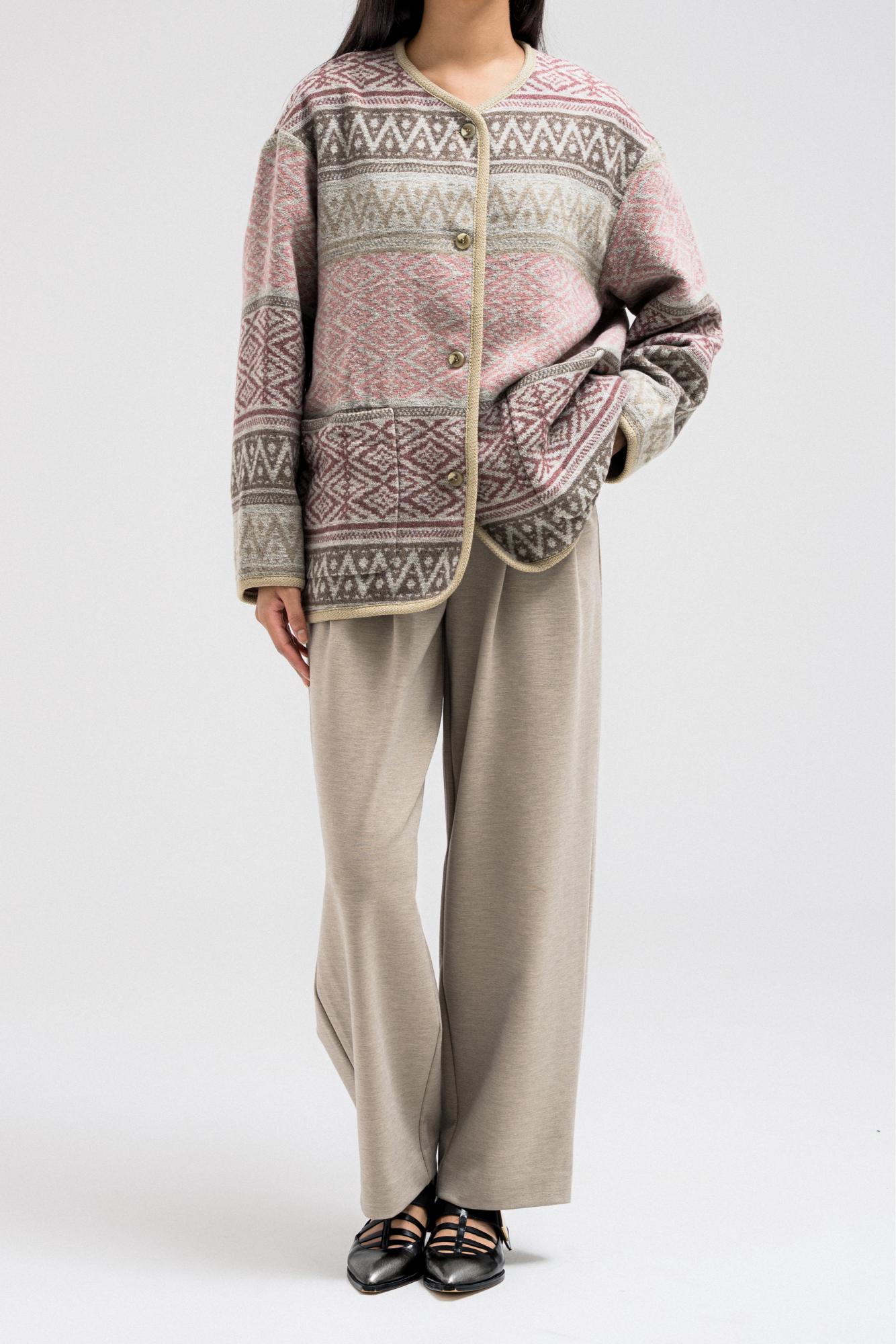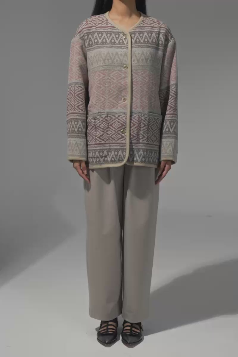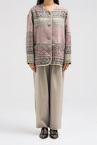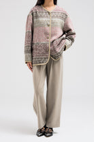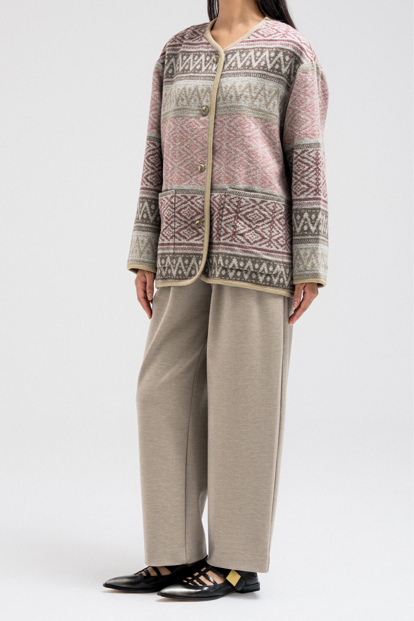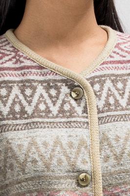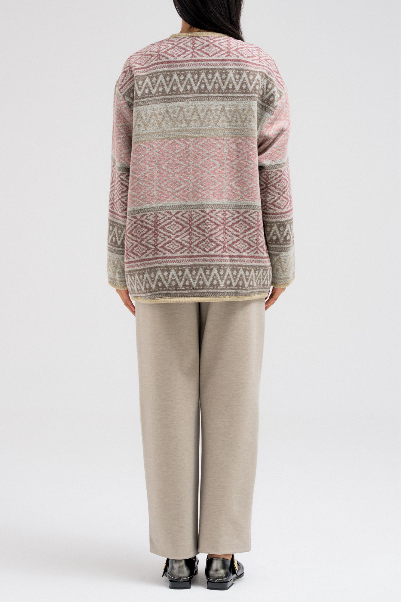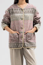 A cozy cardigan-style jacket with a soft knit feel and front button closure. The design features a geometric woven pattern made up of zigzags, diamonds, and horizontal bands, creating a warm, winter-inspired look. Its relaxed fit and detailed pattern make it easy to style with basics for an effortless, chic outfit.
