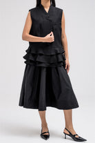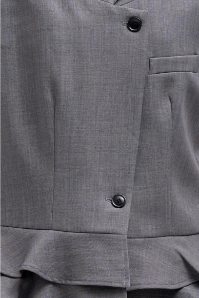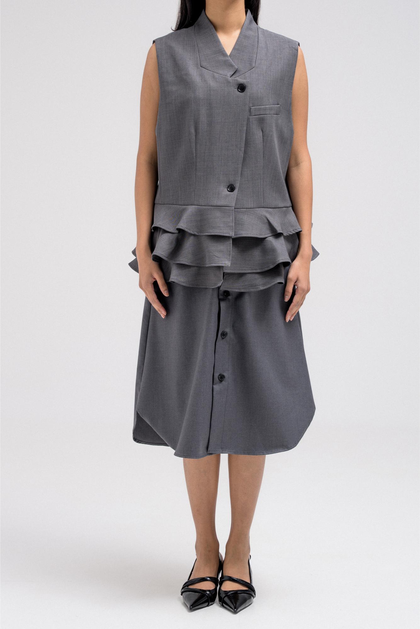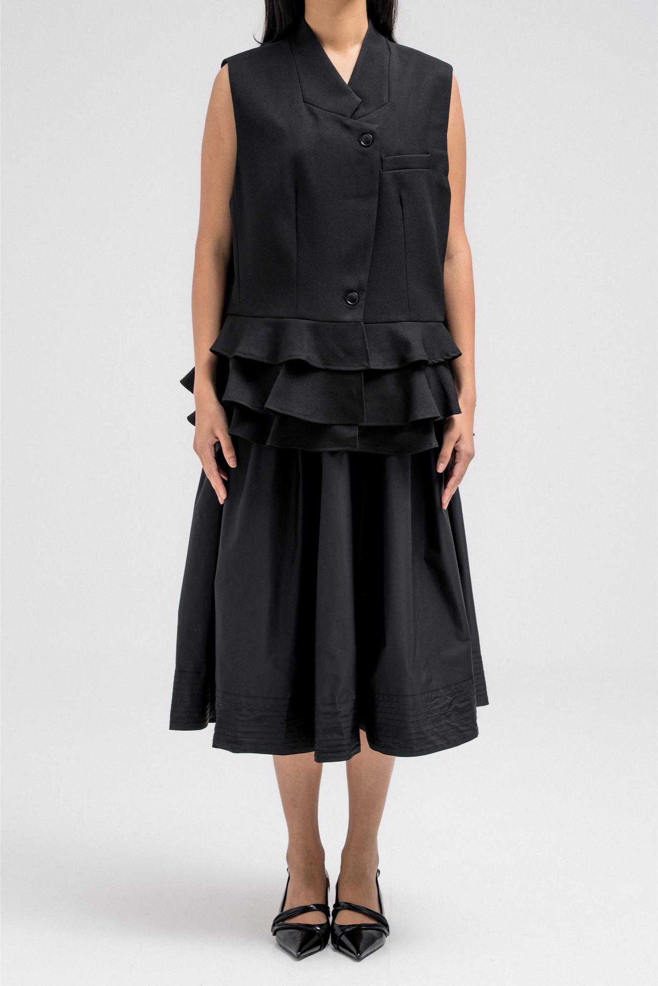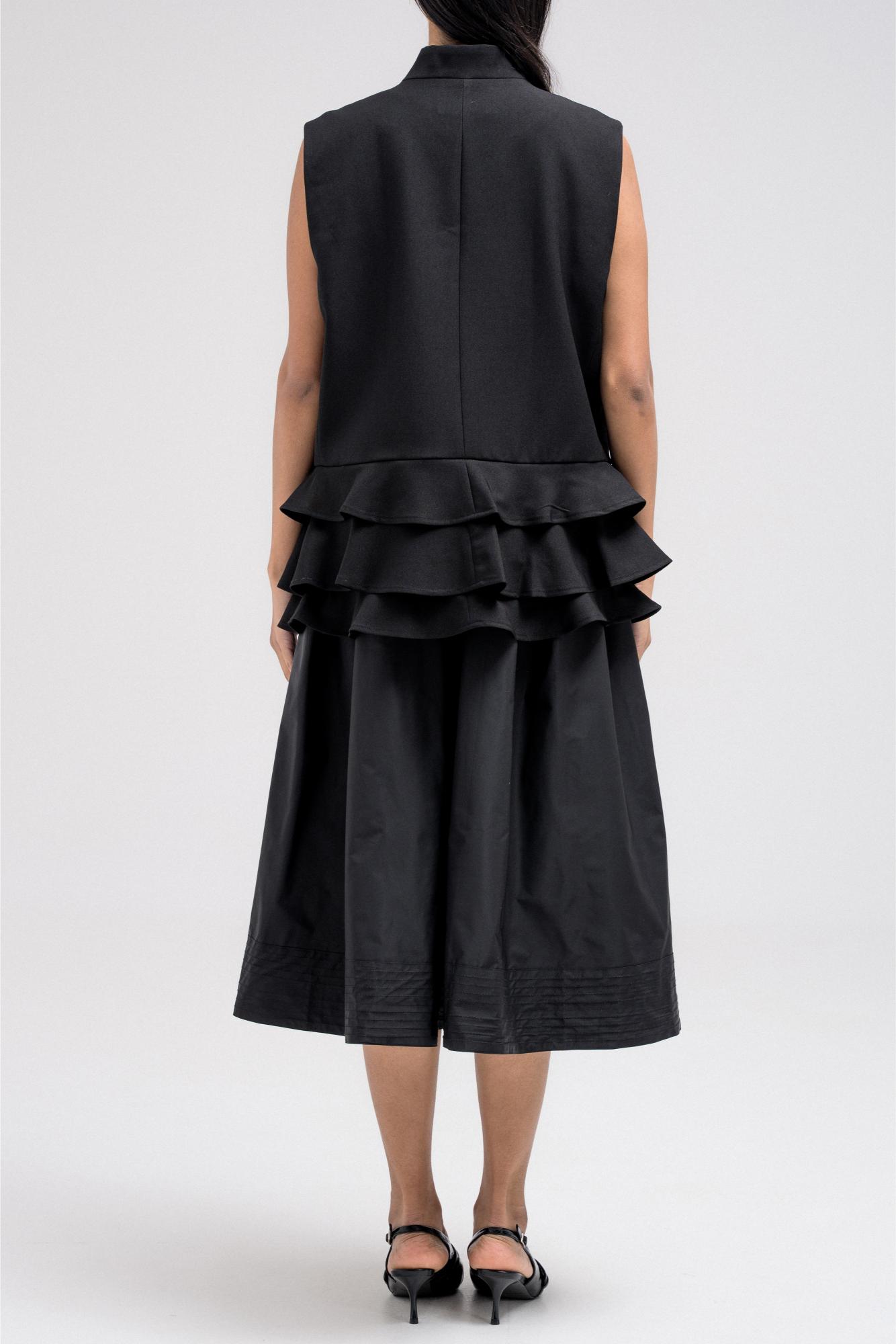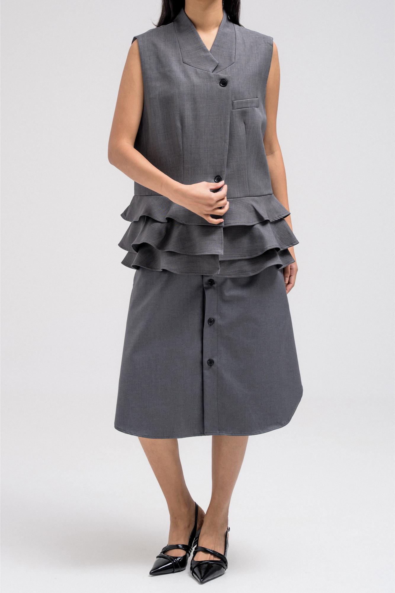 Tailored vest with a structured upper silhouette and statement ruffled hem detail that adds volume and movement. Designed with a sharp V-neckline, front button closure, and clean tailoring lines that balance structure with feminine flair. The layered ruffle hem creates a unique design element that elevates the classic vest style.