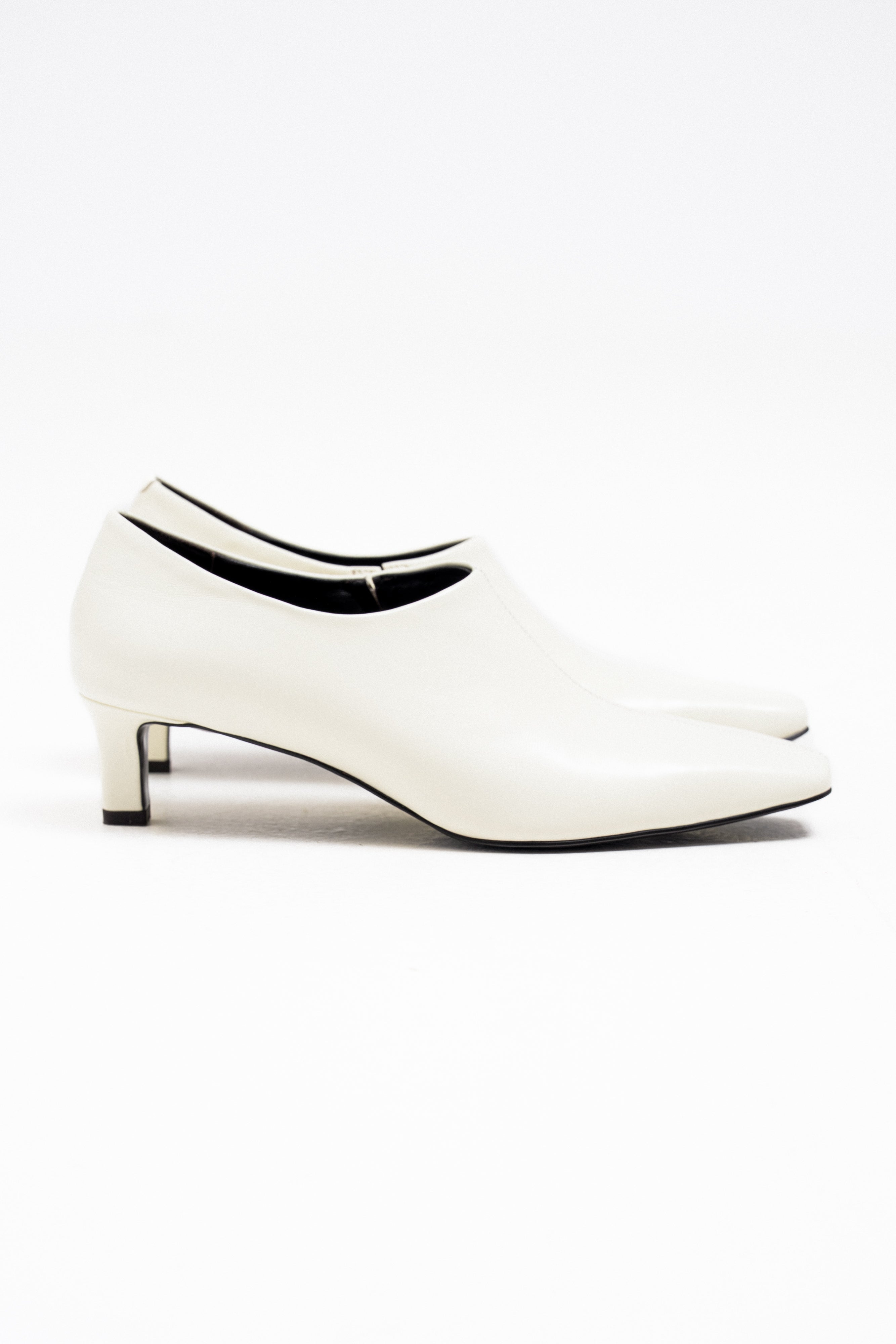 Chic pointed-toe heels crafted from smooth structured leather with a clean, minimal silhouette. Designed in a slip-on mule style with an open back, making them easy to wear while maintaining a refined look.