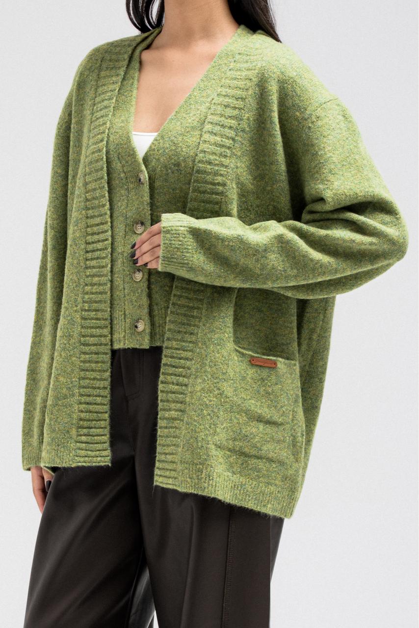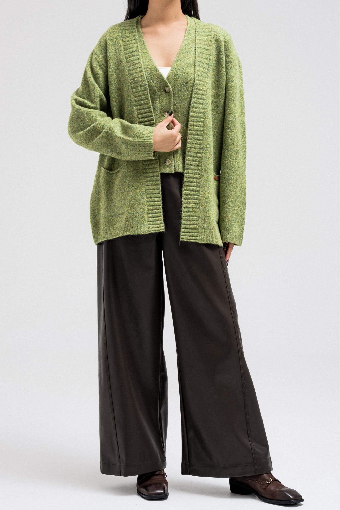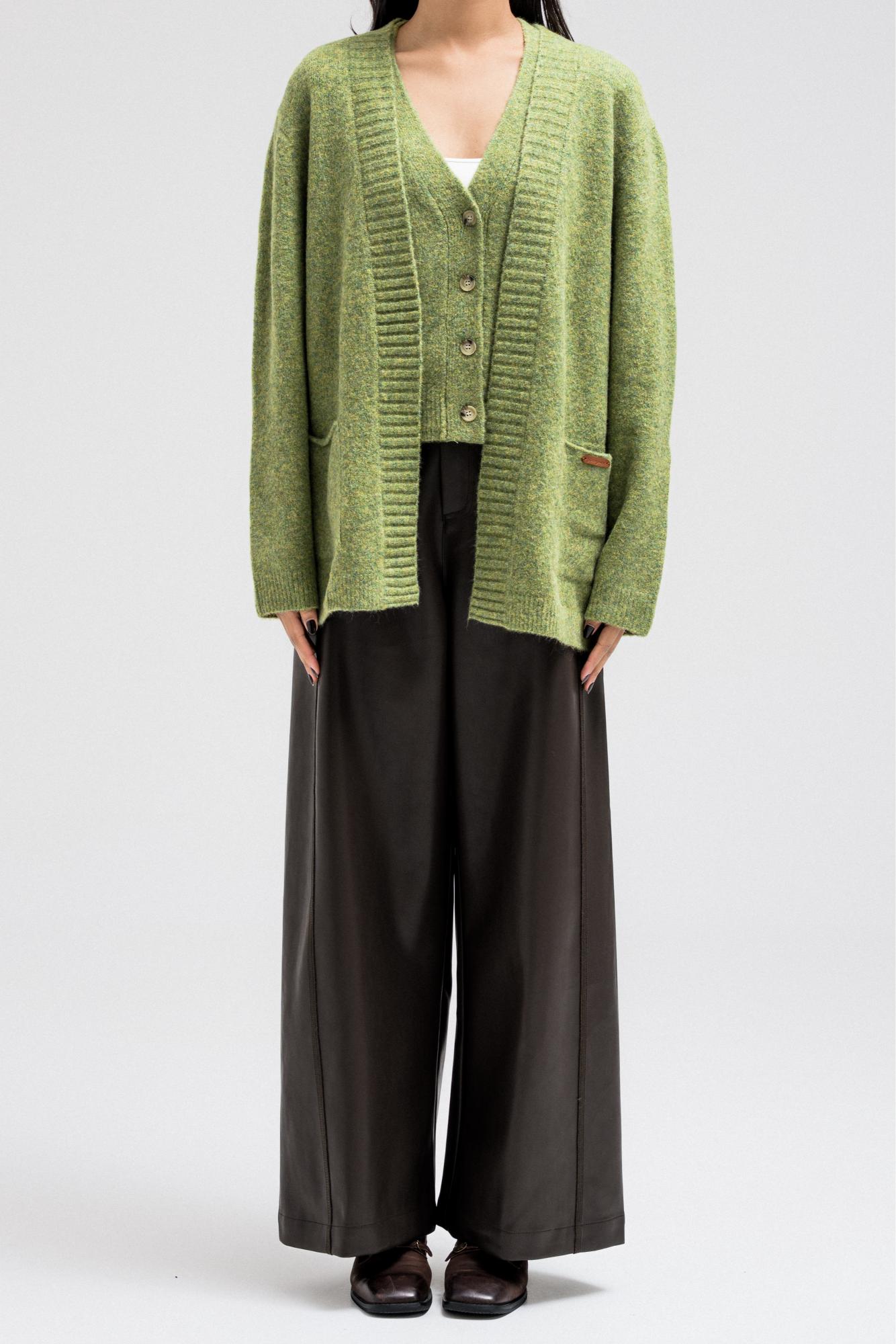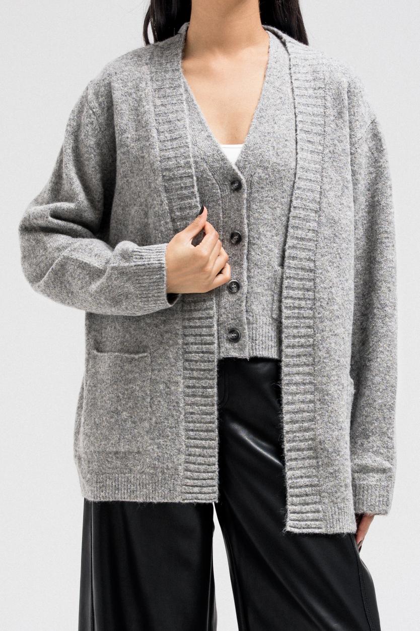 The inner vest comes with a clean V-neckline and front button closure, designed with small patch pockets for a soft, classic touch. The cardigan completes the look with a relaxed silhouette, ribbed edges, and front pockets.