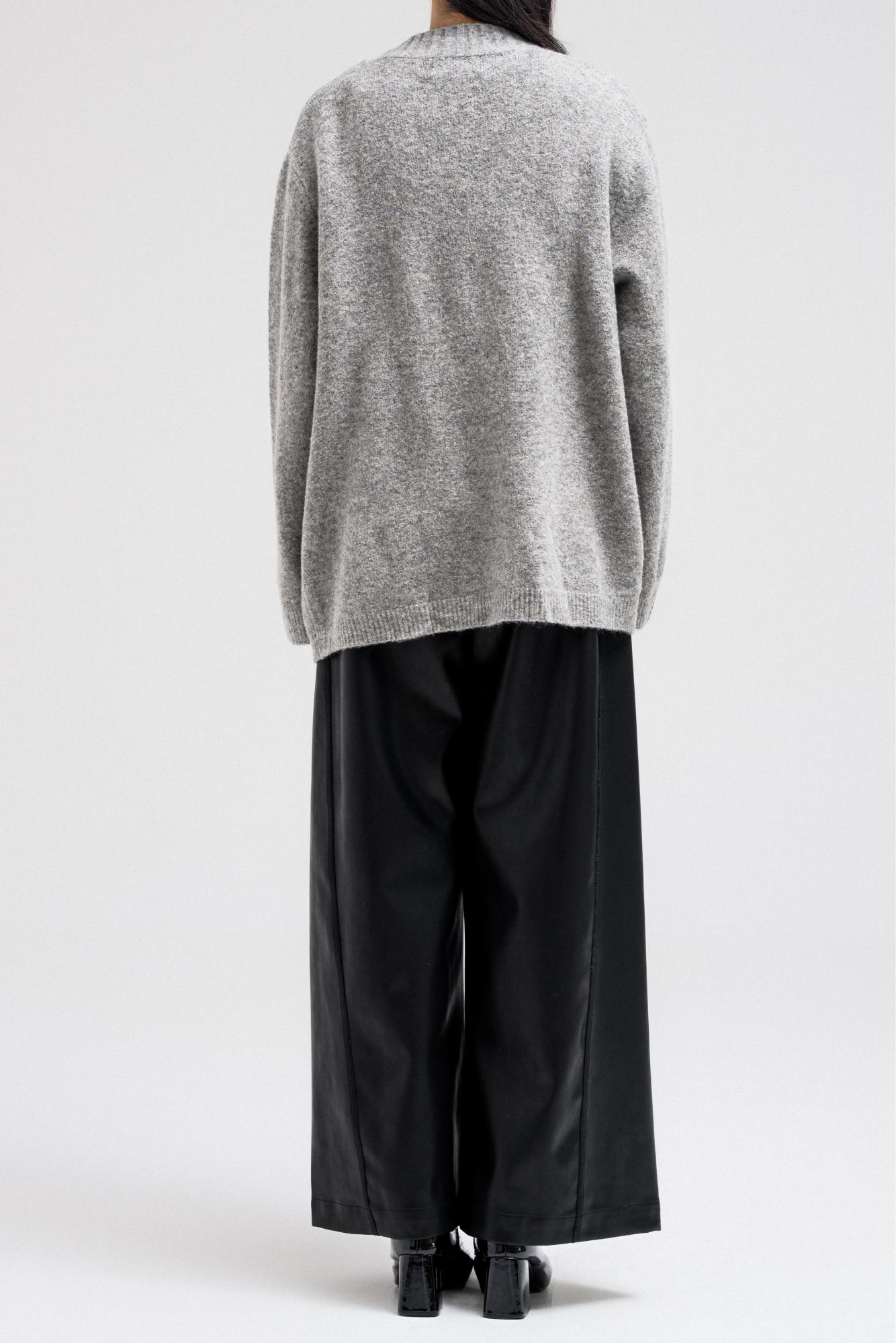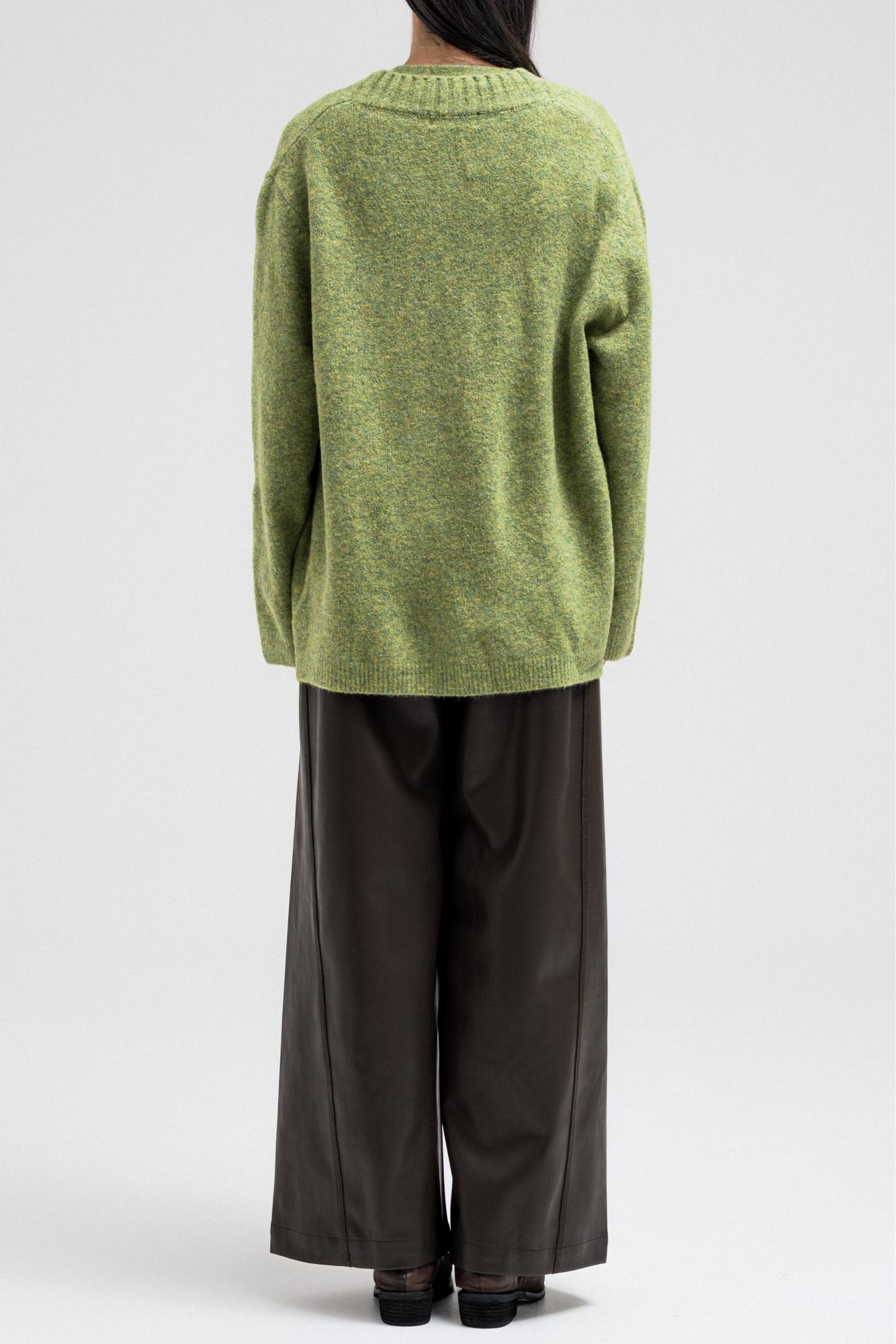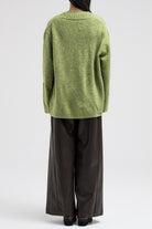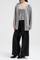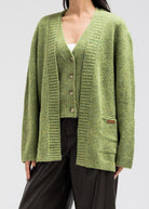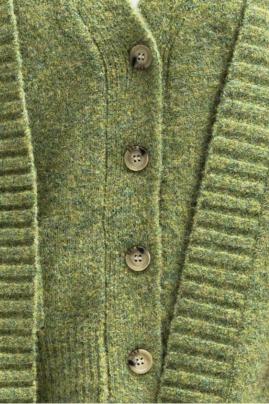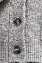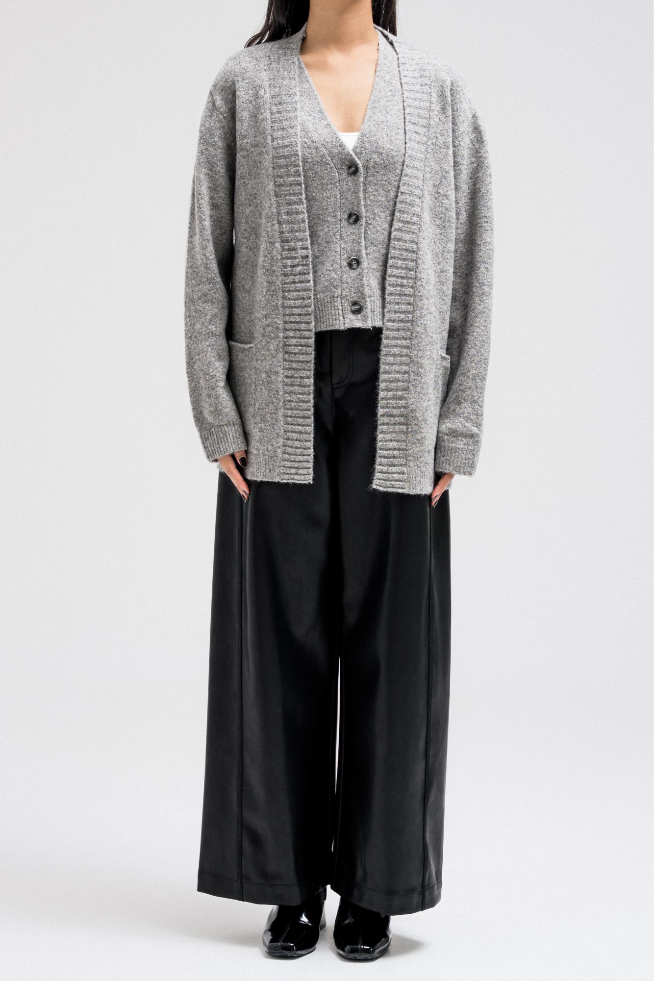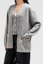 The inner vest comes with a clean V-neckline and front button closure, designed with small patch pockets for a soft, classic touch. The cardigan completes the look with a relaxed silhouette, ribbed edges, and front pockets.