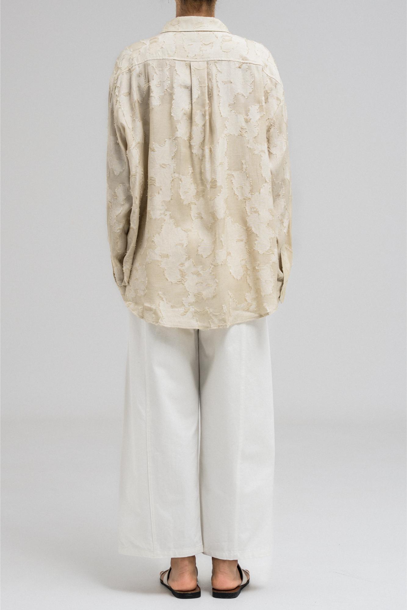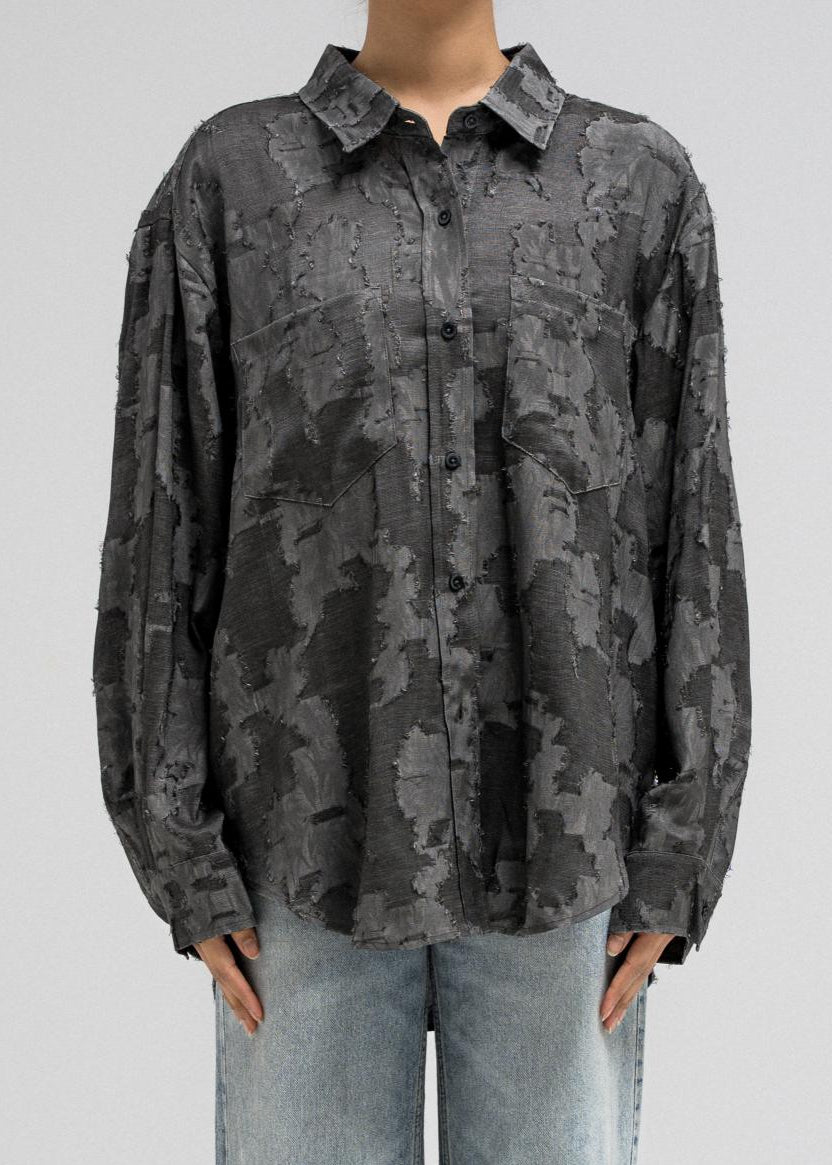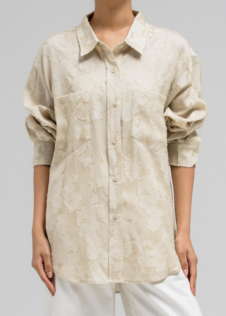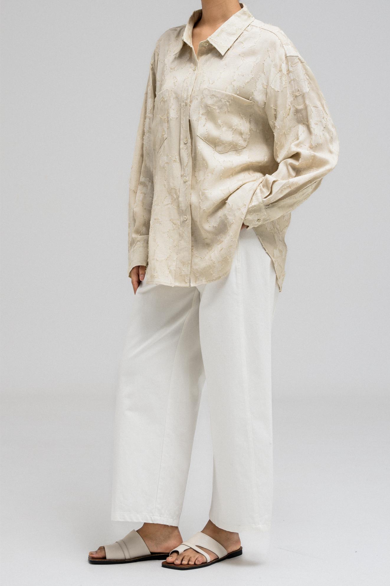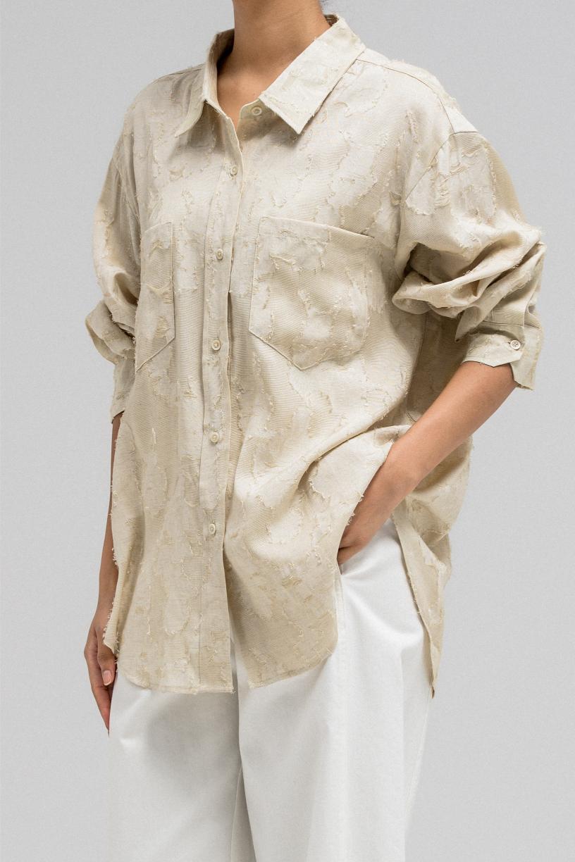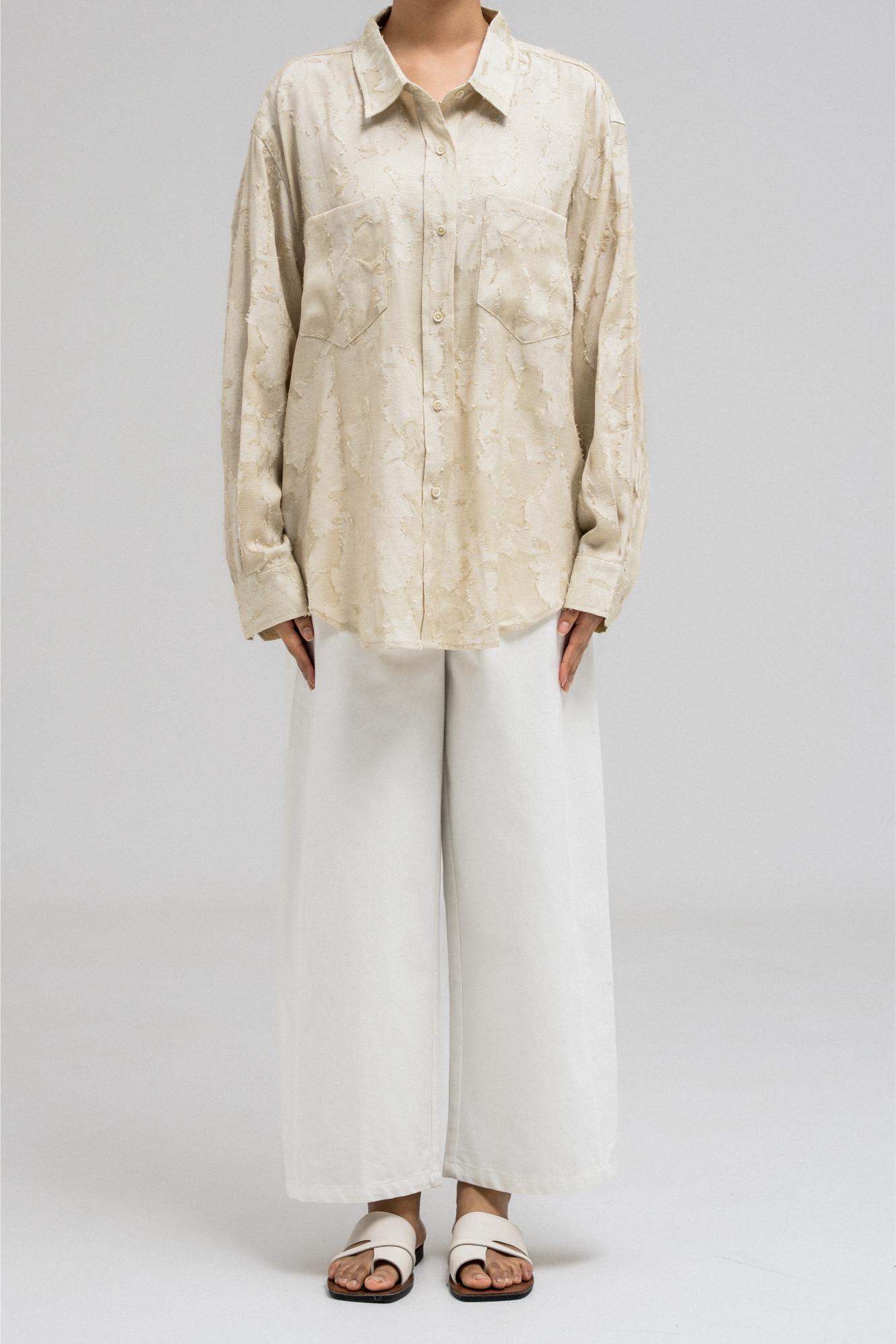 A lightweight classic button-down shirt featuring a soft collar and two chest pockets. The standout feature is its unique fabric design a blend of textured threadwork and subtle patch-like patterns that give it a soft, elevated finish.