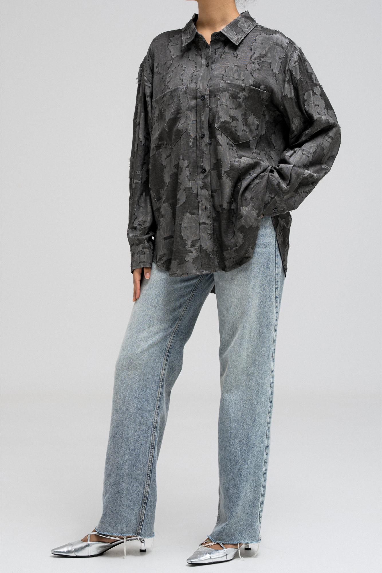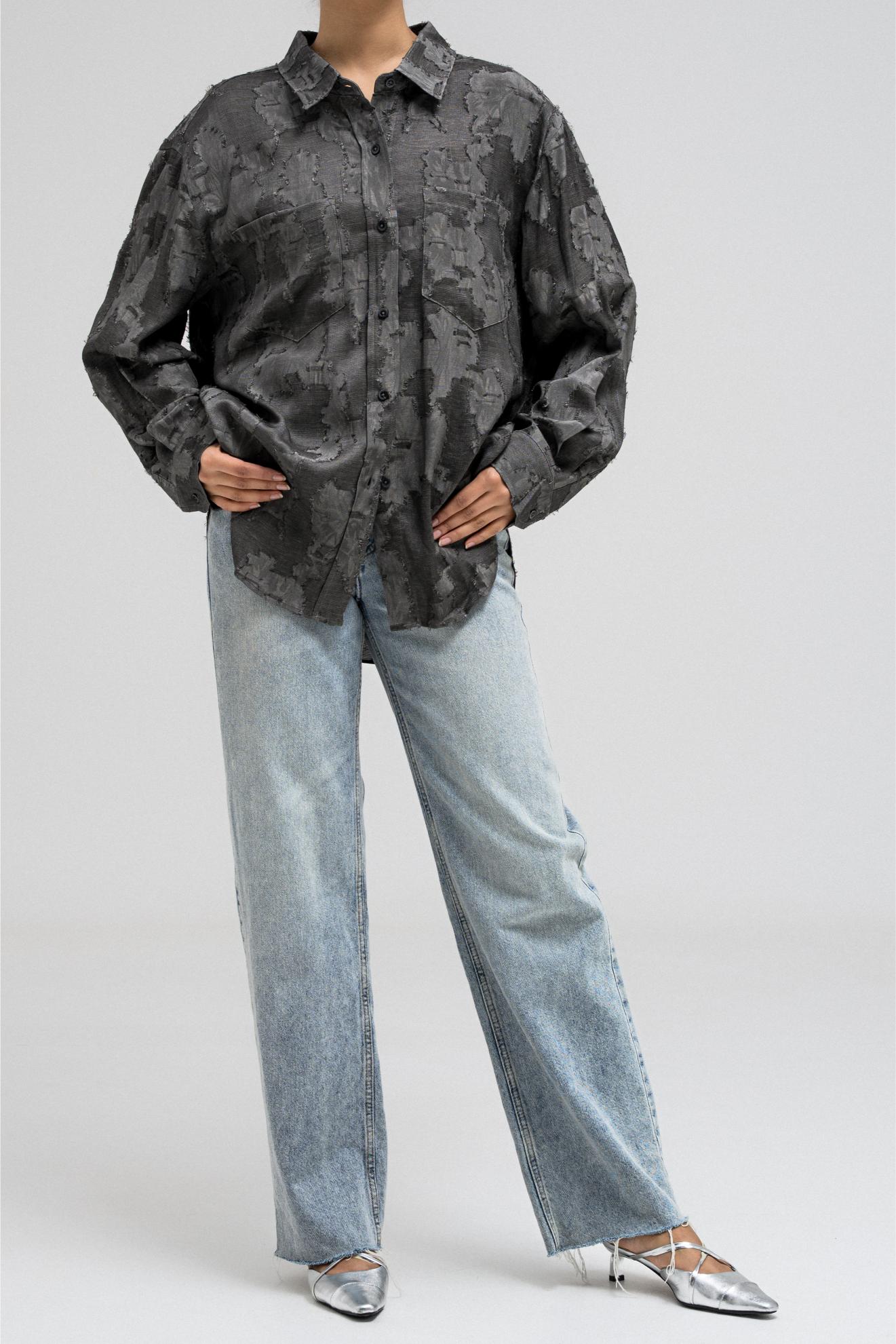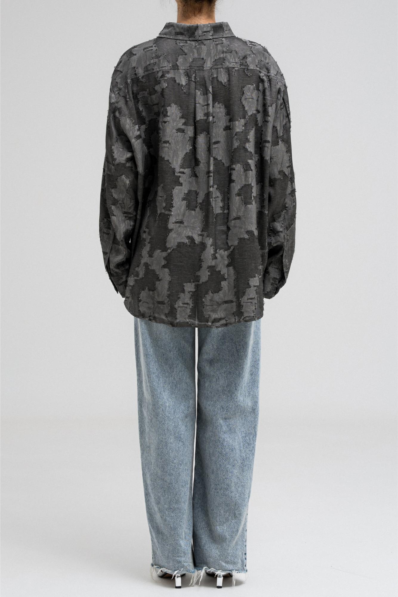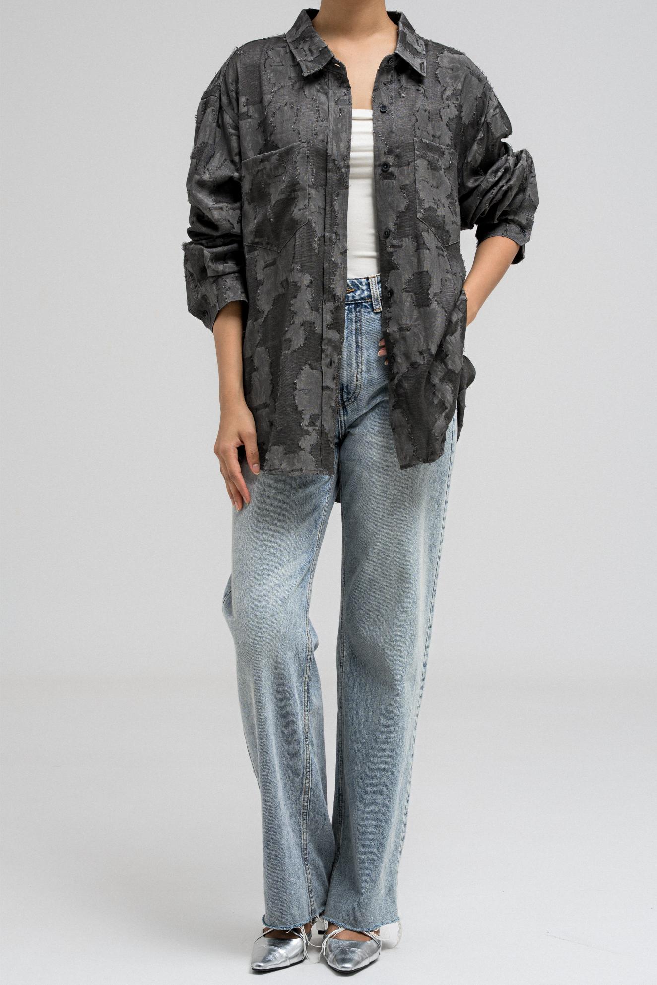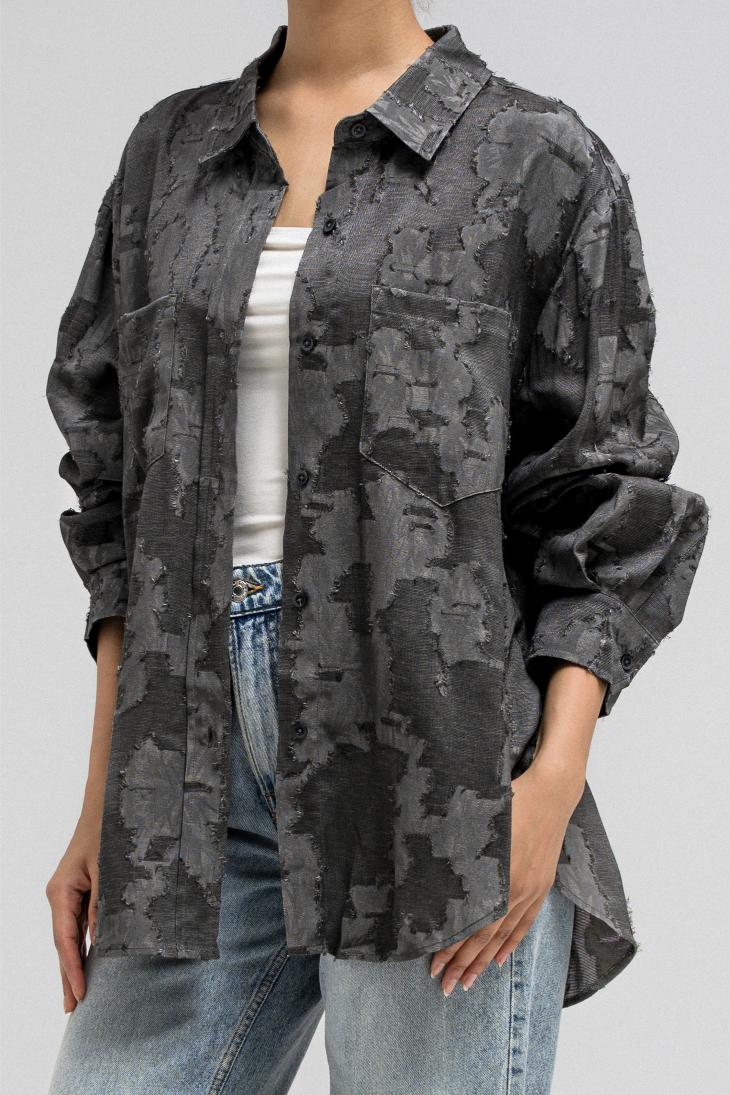 A lightweight classic button-down shirt featuring a soft collar and two chest pockets. The standout feature is its unique fabric design a blend of textured threadwork and subtle patch-like patterns that give it a soft, elevated finish.