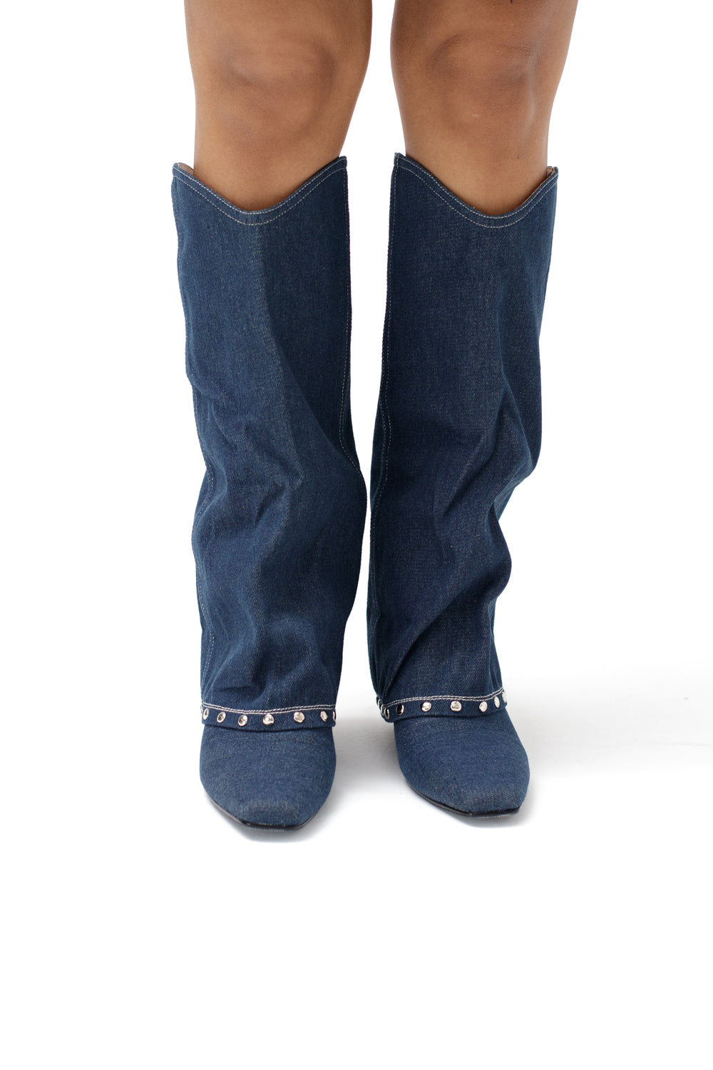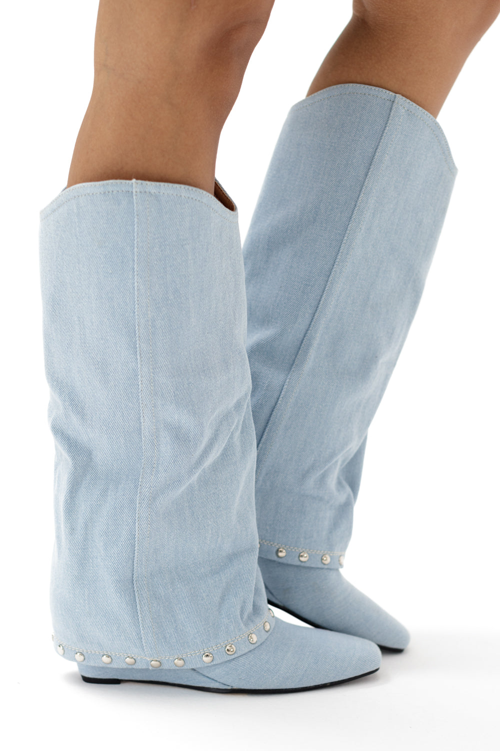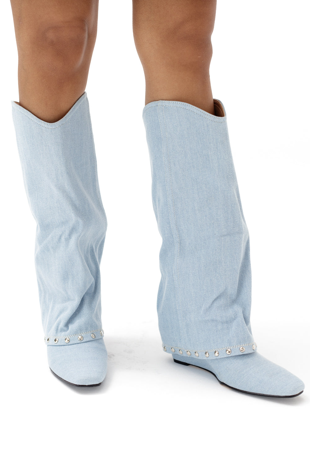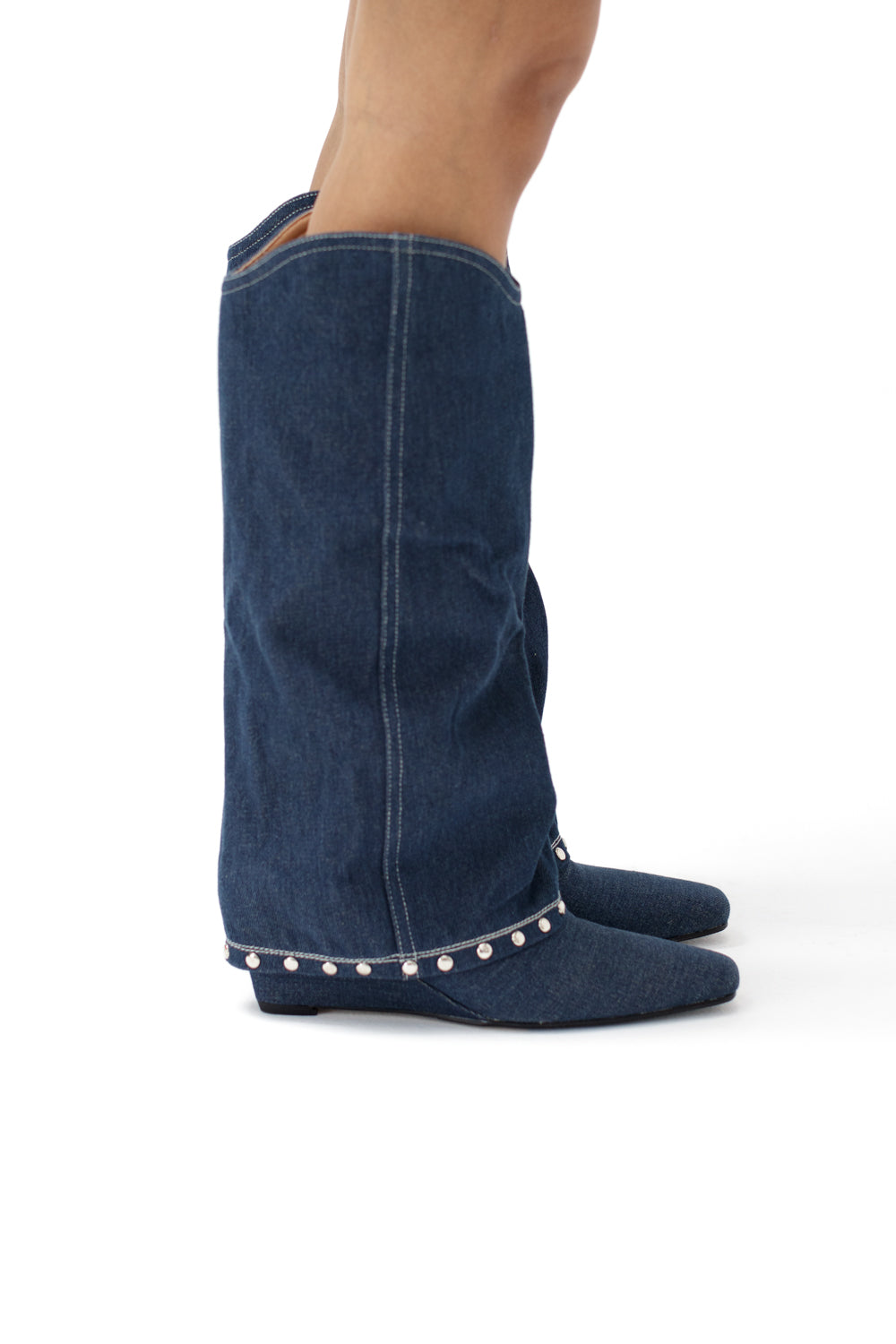 Denim knee length boots with metallic details