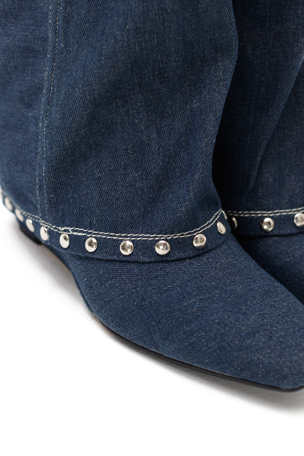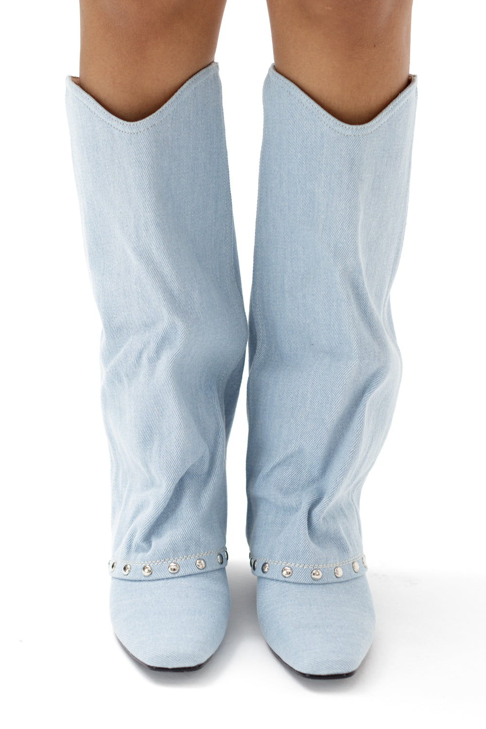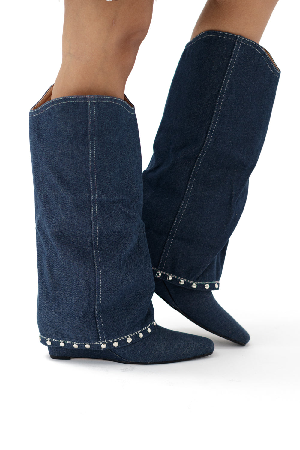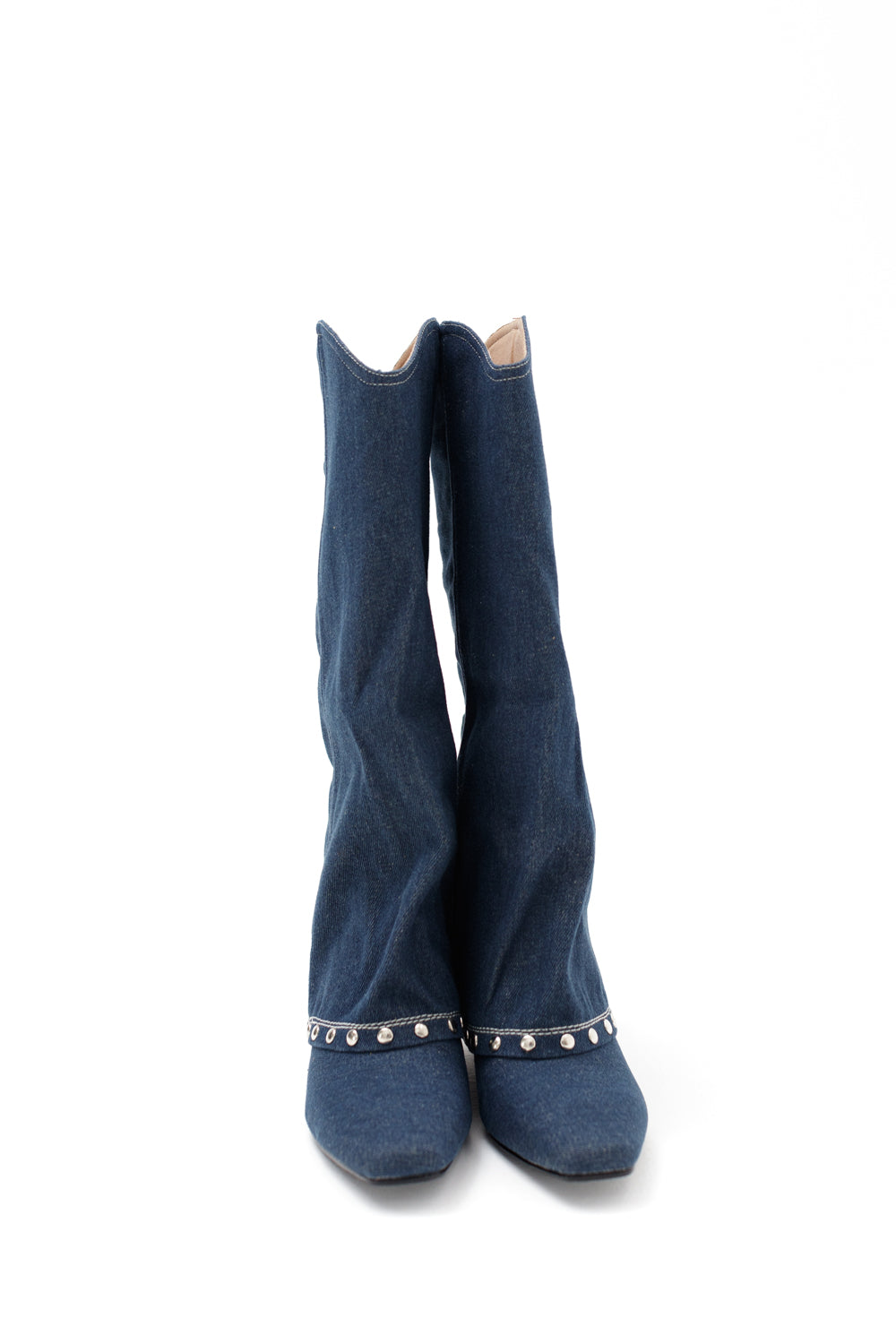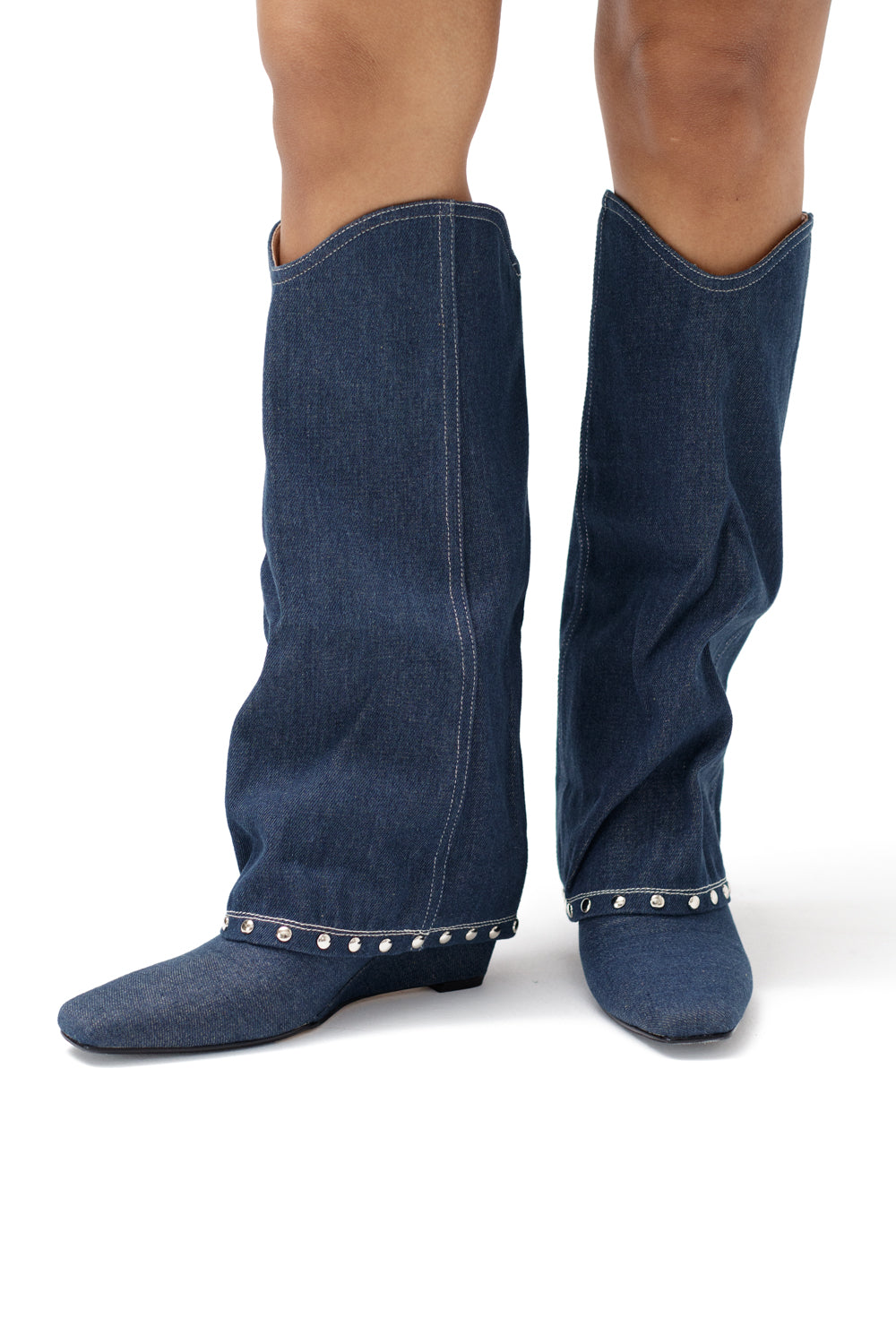 Denim knee length boots with metallic details