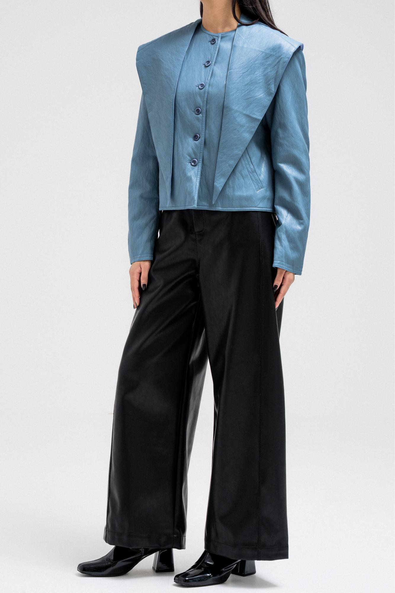 Cropped leather jacket designed with a clean, minimal silhouette and front button closure. Comes with a detachable wide collar that can be styled on or off the shoulders for two different looks. Features sleek side pockets and a round neckline when worn without the collar.