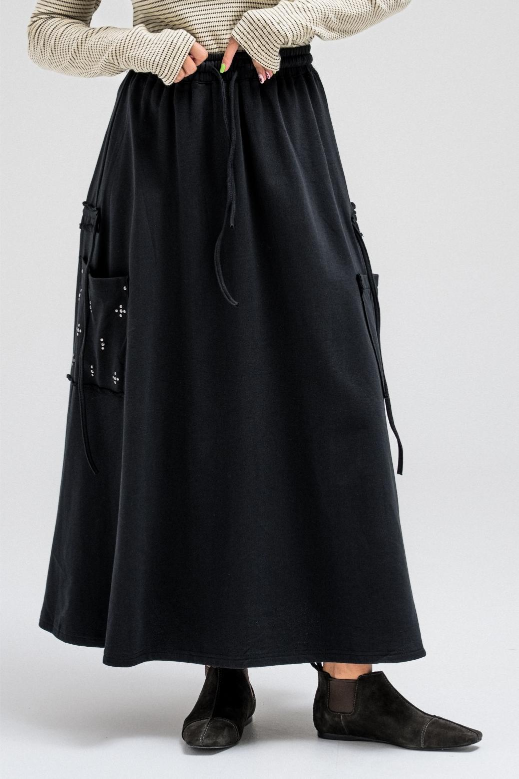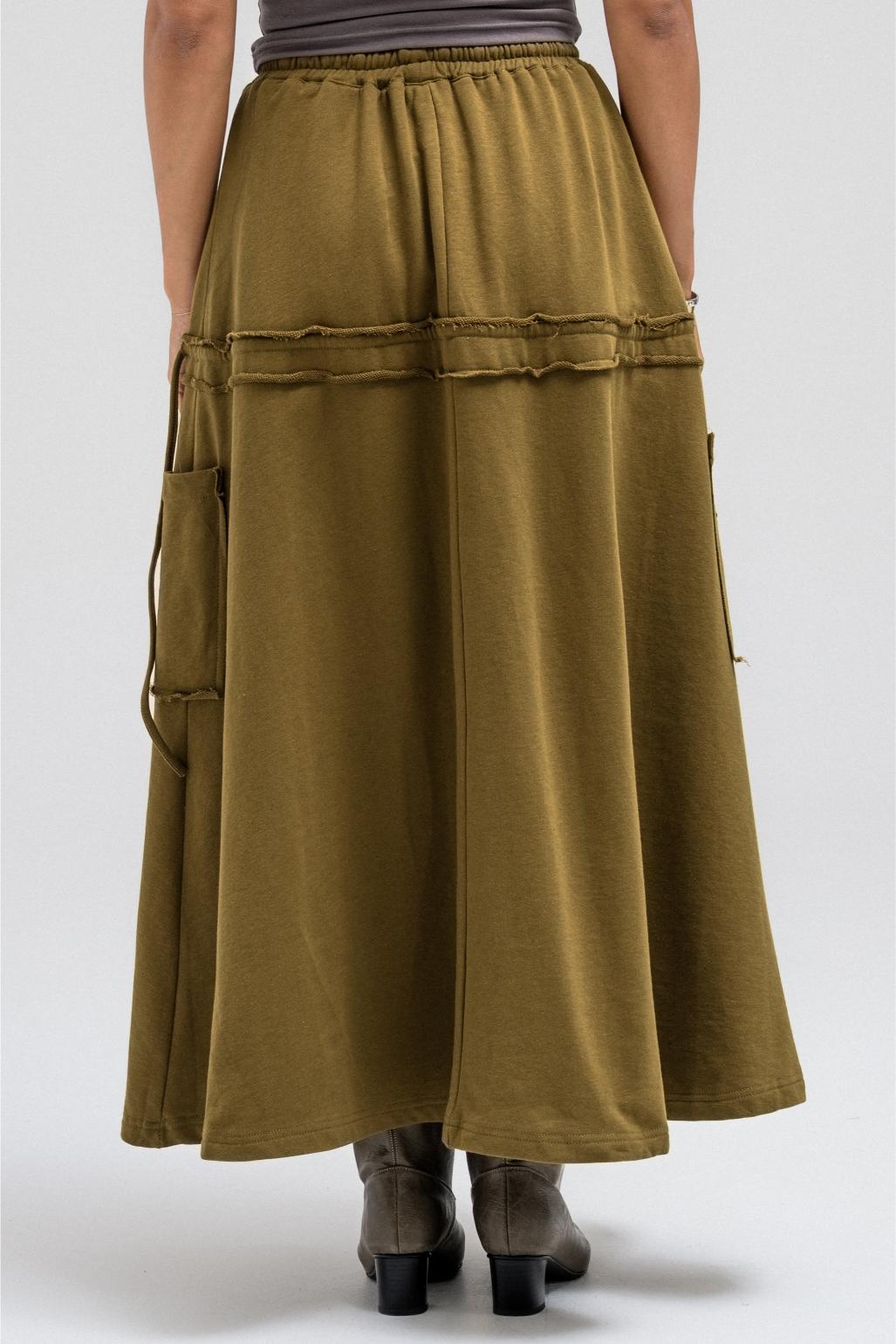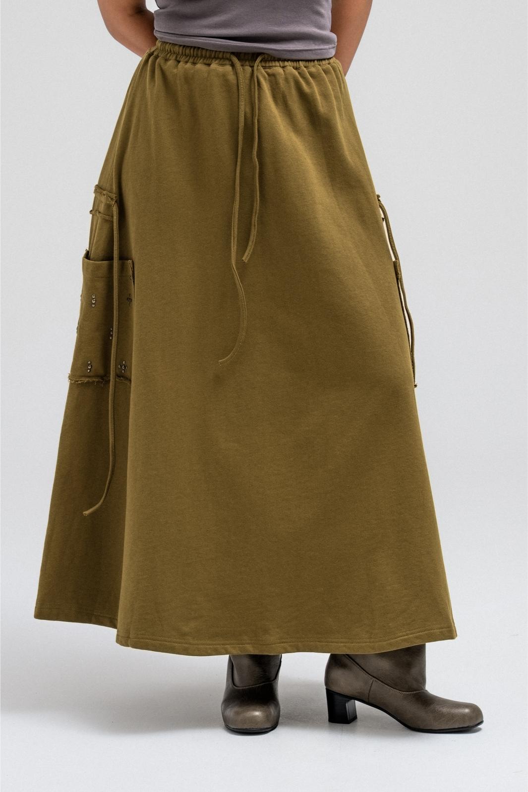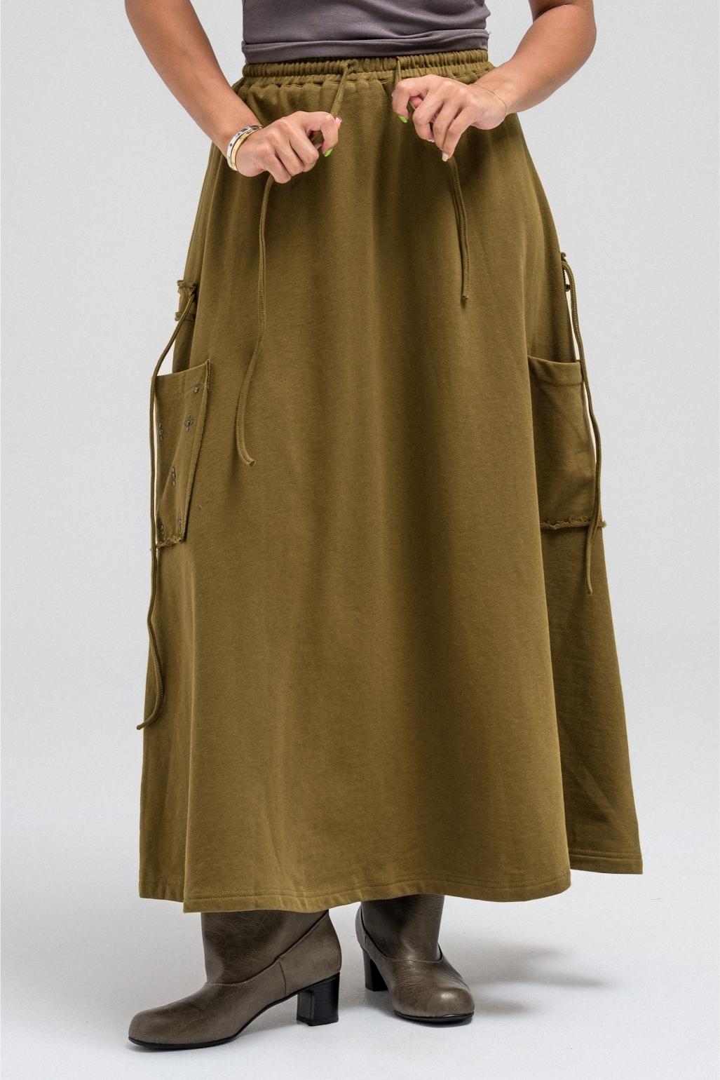 A relaxed-style skirt designed with an elastic waistband and adjustable drawstrings for a comfortable fit. It features functional side pockets that add a casual utility touch, making it both stylish and practical for everyday wear.