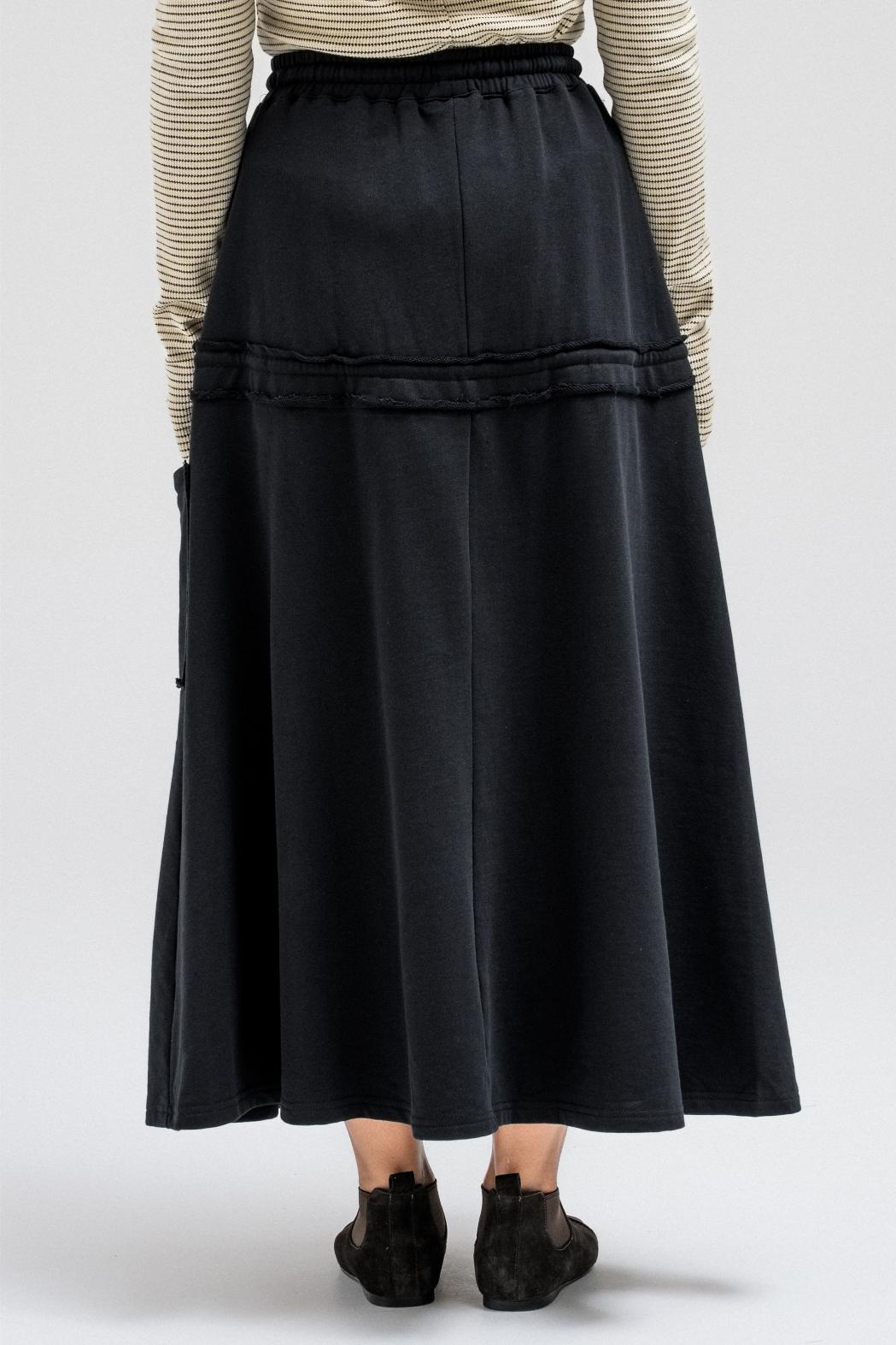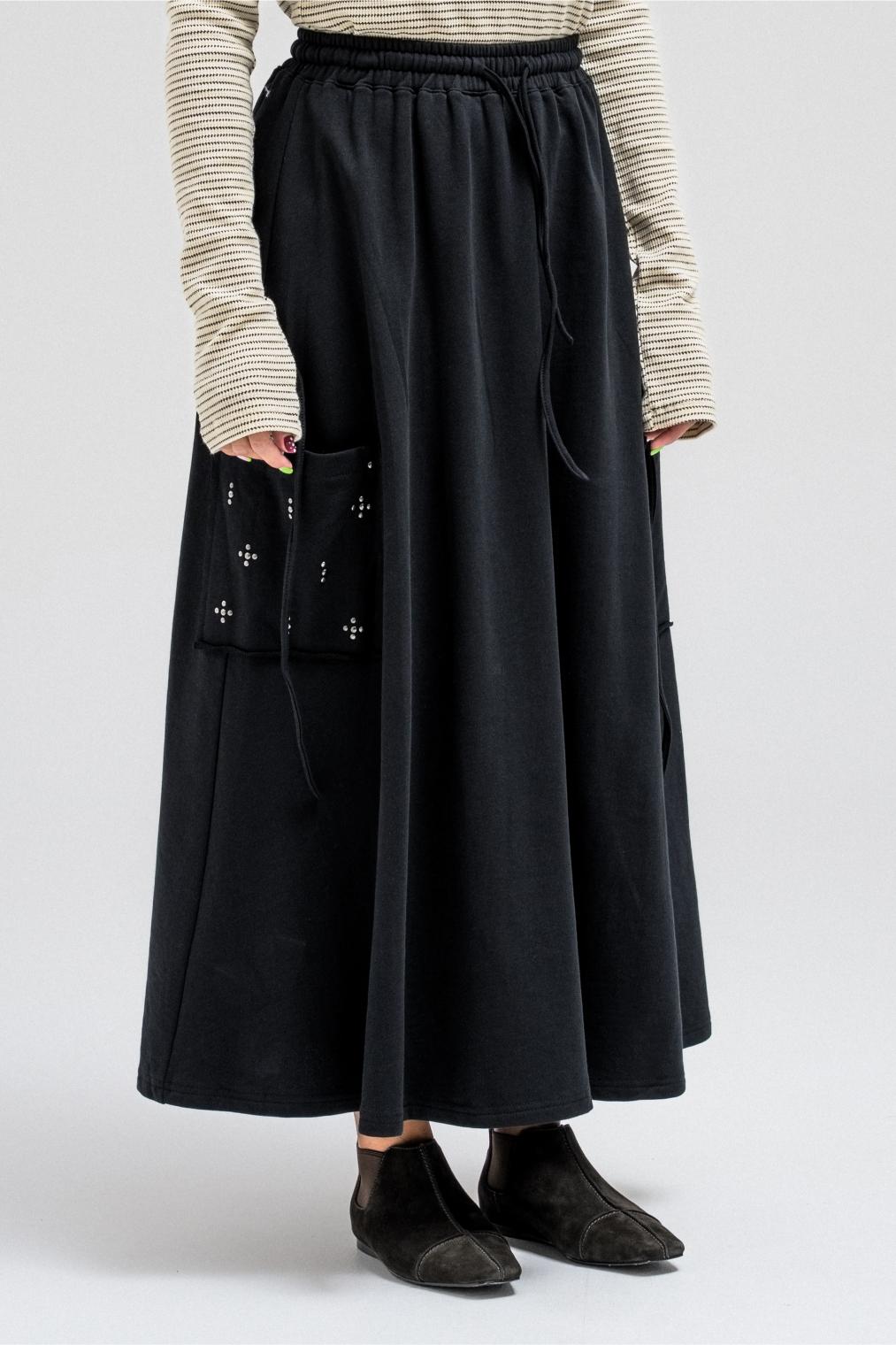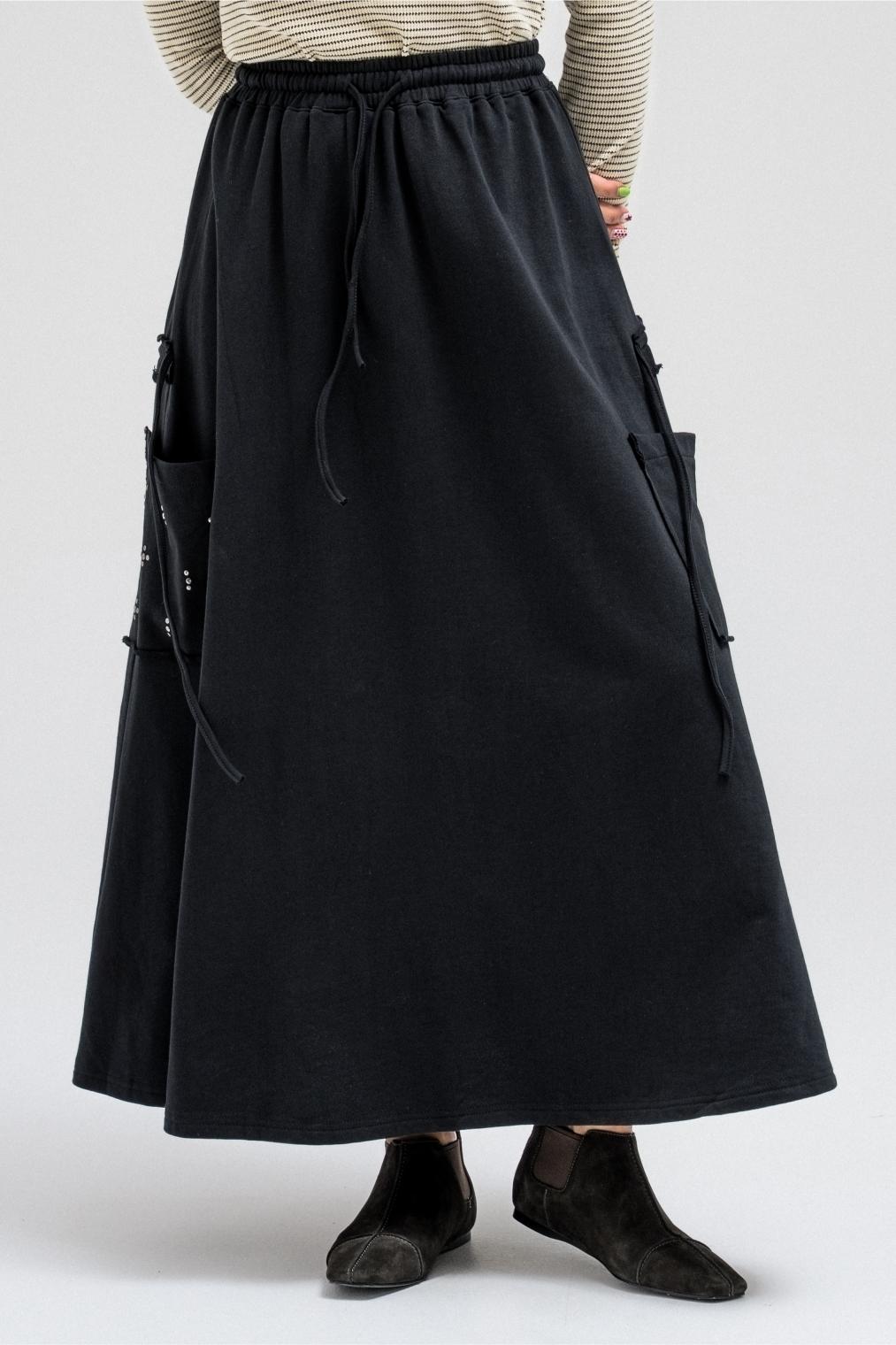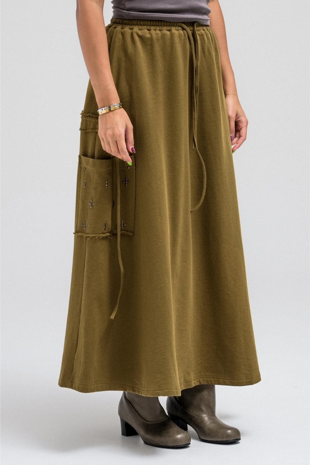 A relaxed-style skirt designed with an elastic waistband and adjustable drawstrings for a comfortable fit. It features functional side pockets that add a casual utility touch, making it both stylish and practical for everyday wear.