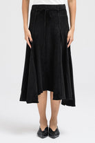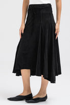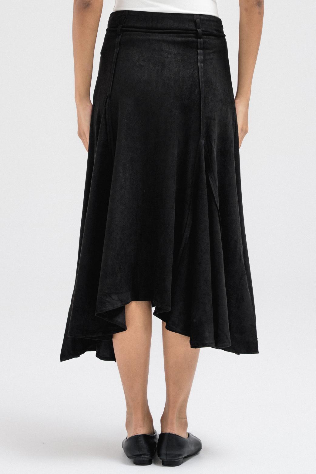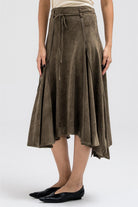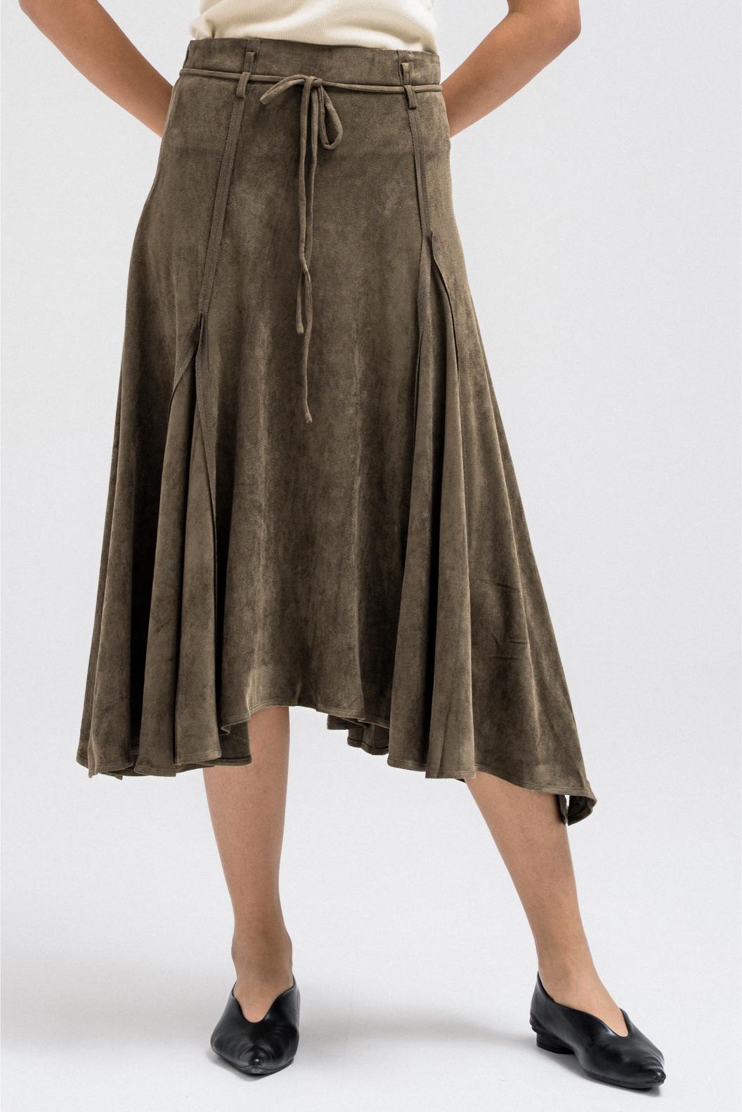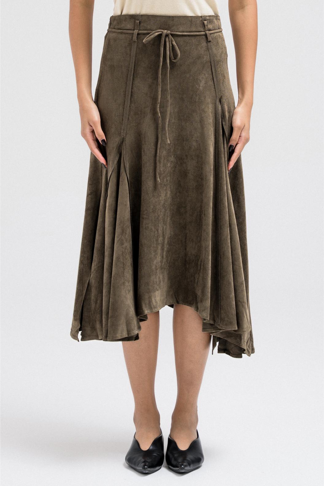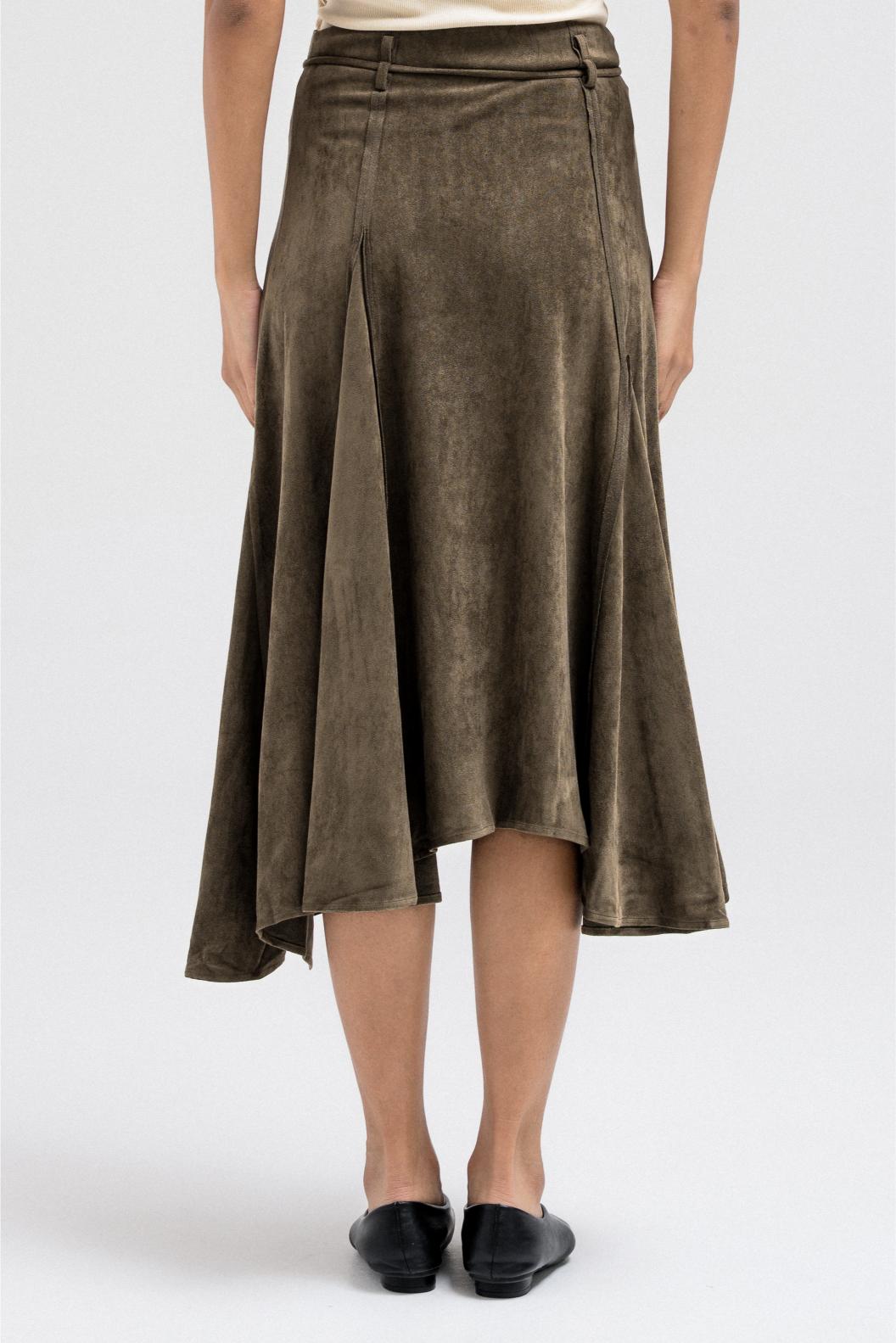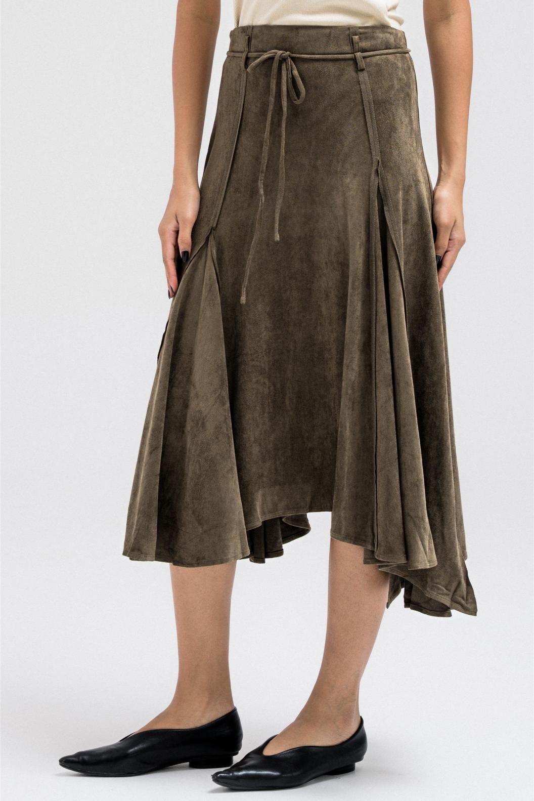This is a women’s midi skirt made from a soft, suede-like fabric. It features an asymmetrical hemline that creates a flowing, draped silhouette. The skirt has stitched panel details along the front and sides, adding structure to the design. It includes a thin waist tie with belt loops for an adjustable fit. The color is an olive/brown earthy tone, giving it a natural and elegant look. The skirt pairs well with both casual and dressy outfits.