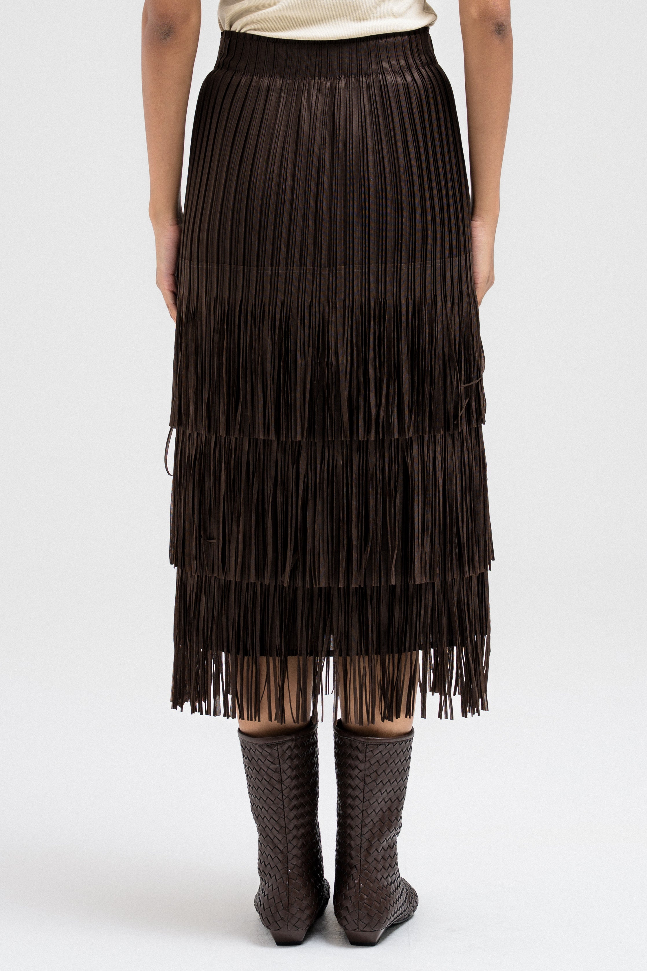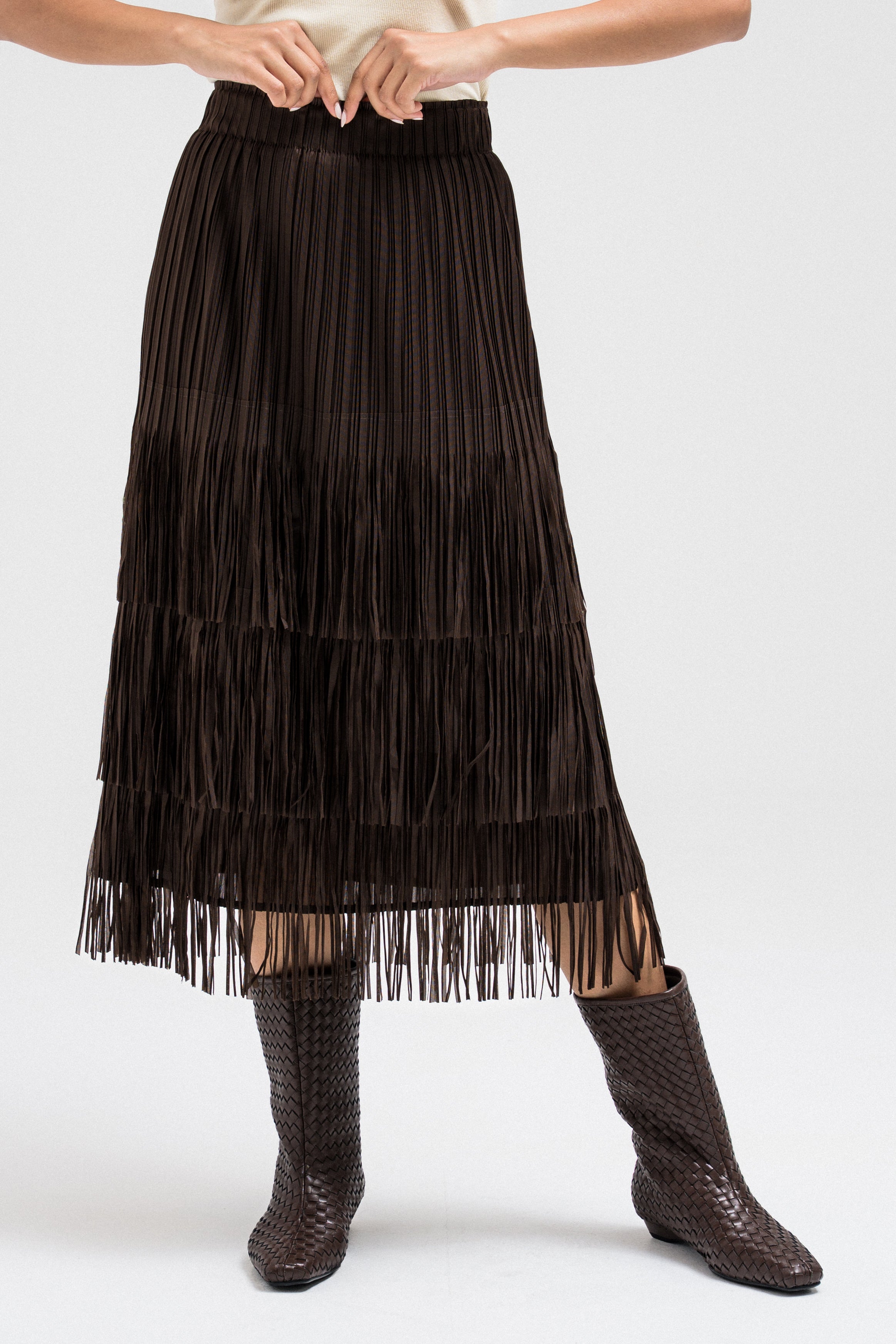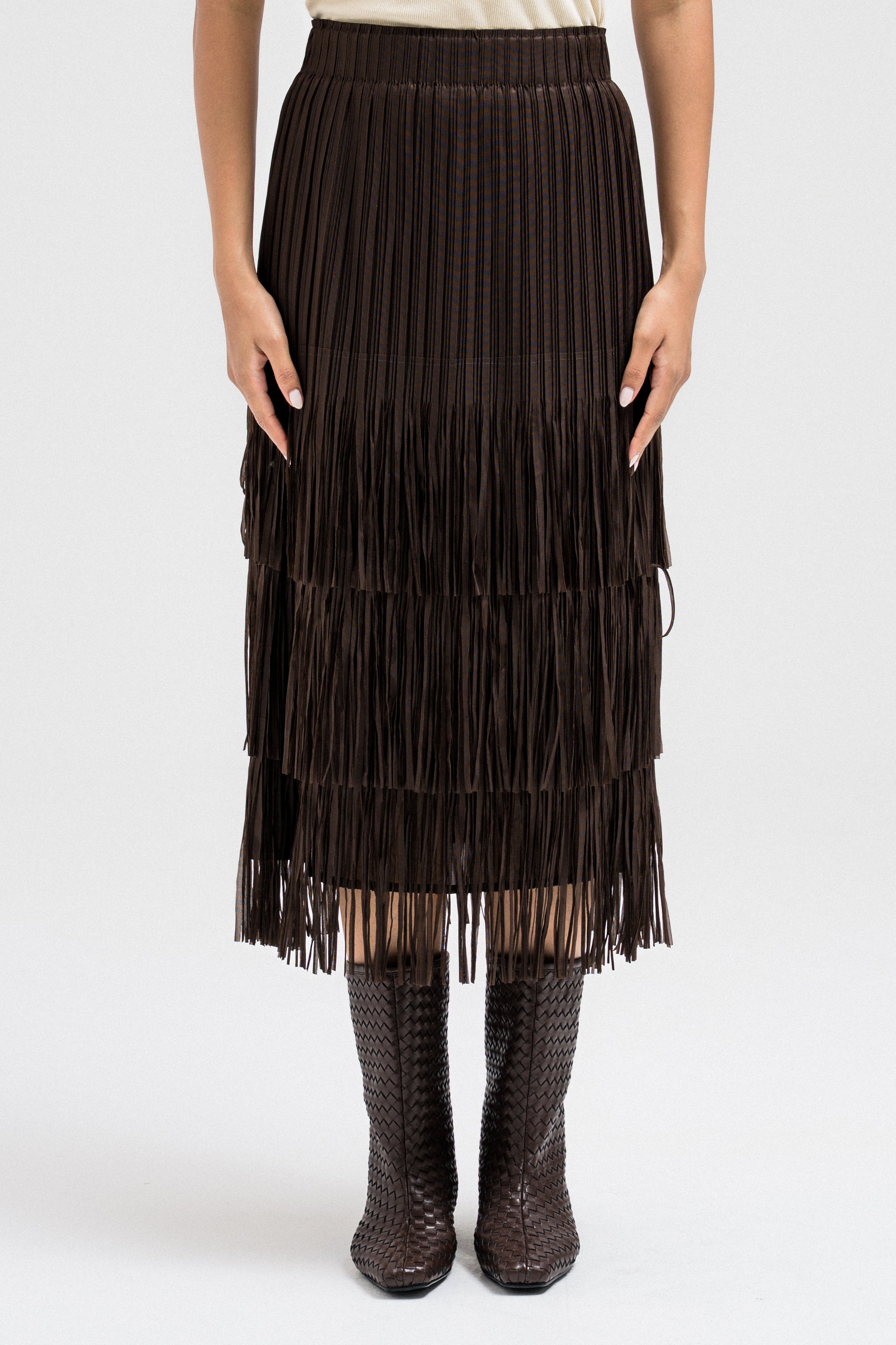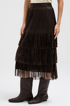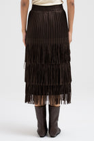A statement piece featuring layered fringe ruffles that create dynamic movement with every step. The textured design adds depth and flow, giving it a chic yet playful edge. Designed with an elastic waistband for a comfortable and flexible fit.