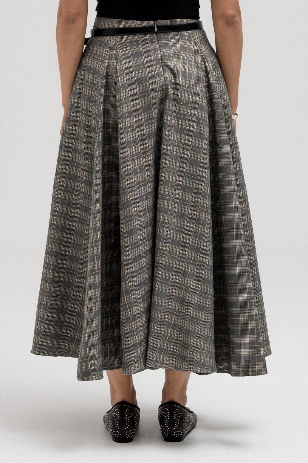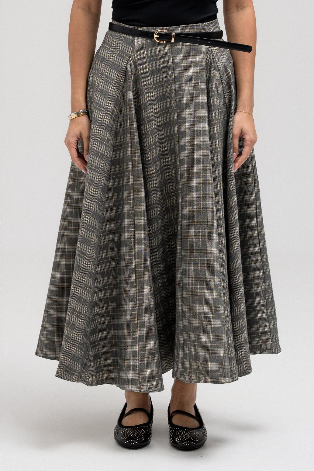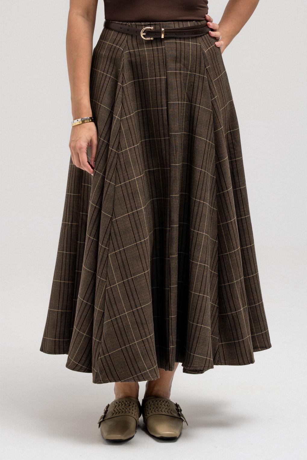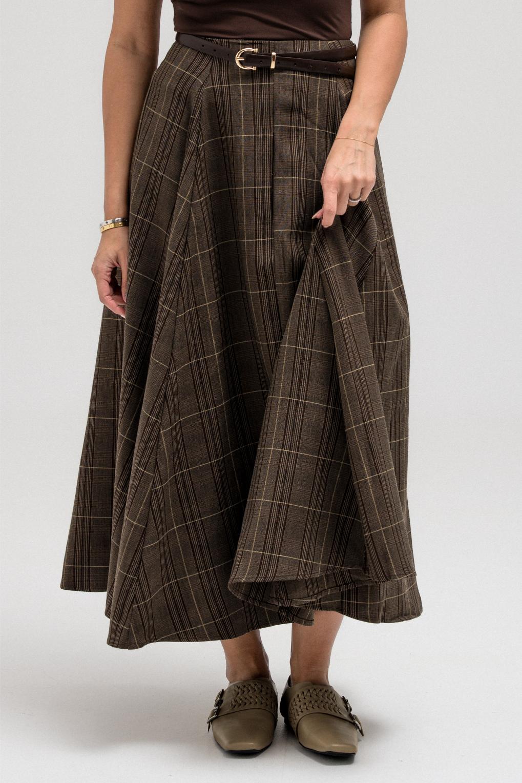 This flowy plaid skirt is designed with graceful movement and a flattering silhouette. It comes with a matching belt to cinch the waist and a back zipper closure for a clean finish. An easy piece to dress up or down while adding pattern and elegance to your outfit.