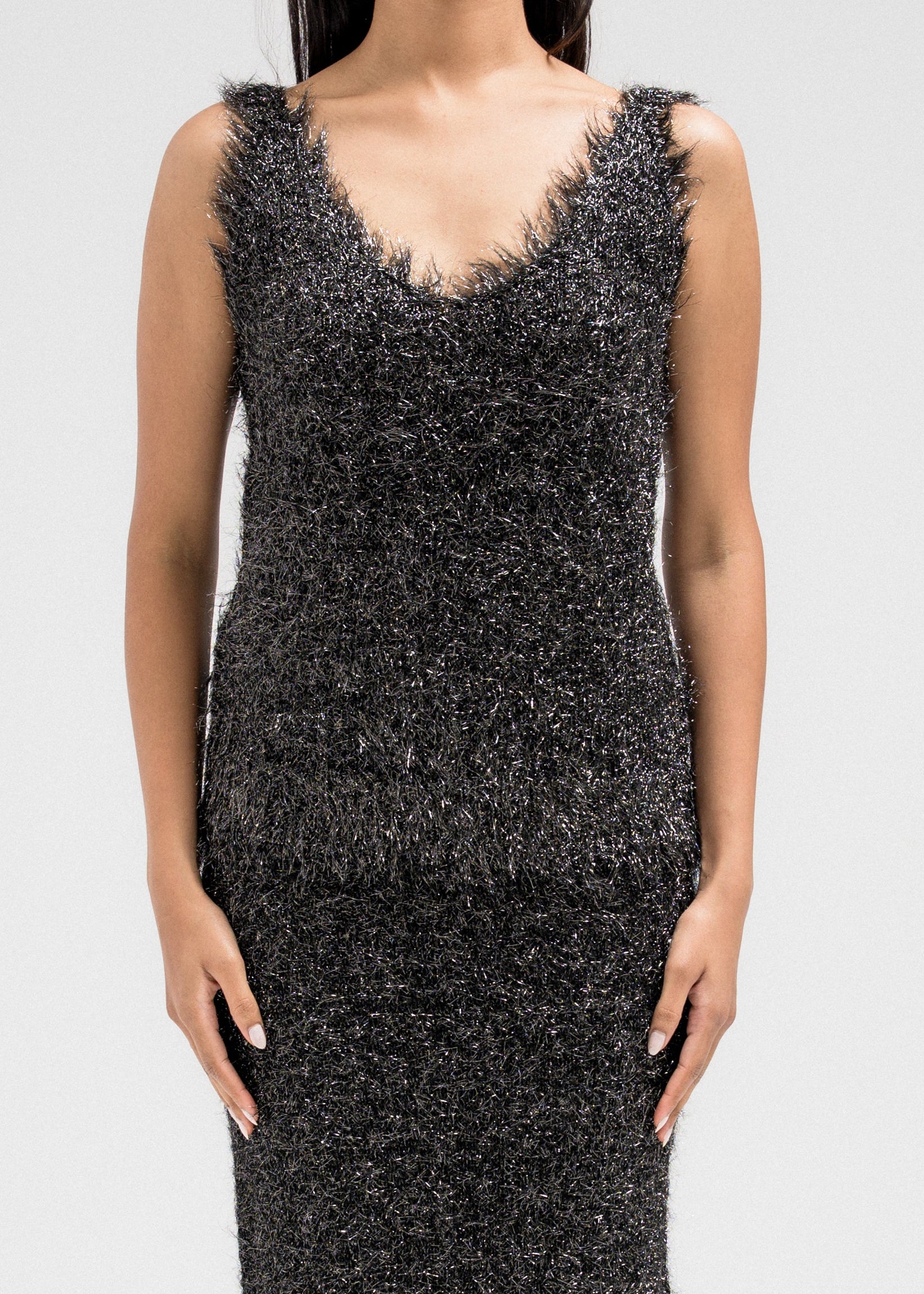 Soft, fuzzy knit sleeveless top designed with a flattering V-neckline. Can be paired with the matching skirt for a chic coordinated look.