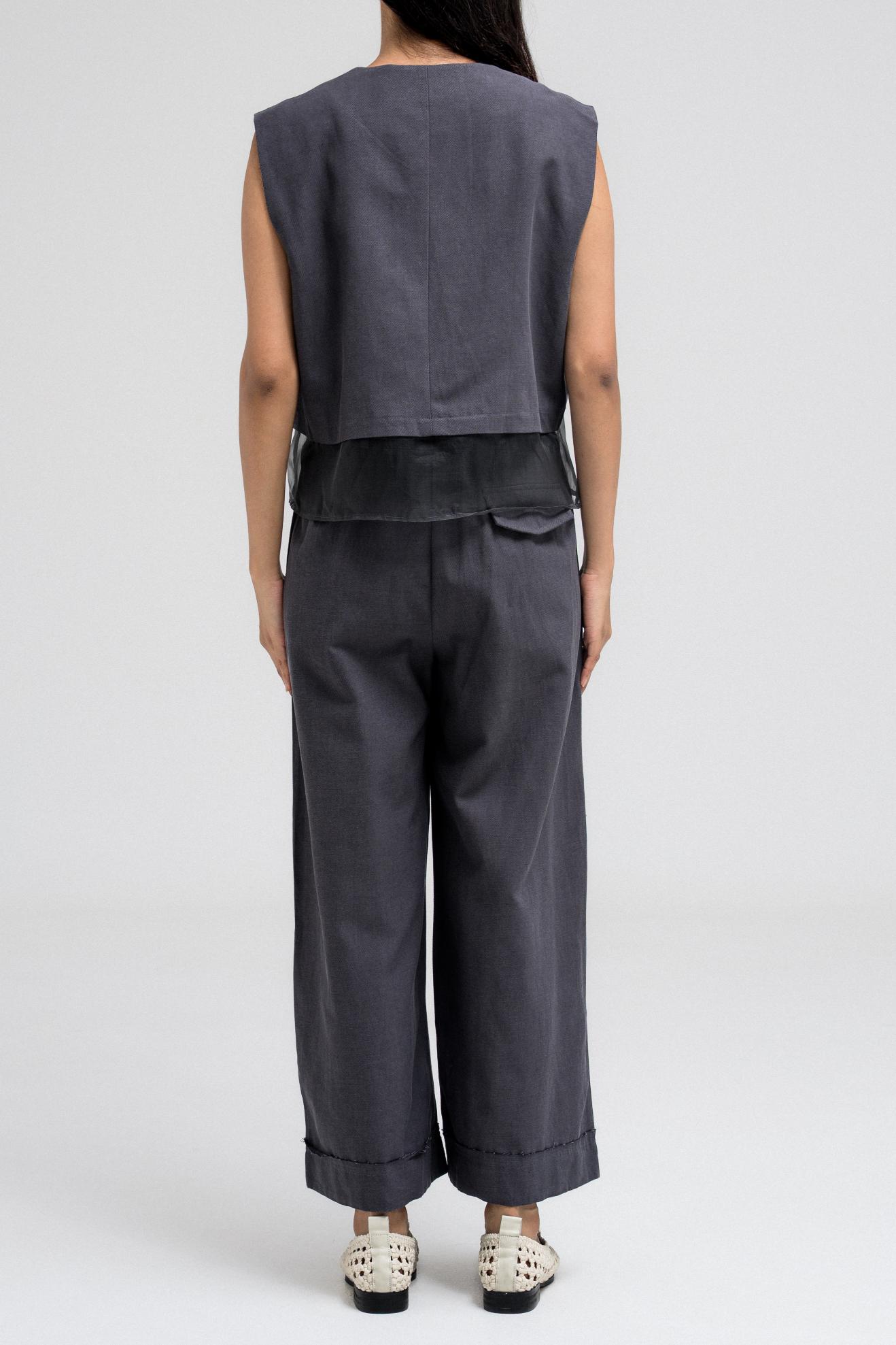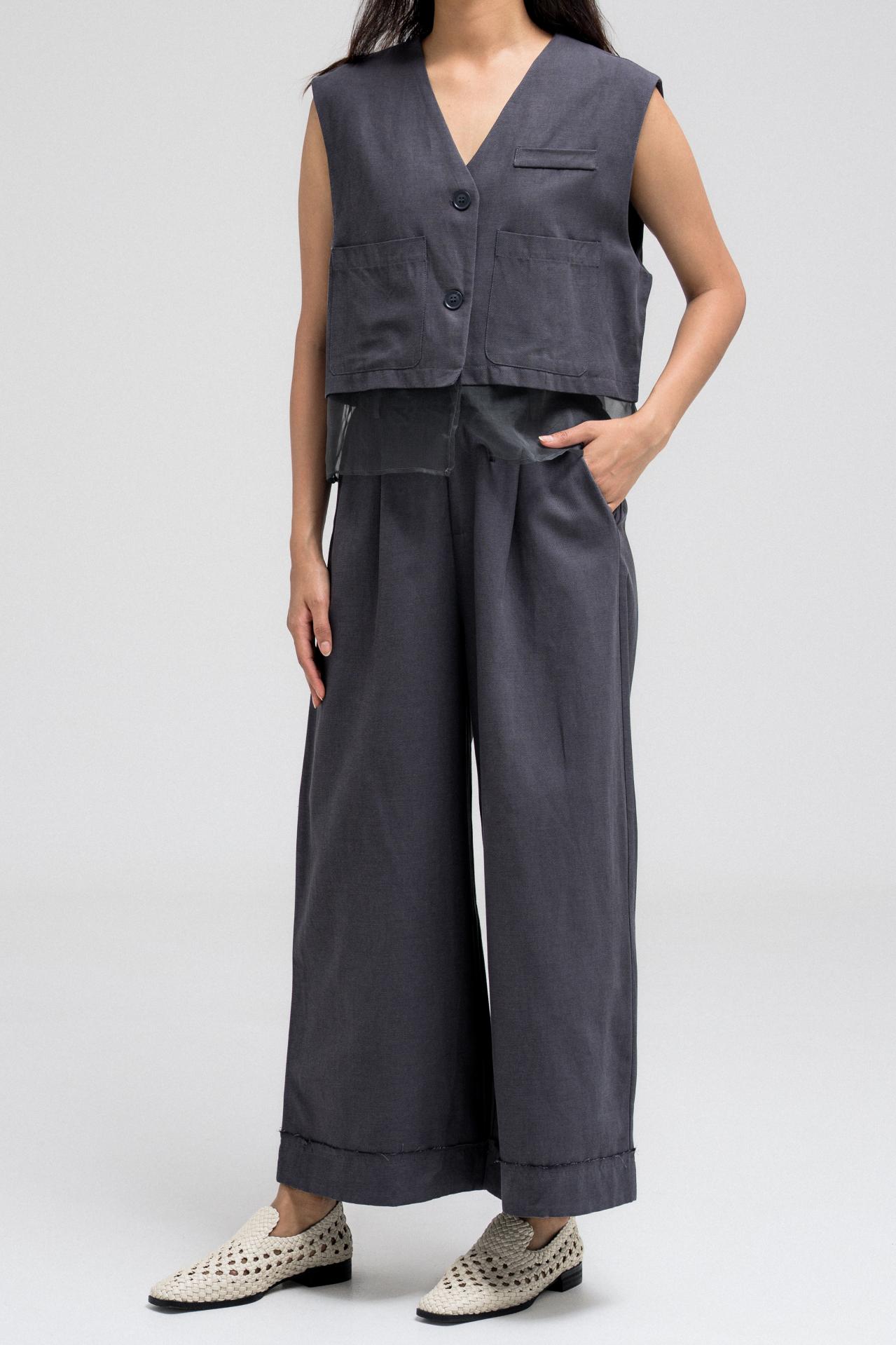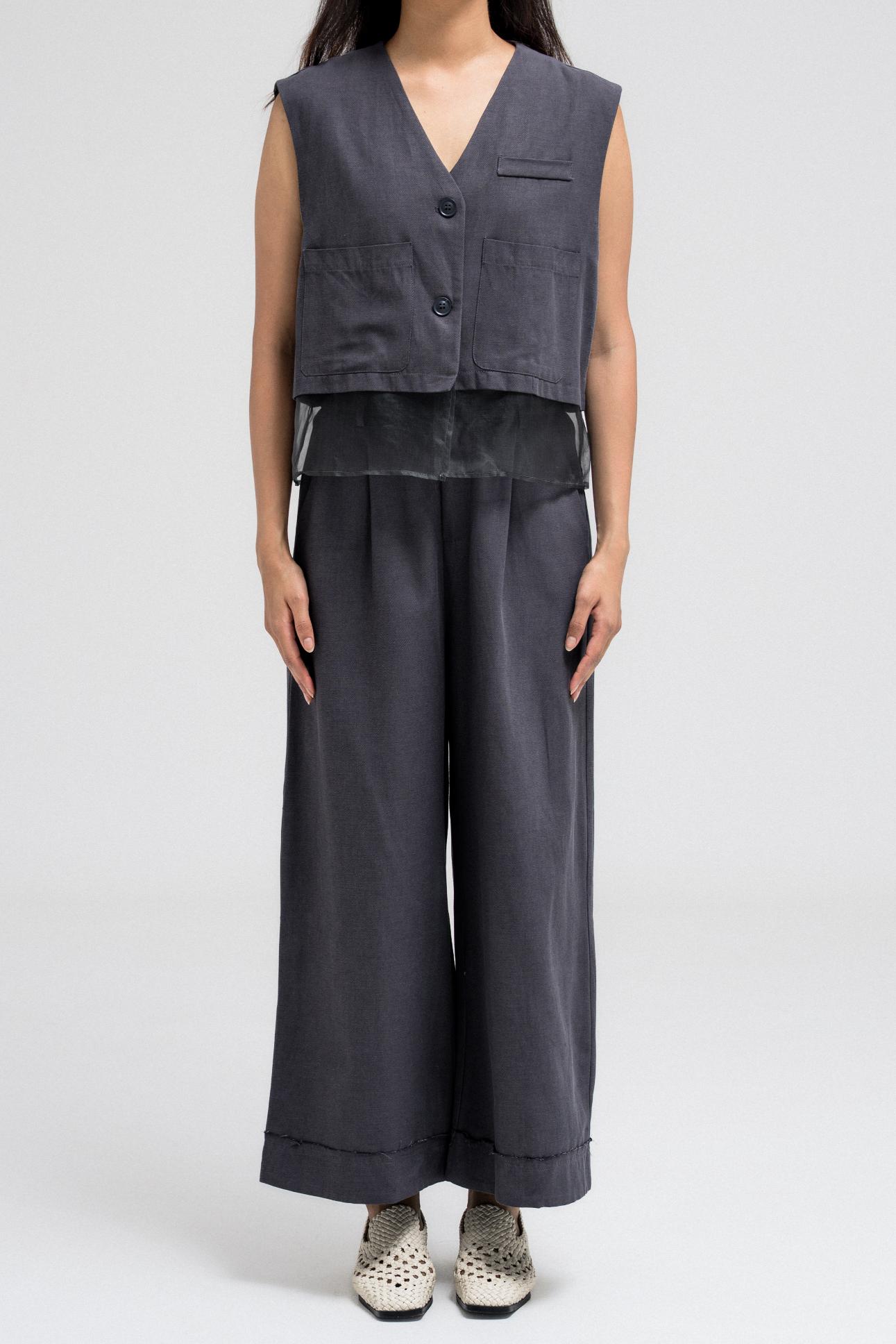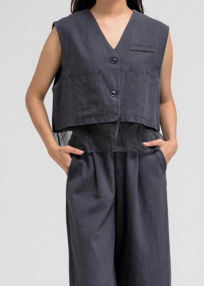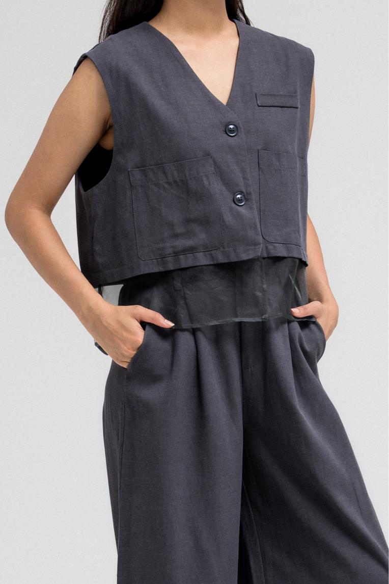 This sleeveless vest features a structured design with two functional front pockets. It closes with two buttons at the front and has a unique detail at the hem a sheer, lightweight mesh fabric that adds a modern, layered effect. Perfectly paired with the matching wide-leg pants for a sleek, coordinated look..